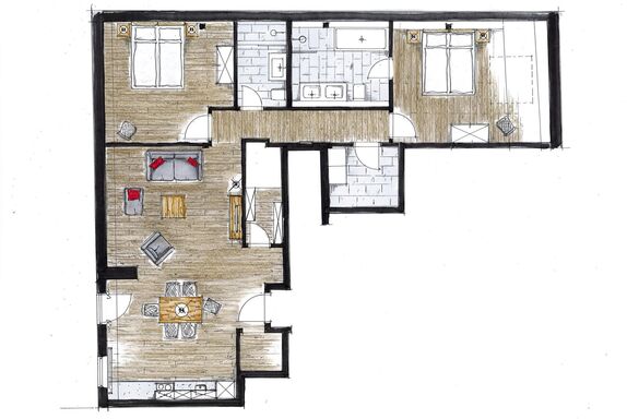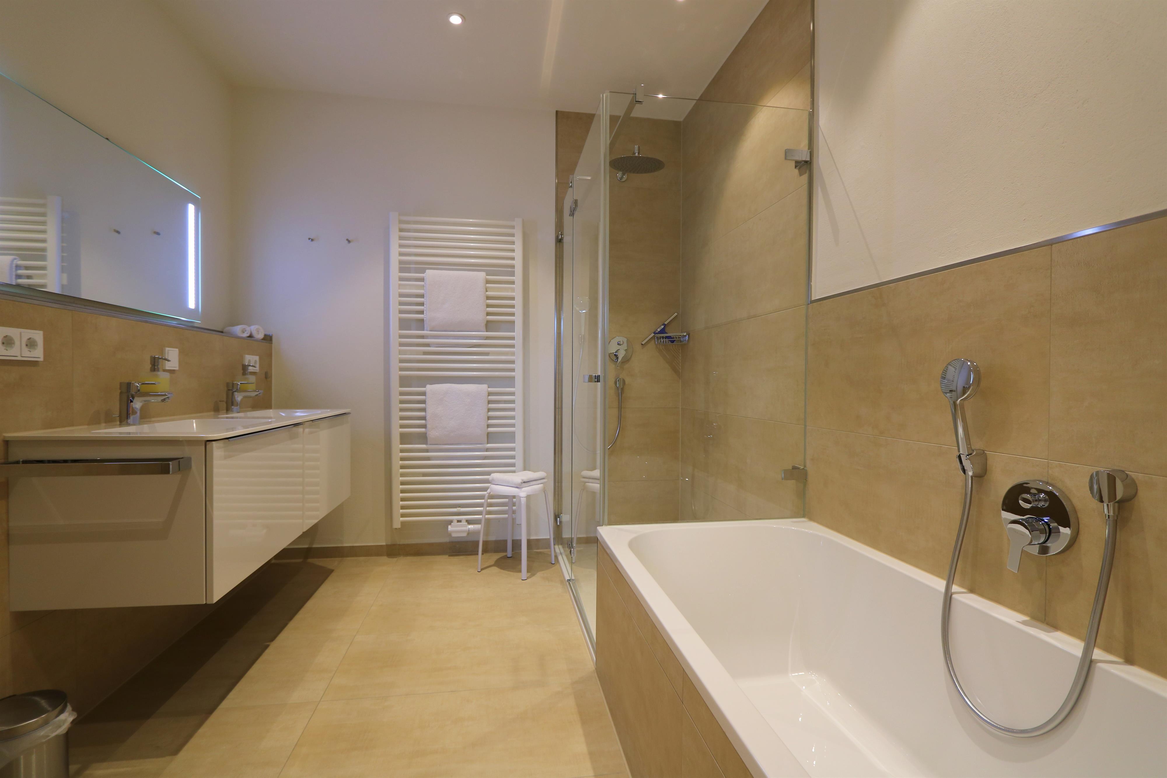 Diese Ferienwohnung für 2-6 Personen verfügt über ein zentral in der Wohnung gelegenen Wohnbereich mit integrierter Küche mit Essbereich und zwei separaten Schlafzimmern. Sie verfügt über eine Küche mit Kühlschrank, Spülmaschine, Ceran-Herd, Wasserkocher, Toaster und Kaffeemaschine sowie zwei Bädern mit Dusche und WC zudem im Hauptbad über eine Badewanne. Vom Küchenbereich gelangen Sie auf den Balkon.