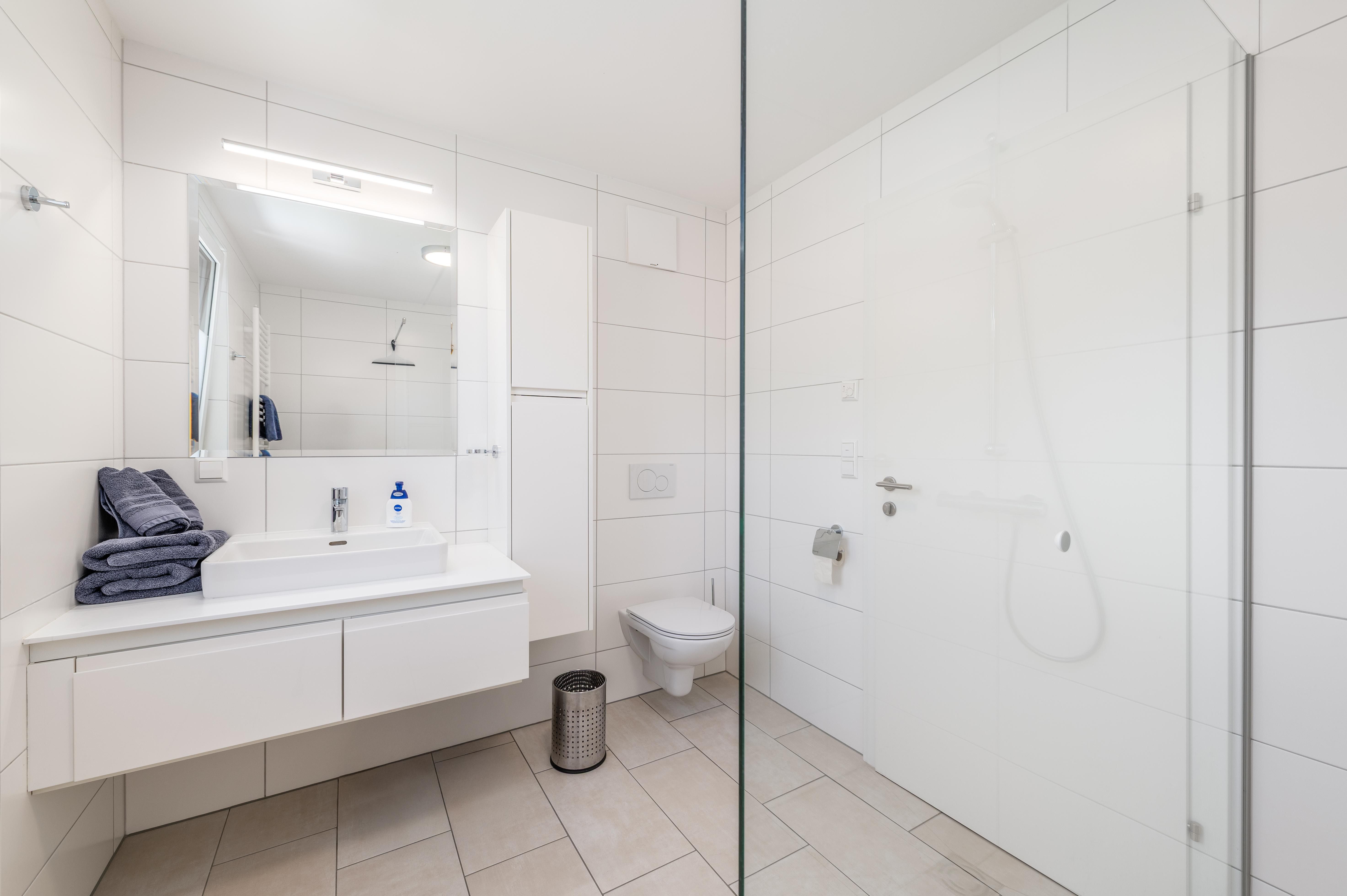 Das Bad ist ausgestattet mit einer großzügigen Dusche und einem Waschbecken. Handtücher und Bettwäsche stehen zur Verfügung.