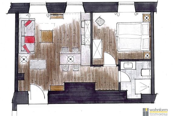 Diese Ferienwohnung für 2-4 Personen verfügt über ein zentral in der Wohnung gelegenen Wohnbereich mit integrierter Küche mit Essbereich und einem separaten Schlafzimmer. Sie verfügt über eine Küche mit Kühlschrank, Spülmaschine, Ceran-Herd, Wasserkocher, Toaster und Kaffeemaschine sowie ein Bad mit Dusche und WC.
