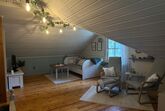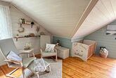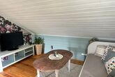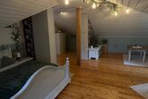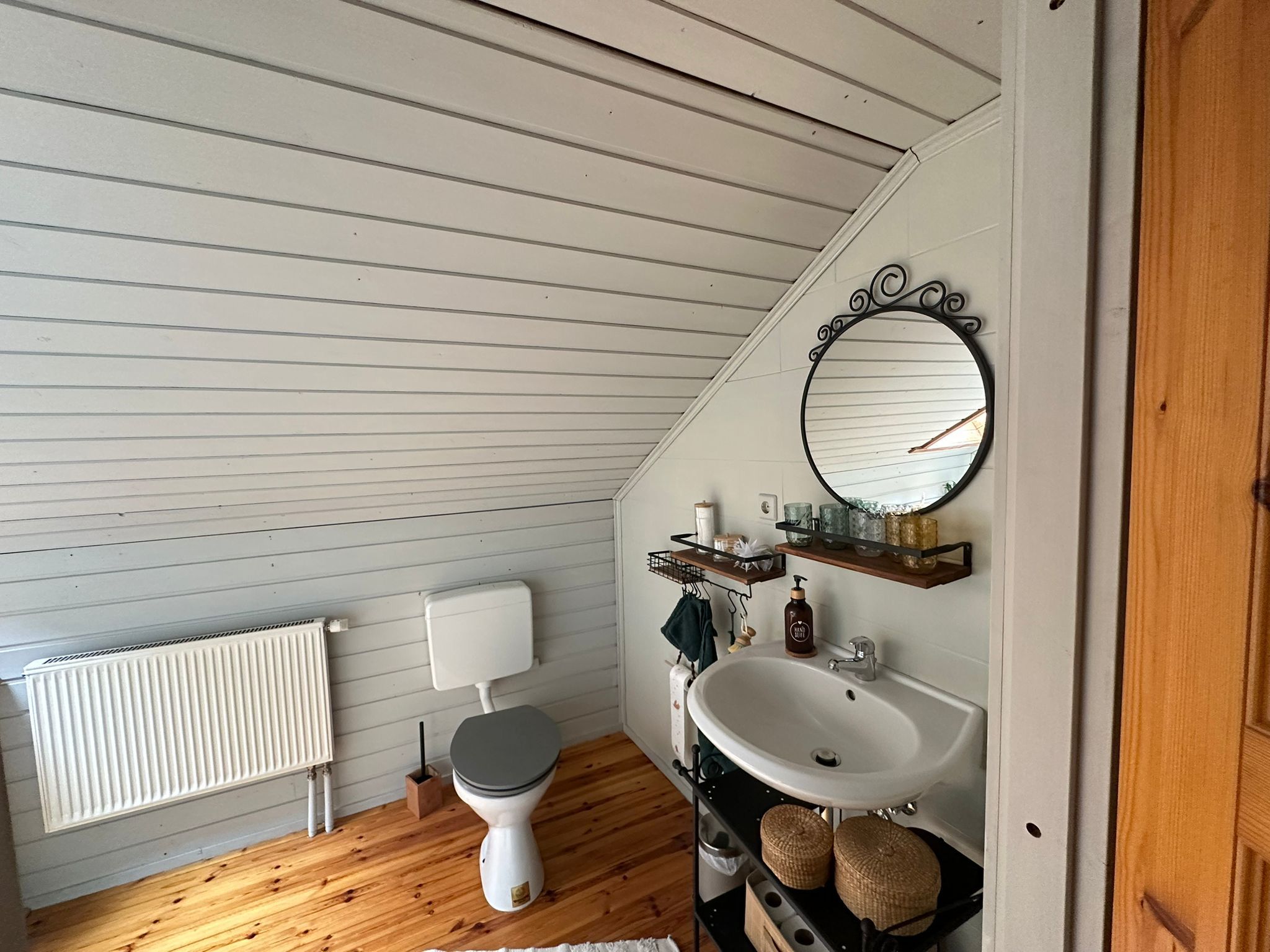Die Wohnung hat eine Grundfläche von ca. 100m2, ist wegen der Bauweise des Holzhauses und der Dachschrägen in der Nutzung an manchen Stellen etwas eingeschränkt.