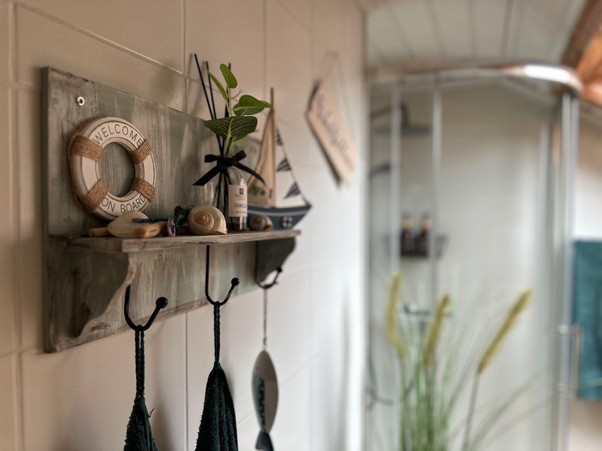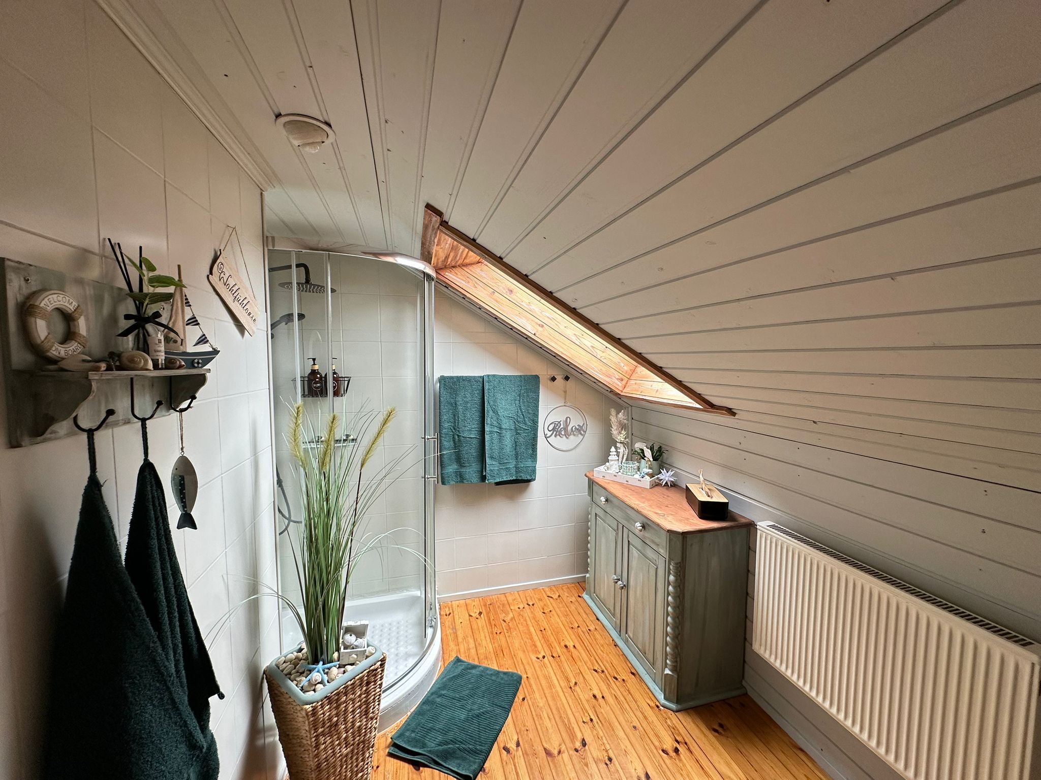 Das geräumige Badezimmer ist mit Regendusche, WC, Waschbecken und Fön ausgestattet. Toilettenpapier, Damen-Hygieneartikel, Seife, Shampoo, Duschgel, Wattepads und Wattestäbchen sind inklusiv.