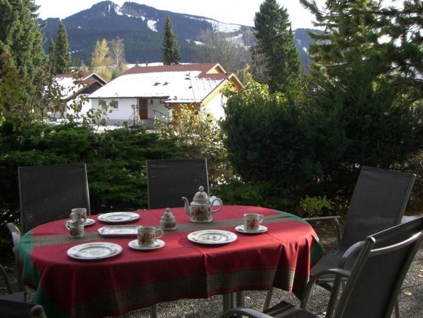 Unser Haus wird umgeben von einer extra großen Terasse mit schönen Möbeln und elektrischer Markise. Aus den Fenstern fällt der Blick auf Alpspitze, Edelsberg und Buron.