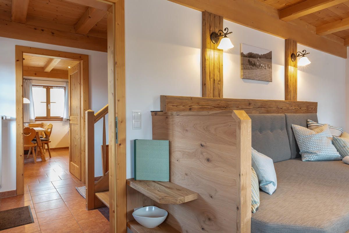 Unser Biobauernhof liegt in der Gasse. Die Gasse ist ein ruhiger Ortsteil etwas oberhalb von Gmund und ist geprägt von wunderschönen bäuerlichen Anwesen. Unser Hof ist umgeben von grünen Wiesen mit Sicht auf Wälder und Berge. Beim Errichten unserer Ferienwohnungen war uns die Ökologie sehr wichtig. Deshalb haben wir als Baumaterial Holz verwendet und sogar teilweise unser eigenes Holz z.B im Dachstuhl verbaut. Natürlich wird auch mit unserem eigenen Holz geheizt. Aus der Leitung kommt frisches Bergquellwasser.