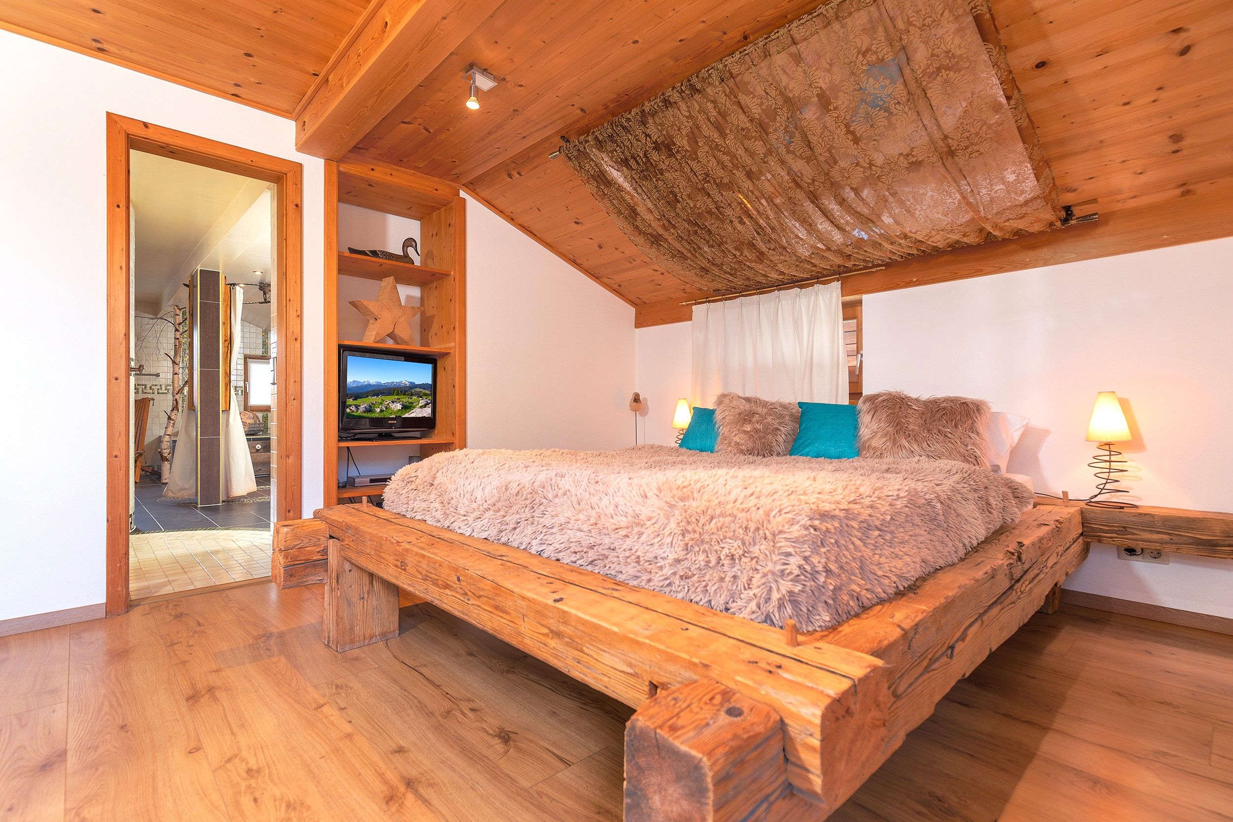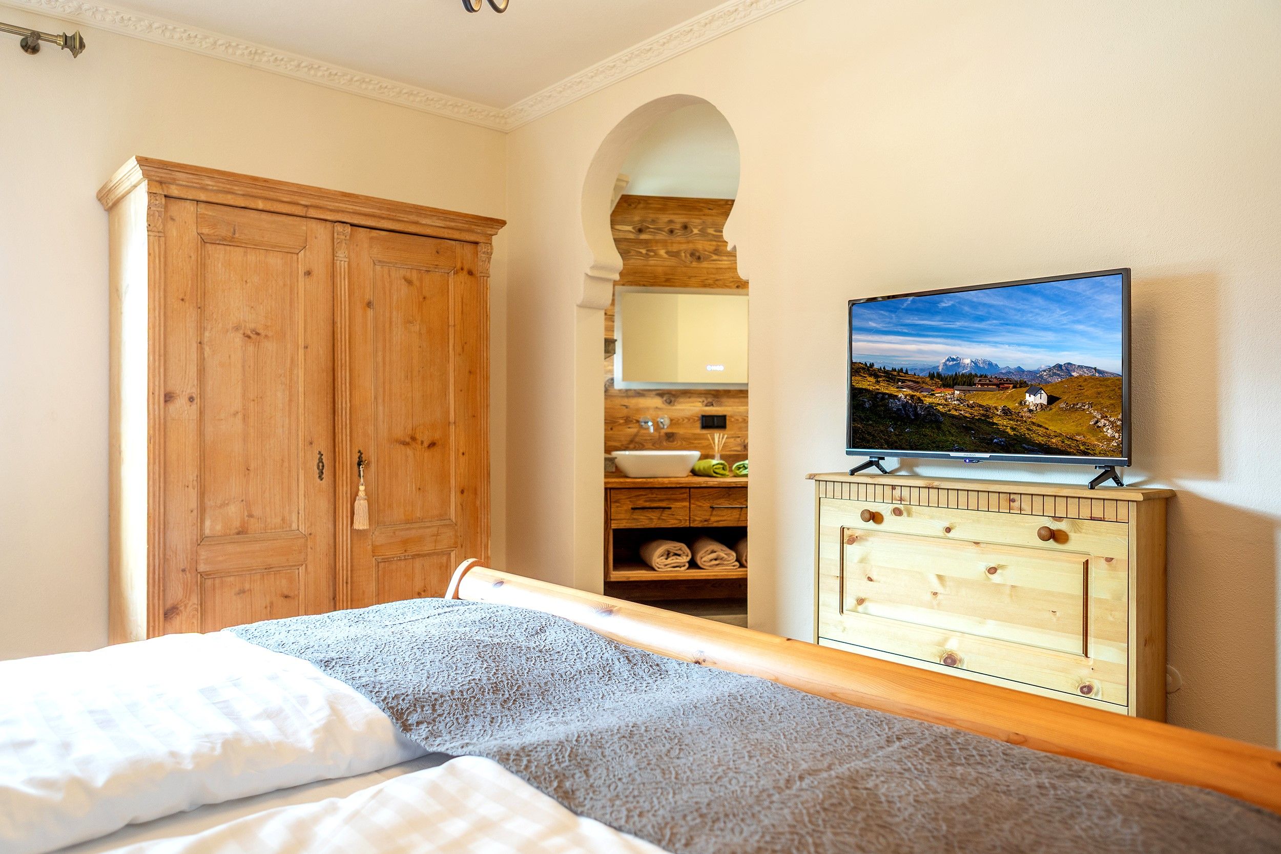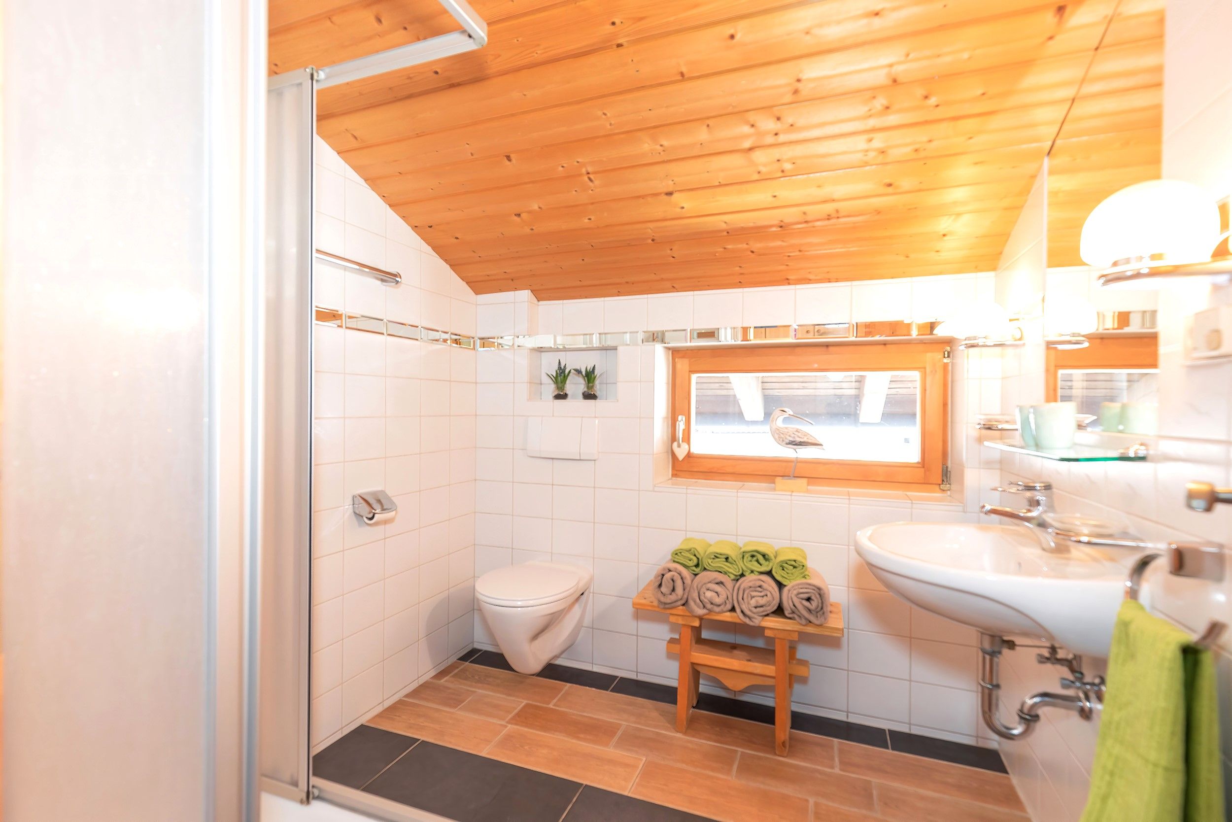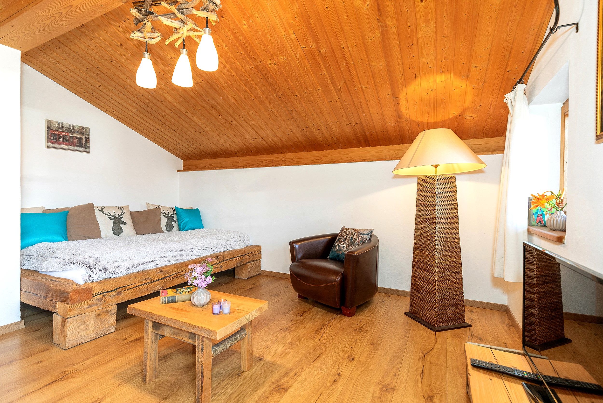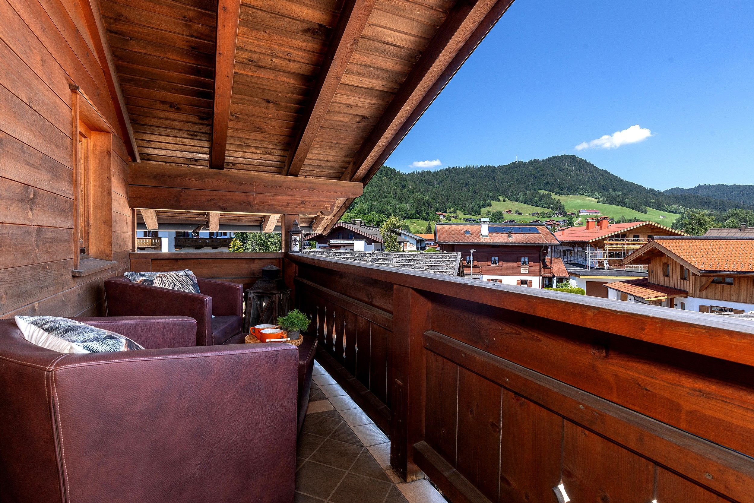 Im Dachgeschoss erwartet Sie die charmante Kaiser Vista – ideal für Paare oder Alleinreisende, die Ruhe und Privatsphäre schätzen. Diese Wohnung verfügt über ein Schlafzimmer, eine private Sauna und als besonderes Highlight eine möblierte Panorama-Dachterrasse mit herrlichem Blick über die Dächer von Reit im Winkl.