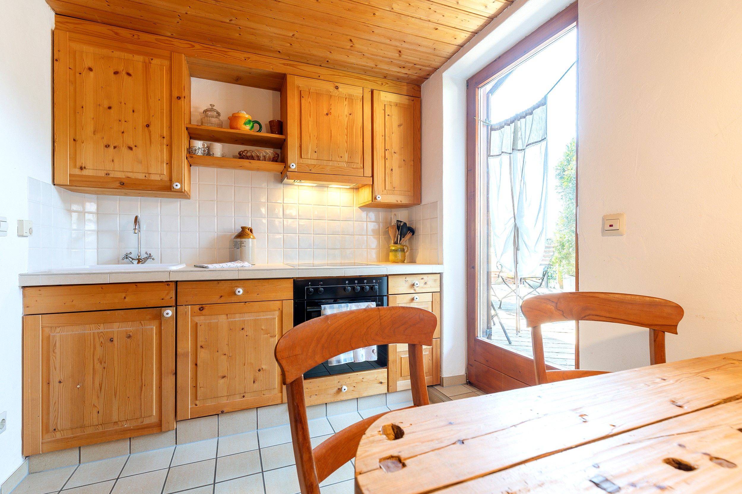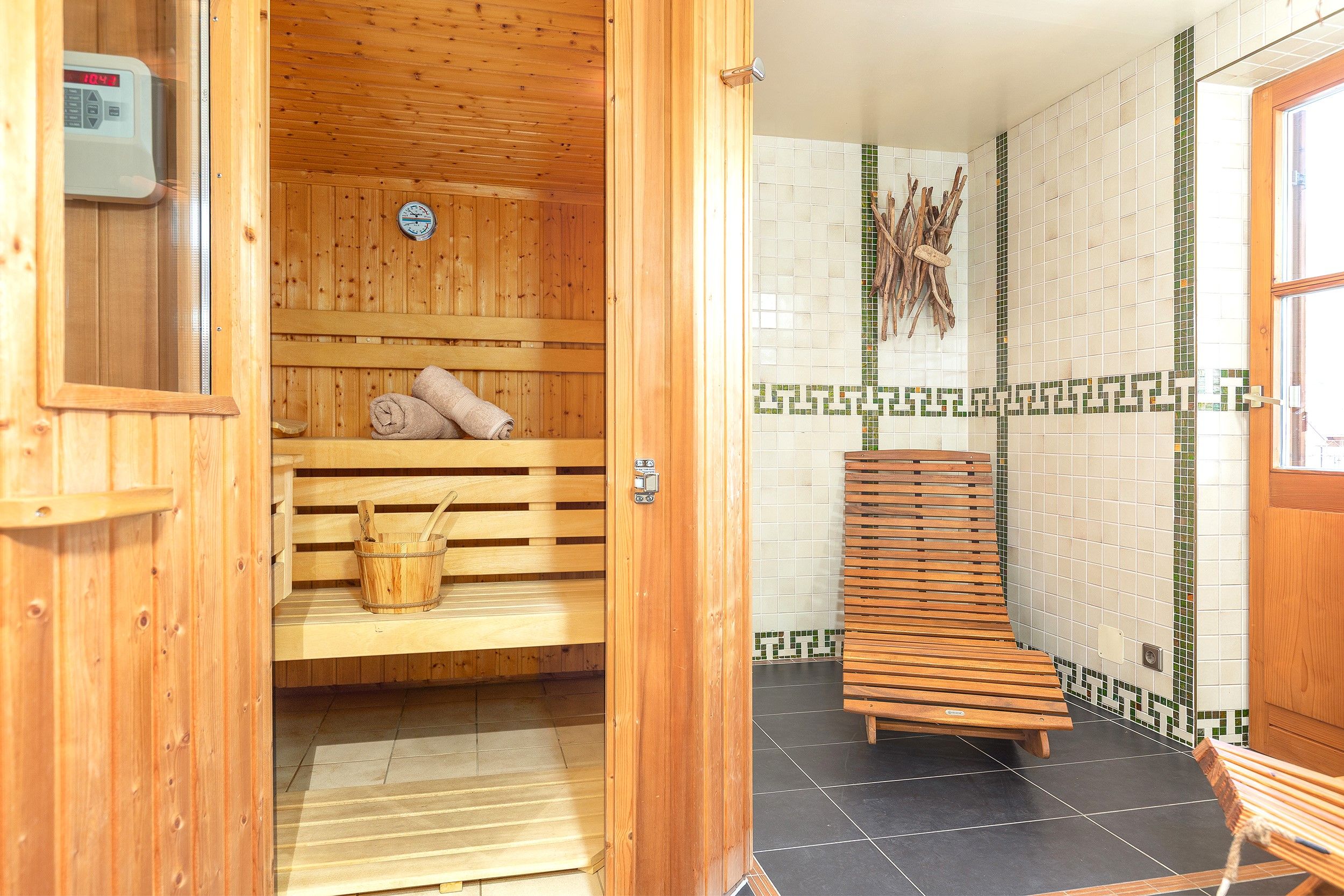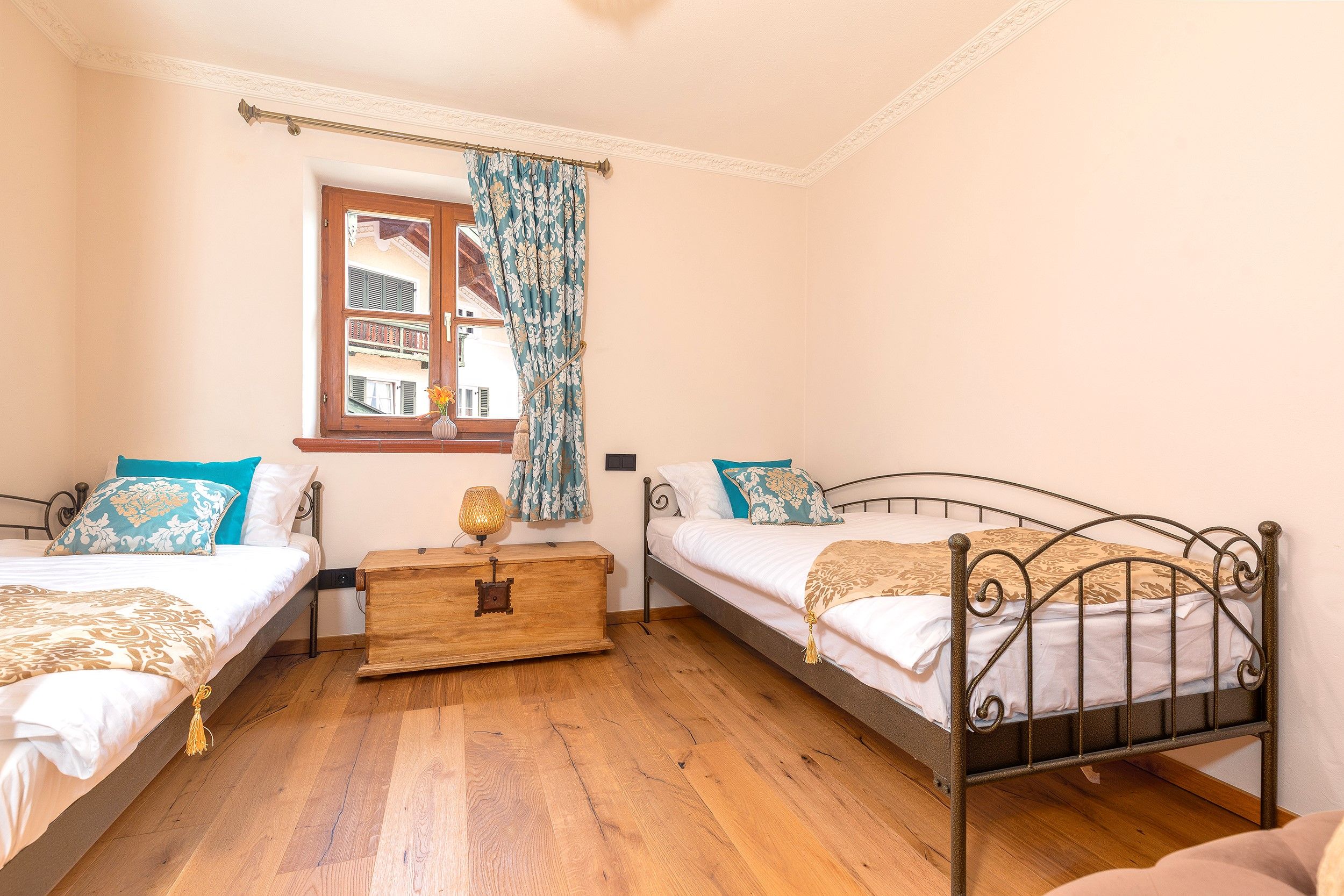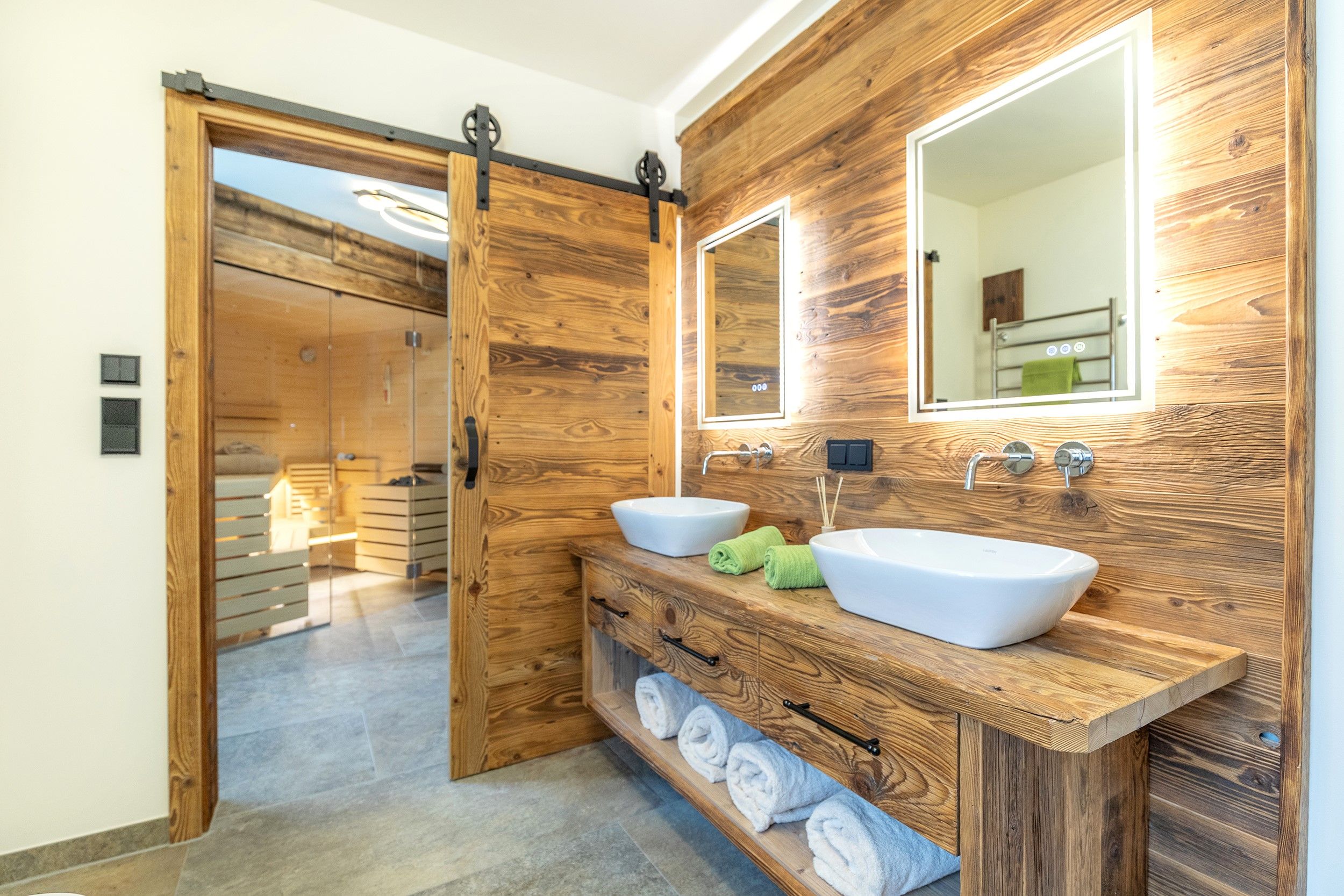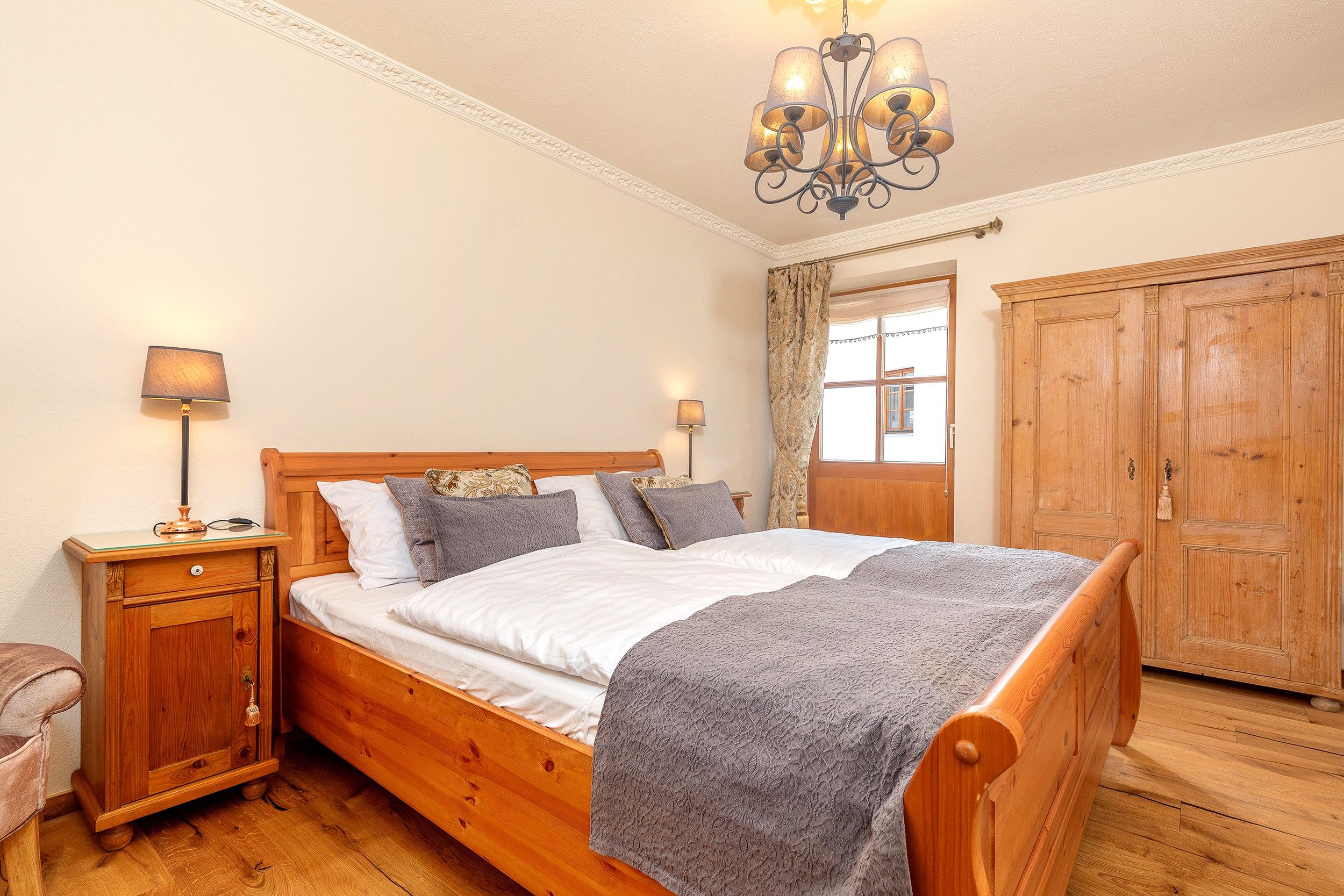 Im ersten Stock befindet sich die großzügige Kaiser Residenz. Diese weitläufige Wohnung bietet Platz für bis zu sechs Personen und verfügt über drei separate Schlafzimmer, einen gemütlichen Wohn- und Essbereich sowie eine eigene Sauna – perfekt, um nach einem aktiven Tag in den Bergen zu entspannen. Der Balkon rundet das Wohlfühlerlebnis mit einem schönen Ausblick ab.