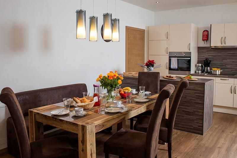 Alle acht Ferienwohnungen bieten je zwei Schlafzimmer, eine privaten Balkon, ein Badezimmer und eine voll ausgestattete Küche, in der du vom Frühstück bis zum Abendessen alle deine Lieblingsgerichte zaubern kannst. Das Penthouse punktet auf 115m2 Fläche mit drei Schlafzimmern und einer 135m2 großen Terrasse: Von hier aus hast du die Berggipfel wunderschön im Blick!