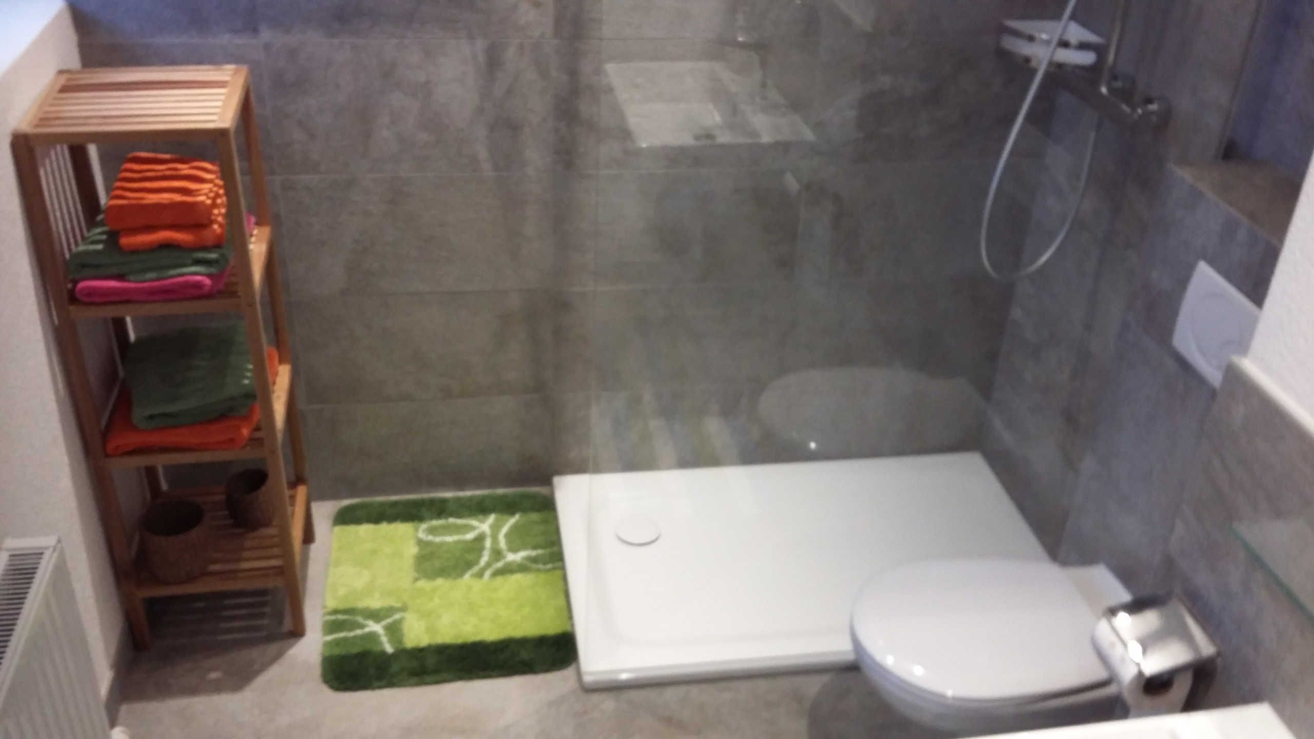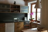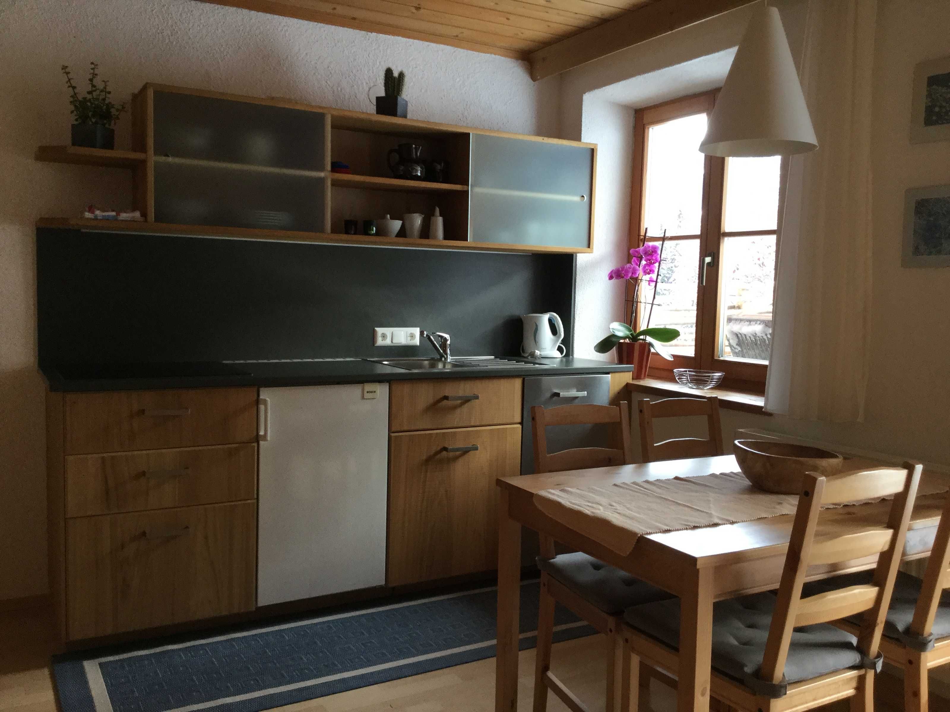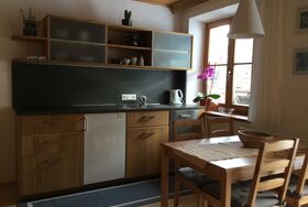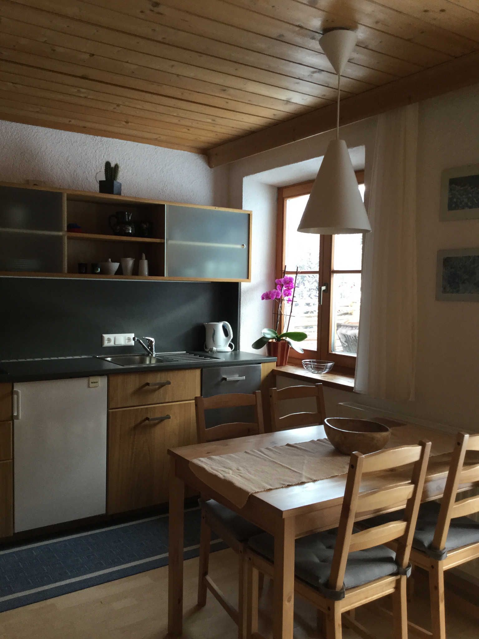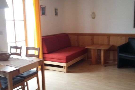 Gemütlich, liebevoll eingerichtete Ferienwohnung. Wohnraum mit Ausziehcouch- Sitzecke, kleine Küche, Schlafzimmer, Bad/WC