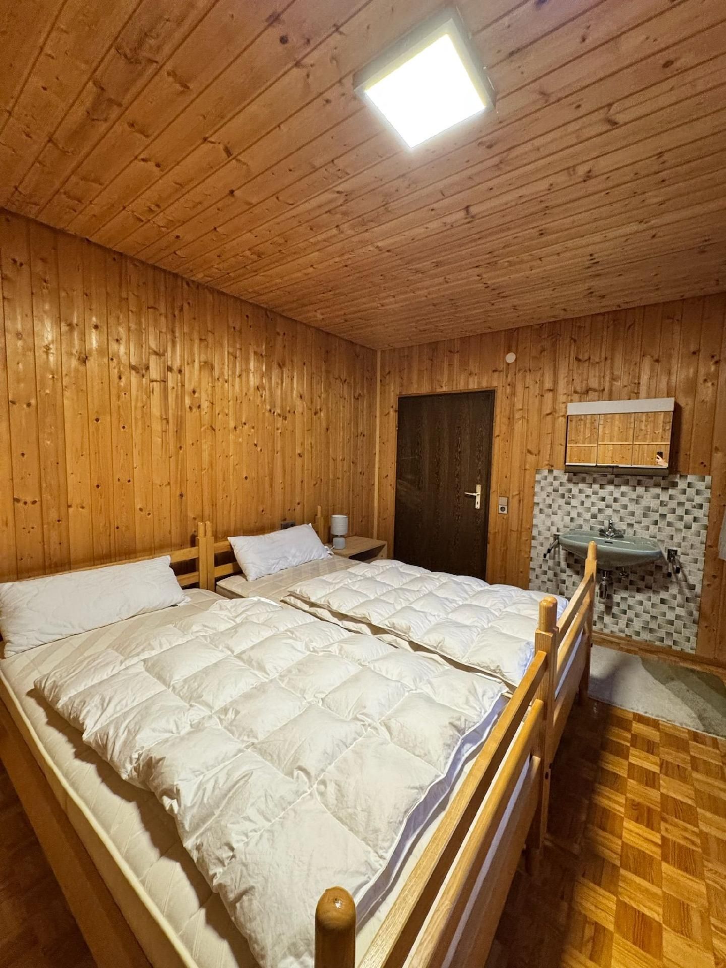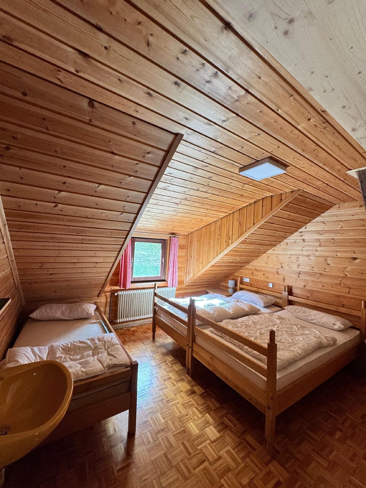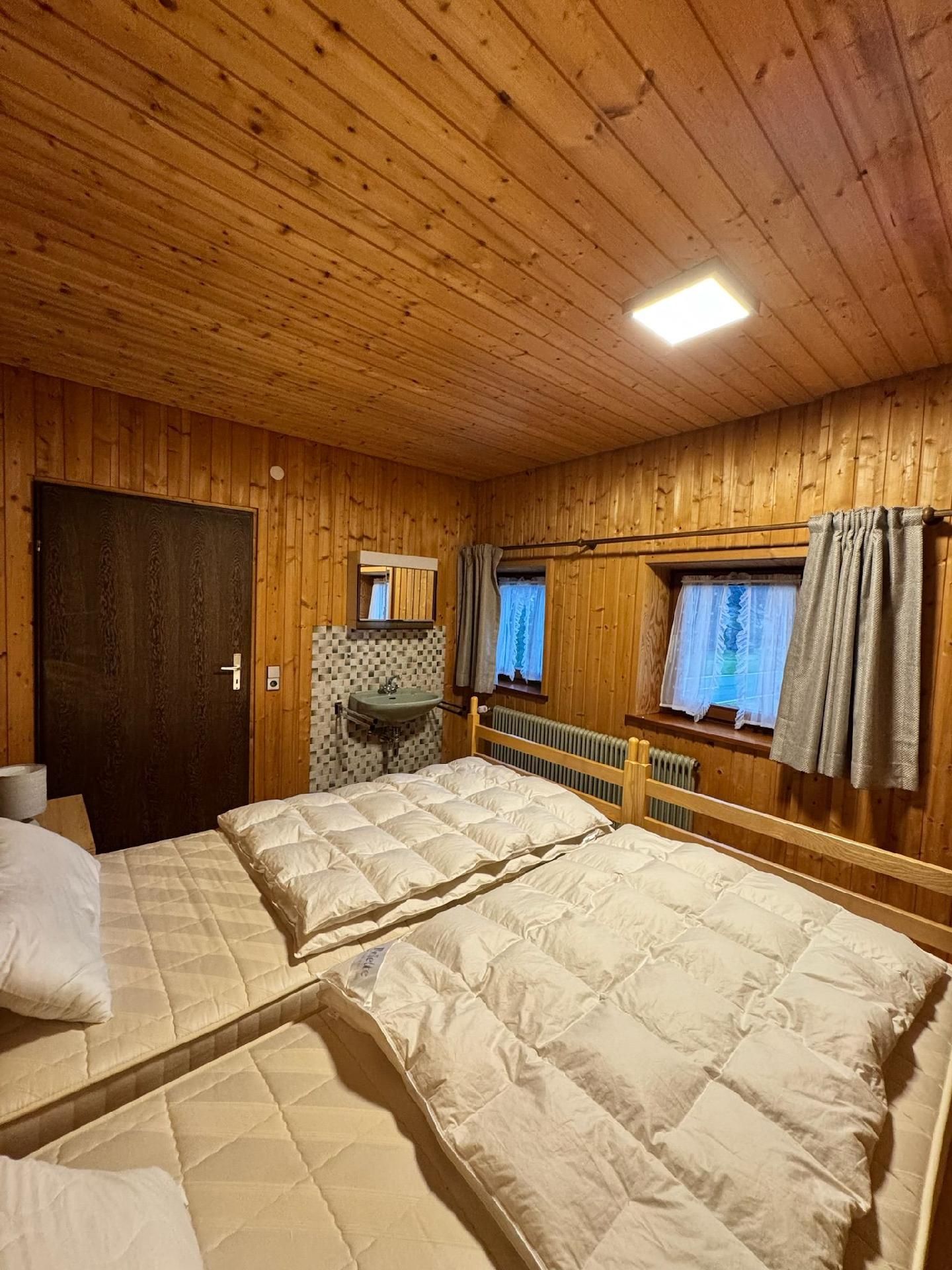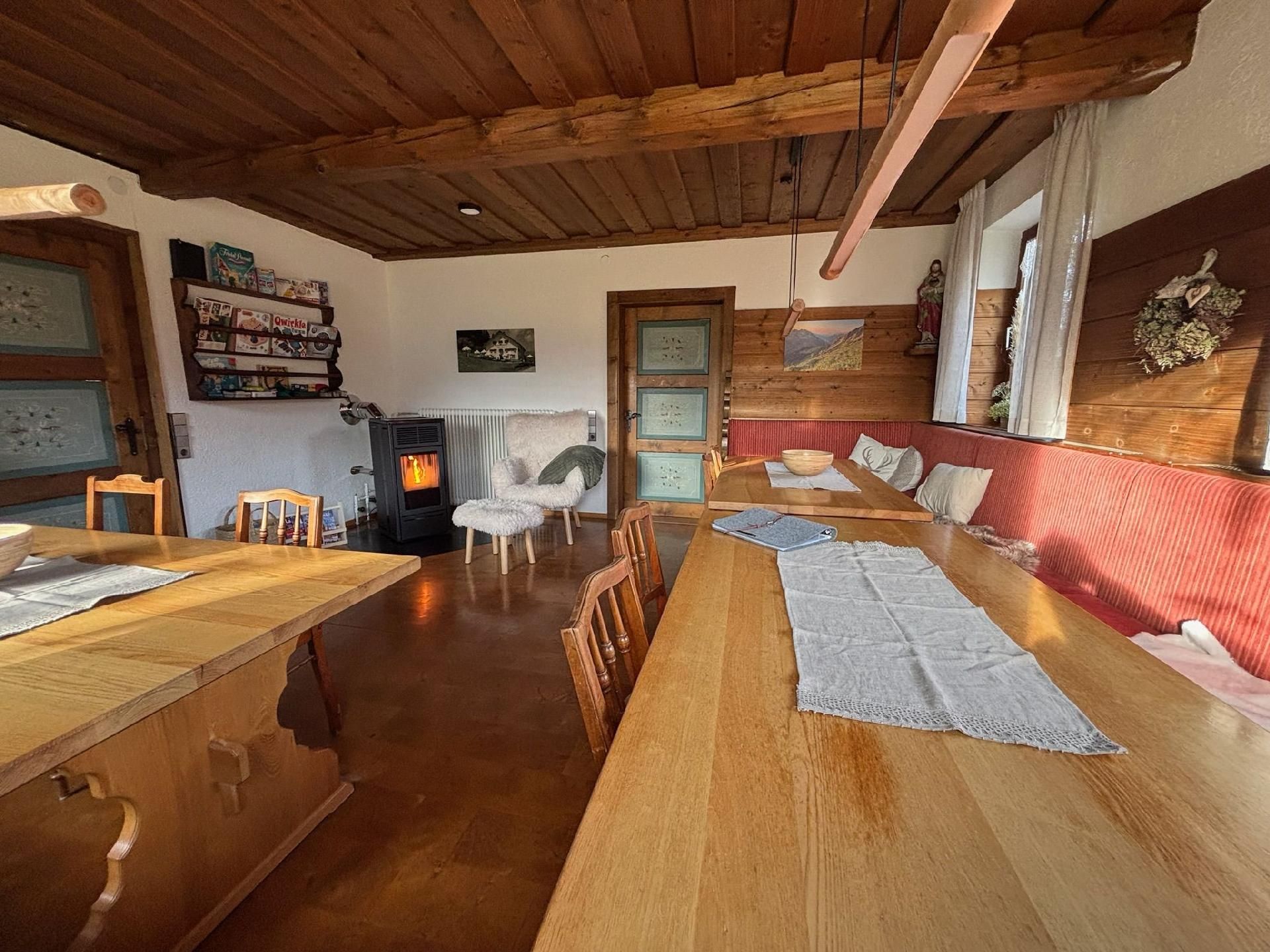 Die Innenräumlichkeiten sind mit viel Liebe gestaltet, um einen angenehmen Aufenthalt zu gewährleisten. Mit insgesamt 9 teils großen Schlafzimmern mit Doppelbetten, die alle mit einem Waschbecken ausgestattet sind, sowie zwei Badezimmern im Erdgeschoss, die jeweils mit drei Duschen (getrennt für Damen und Herren) ausgestattet sind, finden Gäste hier genügend Privatsphäre. Die Selbstverpflegung wird durch eine gut ausgerüstete Küche mit modernen Annehmlichkeiten wie 2 Cerankochfeldern, 2 Backöfen und einer Heißluftfriteuse erleichtert. Für Komfort sorgen zudem eine Waschmaschine und eine Infrarotsauna sowie ein gemütlicher Pelletofen im Aufenthaltsraum für kühle Tage.