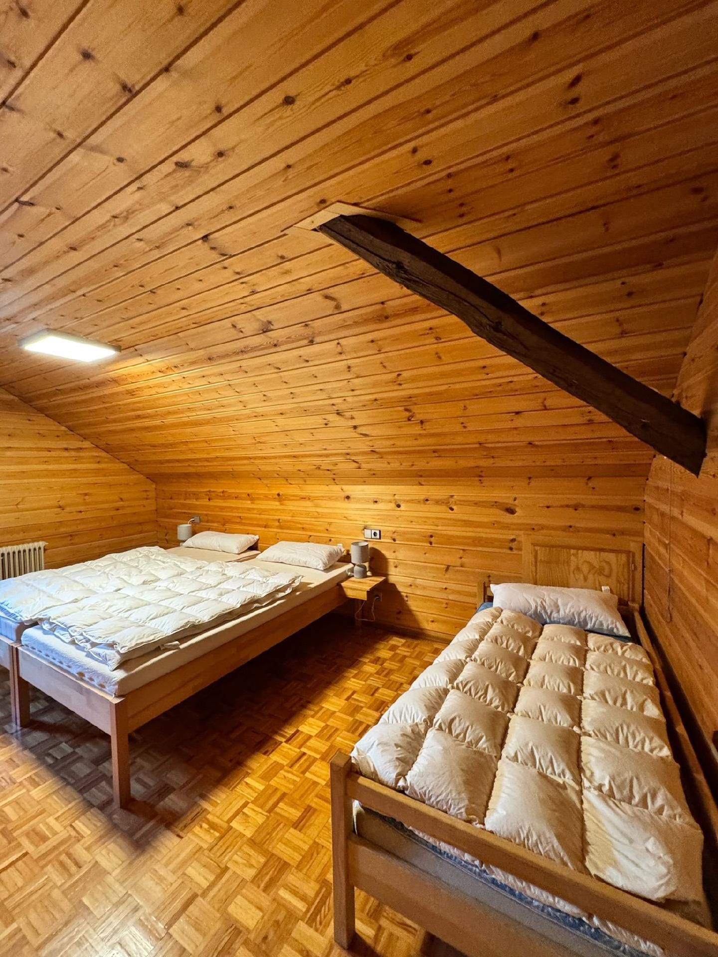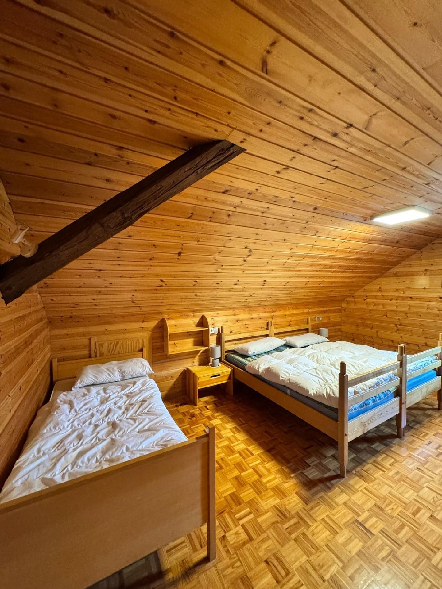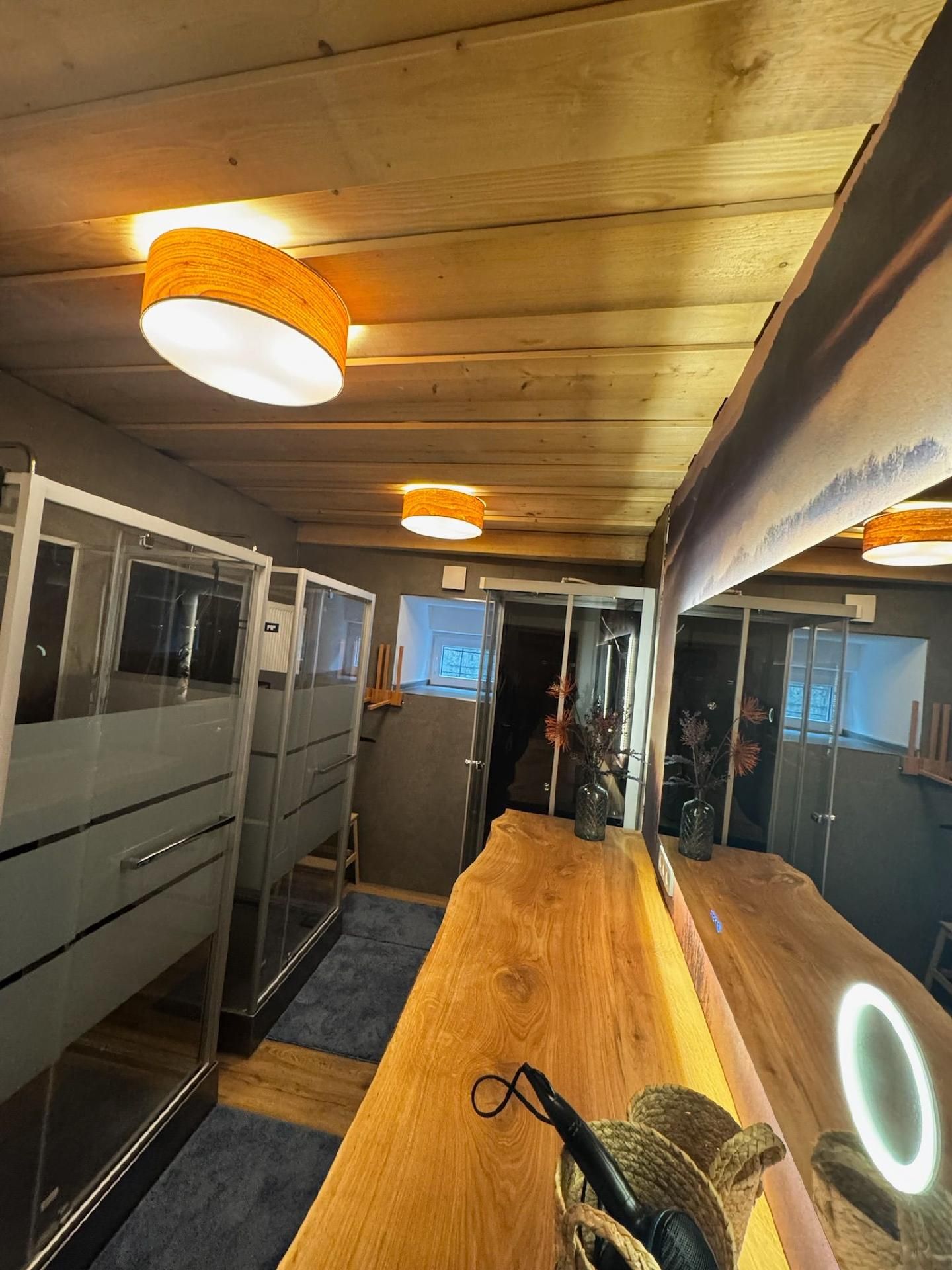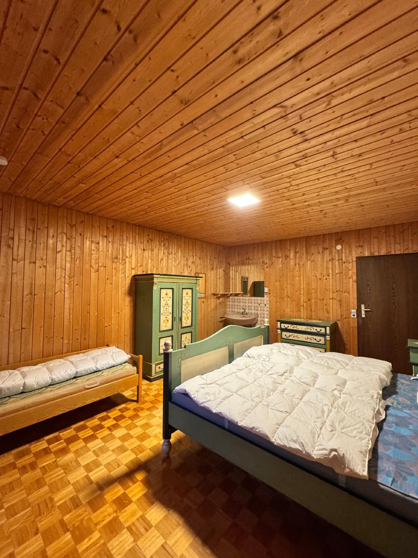 Die Innenräumlichkeiten sind mit viel Liebe gestaltet, um einen angenehmen Aufenthalt zu gewährleisten. Mit insgesamt 9 teils großen Schlafzimmern mit Doppelbetten, die alle mit einem Waschbecken ausgestattet sind, sowie zwei Badezimmern im Erdgeschoss, die jeweils mit drei Duschen (getrennt für Damen und Herren) ausgestattet sind, finden Gäste hier genügend Privatsphäre. Die Selbstverpflegung wird durch eine gut ausgerüstete Küche mit modernen Annehmlichkeiten wie 2 Cerankochfeldern, 2 Backöfen und einer Heißluftfriteuse erleichtert. Für Komfort sorgen zudem eine Waschmaschine und eine Infrarotsauna sowie ein gemütlicher Pelletofen im Aufenthaltsraum für kühle Tage.