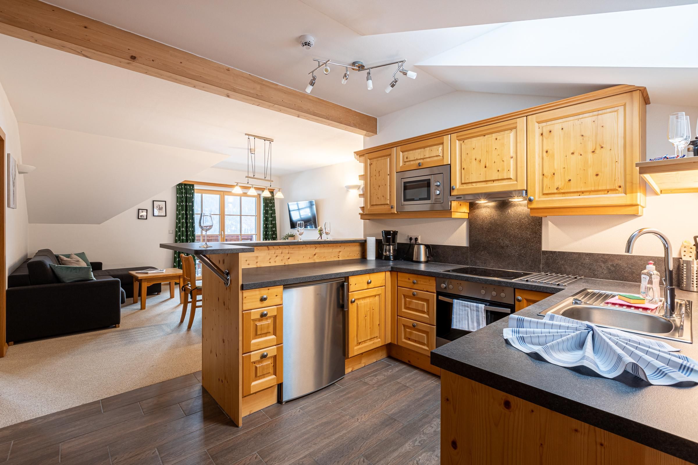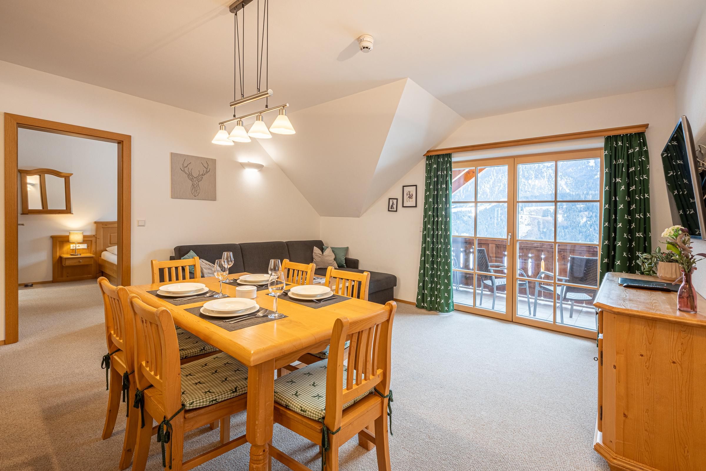 Aparthaus Sonnenberg – Top 3 Kufstein befindet sich im 2. Stock und bietet auf 72 m² Platz für bis zu 6 Personen. Die Wohnung umfasst zwei Schlafzimmer mit Doppelbetten sowie ein Schlafsofa im Wohnzimmer. Eine voll ausgestattete Küche, zwei separate Badezimmer, ein zusätzliches WC und ein Balkon sorgen für hohen Wohnkomfort. Zwei Garagenparkplätze stehen ebenfalls zur Verfügung. Der hauseigene Saunabereich sorgt für zusätzliche Entspannung.