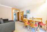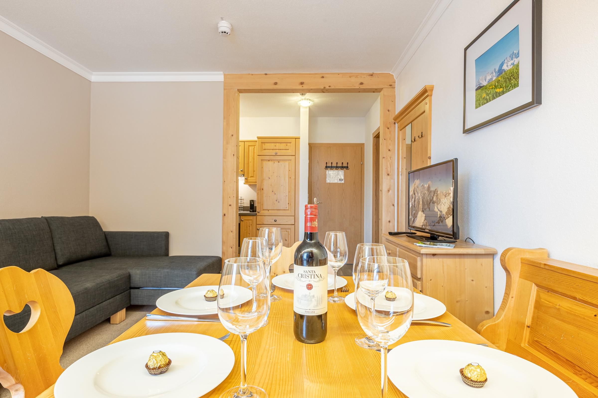 Aparthaus Sonnenberg – Top 5 Dachstein befindet sich im 1. Stock und bietet auf 58 m² Platz für bis zu 6 Personen. Die Wohnung umfasst zwei Schlafzimmer mit Doppelbetten sowie ein Schlafsofa im Wohnzimmer. Eine voll ausgestattete Küche, zwei separate Badezimmer, ein zusätzliches WC sowie eine Terrasse mit Garten sorgen für hohen Wohnkomfort. Ein Parkplatz steht ebenfalls zur Verfügung. Der hauseigene Saunabereich sorgt für zusätzliche Entspannung.
