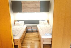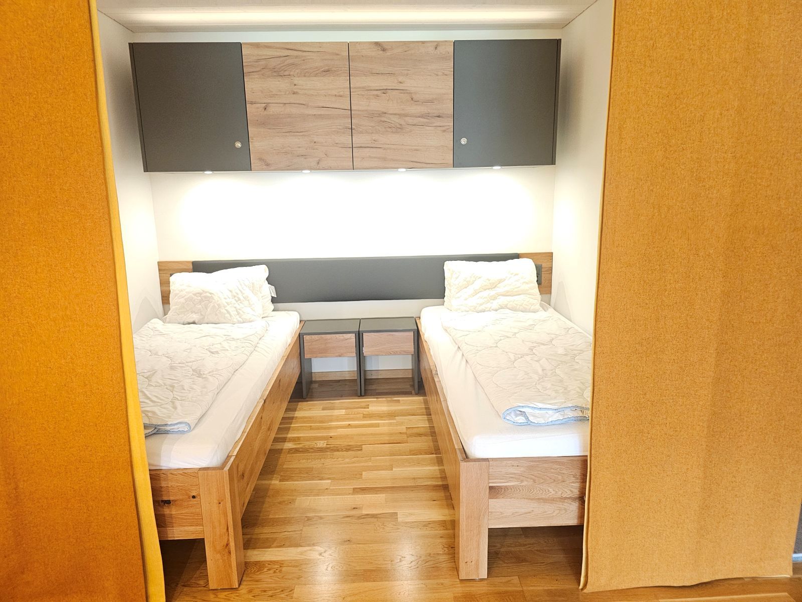 4 Betten (2 Betten in Schlafnische), die an Wohnraum angrenzt + 2 Wandschrankbetten, die praktisch in der Handhabung sind. Esstisch, moderne Ledersitzgruppe, neue Parkettböden und Bodenfliesen, TV (Kabel), Radio. Dusche / WC.