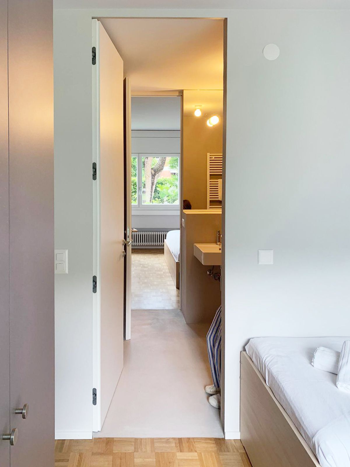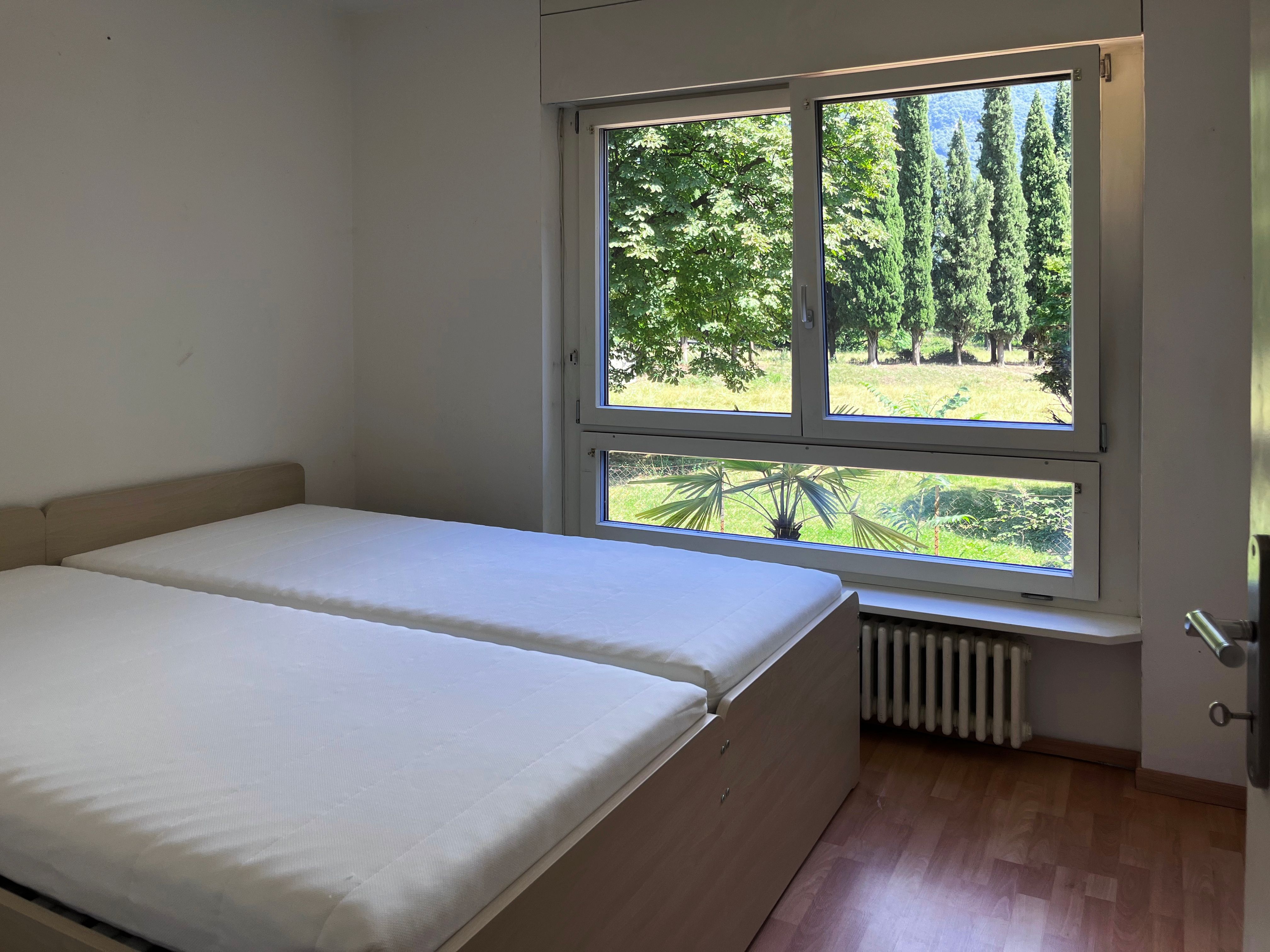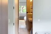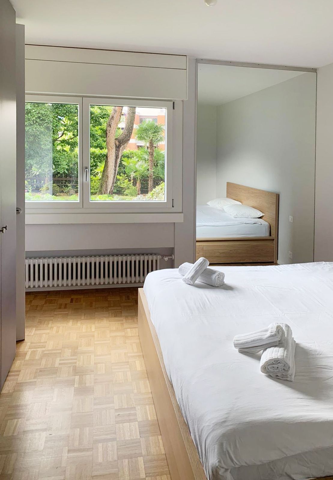 Das Hauptschlafzimmer hat einen Blick auf den Garten und ist mit einem Doppelbett mit Schubladen und einem Kleiderschrank ausgestattet. Das zweite Schlafzimmer blickt auf den dahinter liegenden Park und ist mit 2 Einzelbetten und einem Kleiderschrank ausgestattet. Ein großzügiges Badezimmer befindet sich zwischen den beiden Schlafzimmern, während eine zweite kleine Toilette den Tagesbereich bedient.