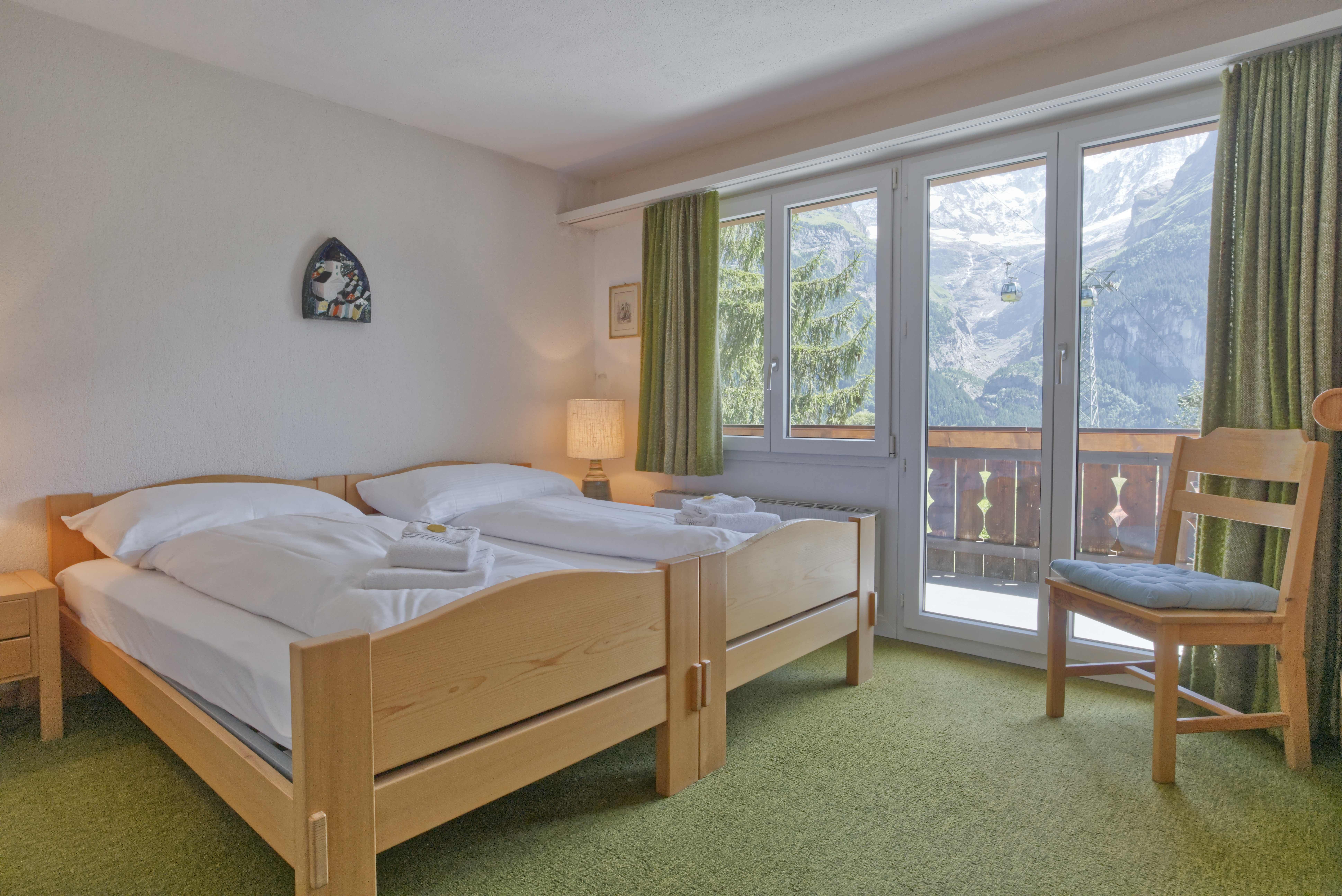 Die einfach eingerichtete 4.5-Zimmerwohnung im 2. Obergeschoss bietet auf 70m2 zwei Schlafzimmer mit zwei Einzelbetten und ein Schlafzimmer mit Stockbett sowie ein Badezimmer mit Bad/WC. Die Ferienwohnung ist mit einer geschlossenen Küche sowie einem gemütlichen Wohn- und Essbereich ausgestattet. Auf dem Balkon geniessen Sie die Aussicht auf das wunderbare Bergpanorama.