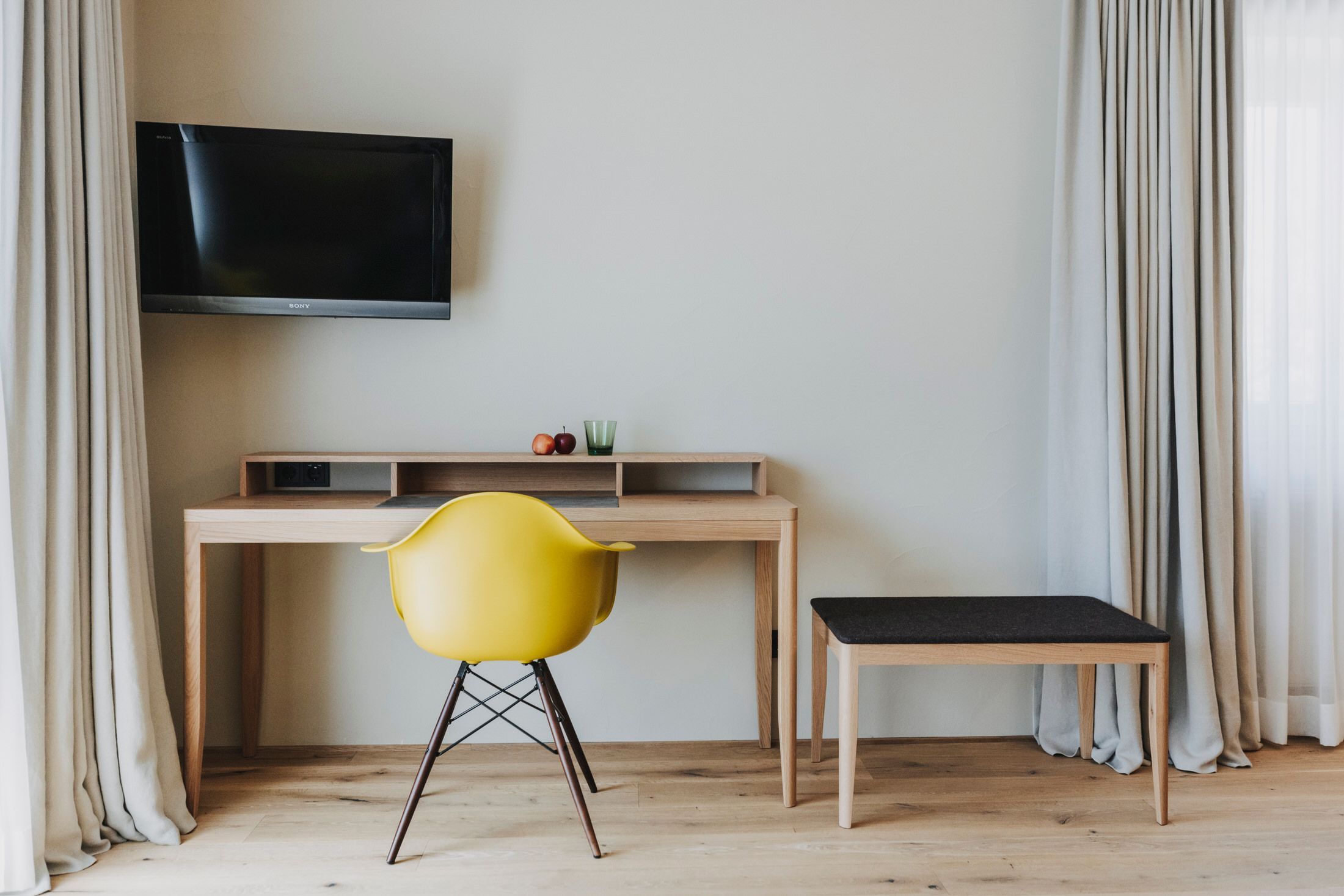 Exclusive DOPPELZIMMER - ca. 32m² - im modernen Design mit alpinen Charme - ausgestattet mit Südbalkon, Holzboden, Schreibtisch, Telefon, Flat-TV, Safe, gemütlichem Sitzsofa und modernem Badezimmer mit Regendusche, WC, Haarfön, Kosmetikspiegel.