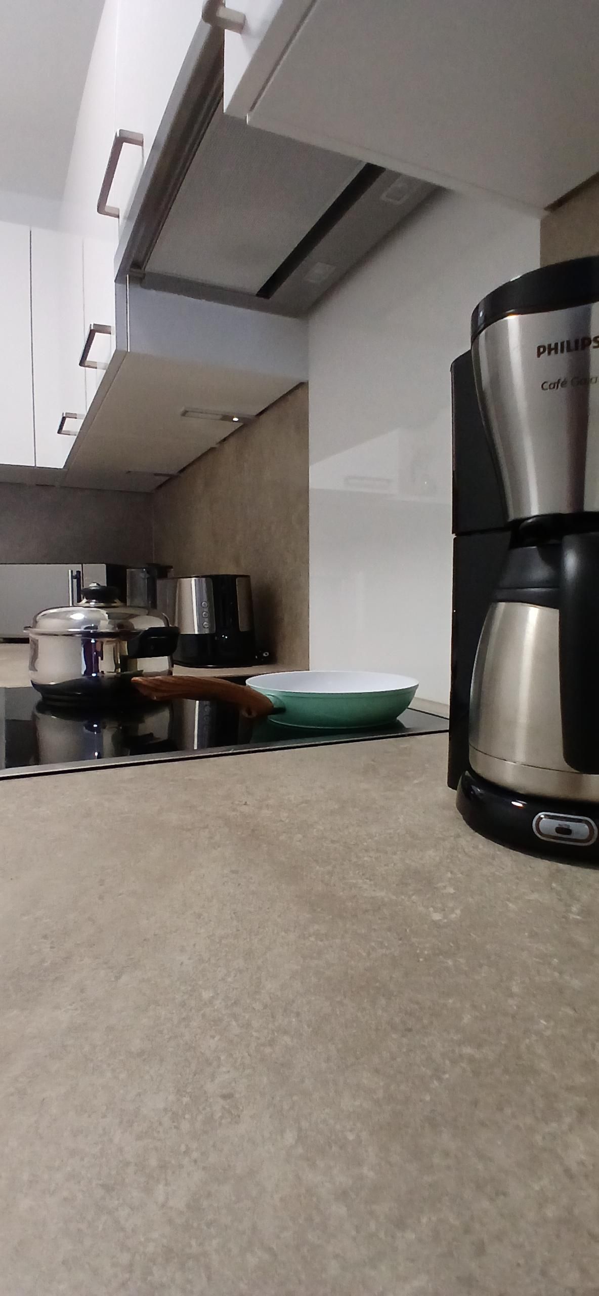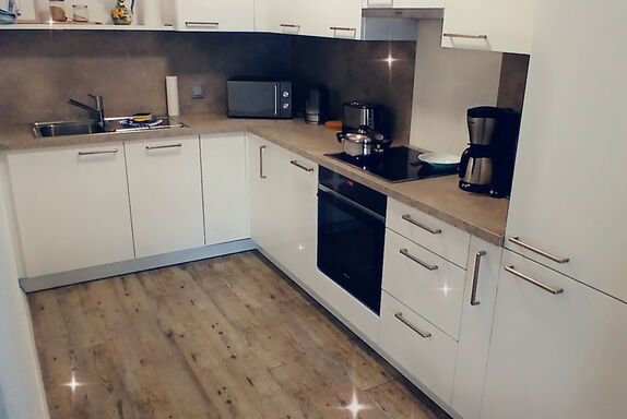 Die **offene Küche** ist voll ausgestattet mit allem, was du brauchst: Cerankochfeld, Backofen, Kühlschrank mit Gefrierfach, Spülmaschine, Kaffeemaschine, Wasserkocher und Toaster – hier lässt sich auch im Urlaub bequem kochen.