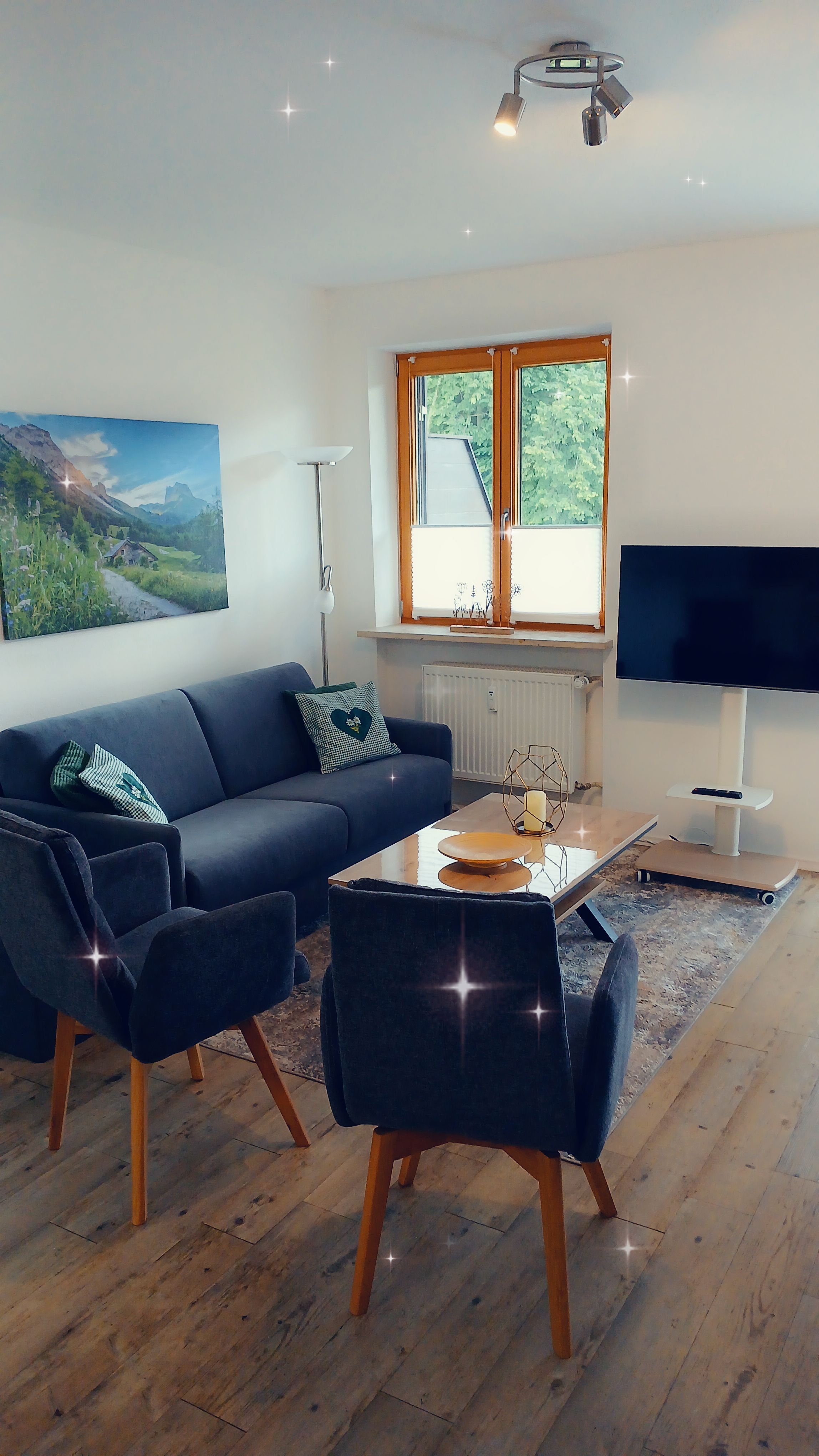 Im **Wohnbereich** erwartet dich eine großzügige Sofaecke mit Flachbild-TV – perfekt zum Entspannen nach einem aktiven Tag. Große Fenster sorgen für viel Tageslicht und geben den Blick auf die umliegenden Berge frei. Der angrenzende **Essbereich** bietet ausreichend Platz für gemeinsame Mahlzeiten oder Spieleabende.