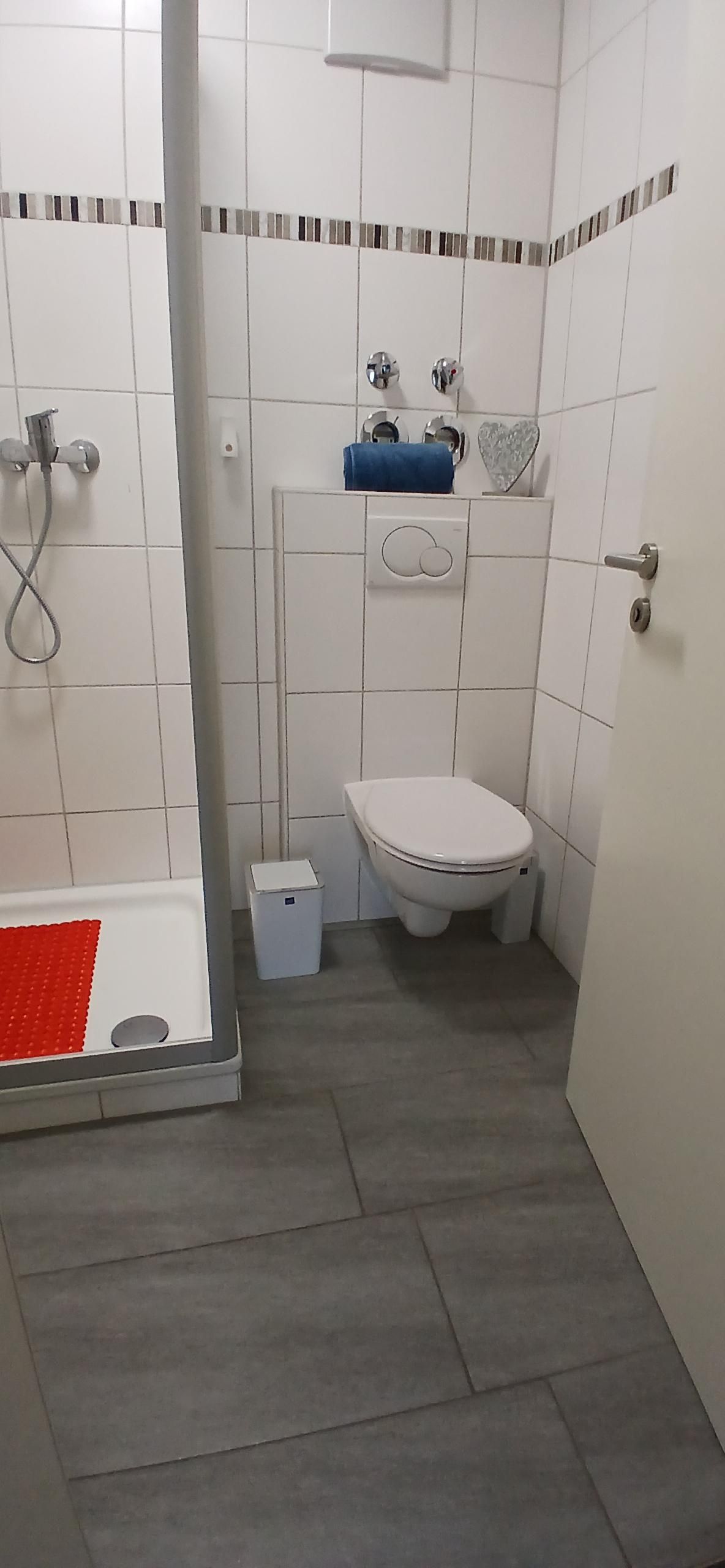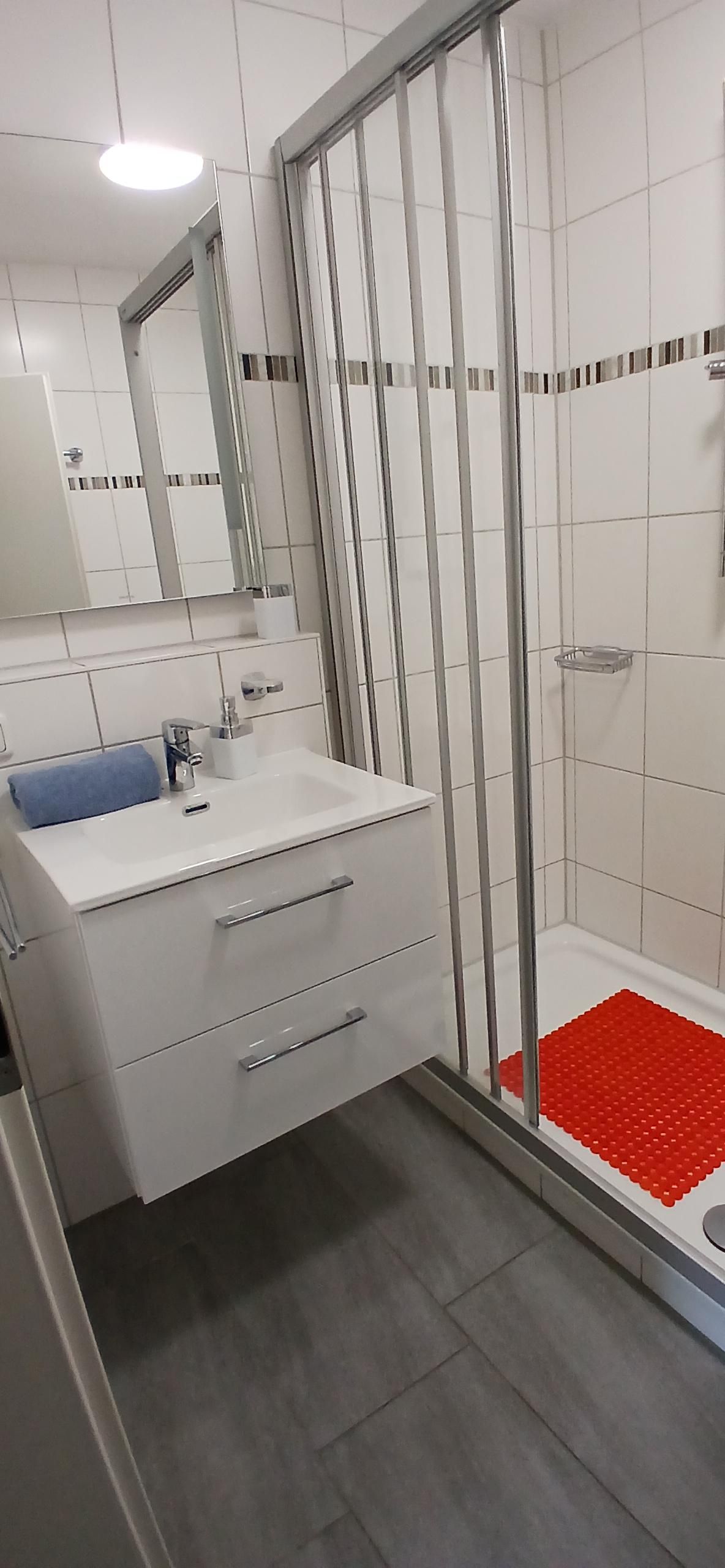 Das **moderne Badezimmer** ist hell gefliest und verfügt über eine geräumige Dusche, WC, Waschbecken sowie einen Handtuchheizkörper. Handtücher und Bettwäsche sind selbstverständlich vorhanden.
