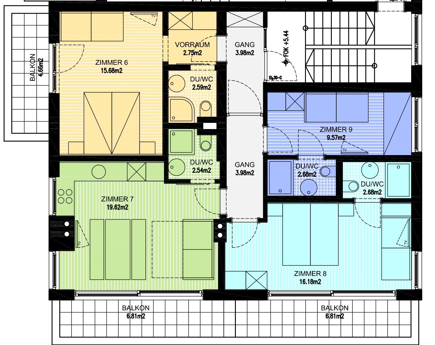 Alle Zimmer sind Allergiker-freundlich und hell eingerichtet. Außer eines haben alle 8 anderen Zimmer einen Balkon oder eine Terrasse, alle Zimmer verfügen über Sat-TV, Dusche oder Bad/WC.