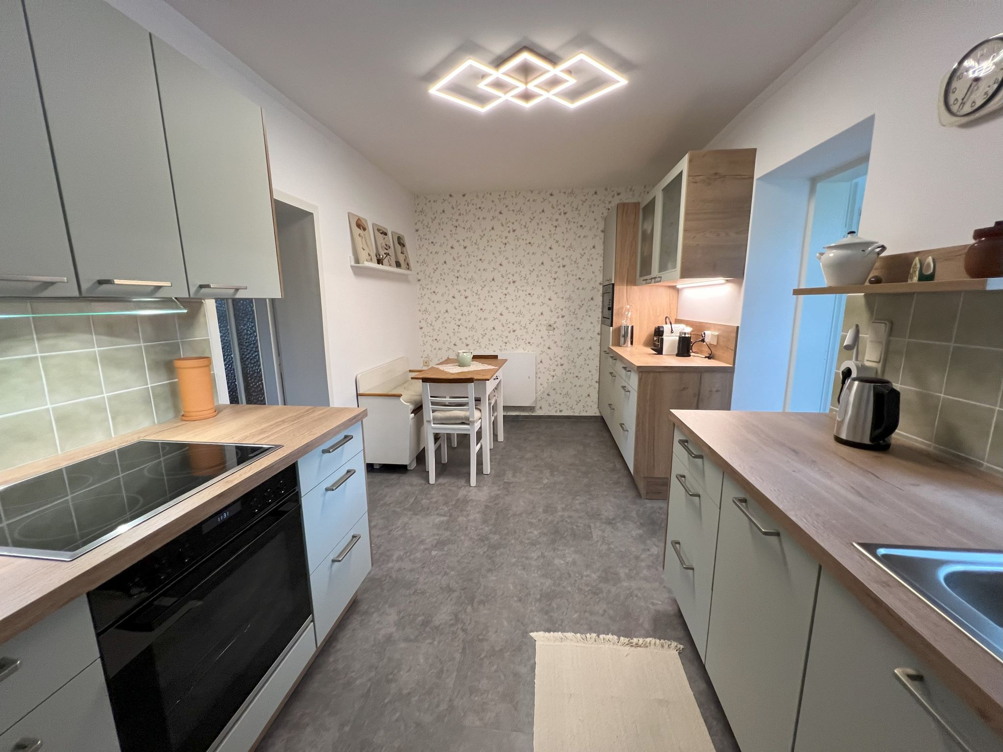 Die neue Küche ist voll ausgestattet. Die komplett ausgestattete Küche mit Geschirrspüler, Kühlschrank inkl. Gefrierfach, Herd, Backofen, Mikrowelle, Wasserkocher, Toaster und Kaffeemaschine lässt keine Wünsche offen.