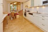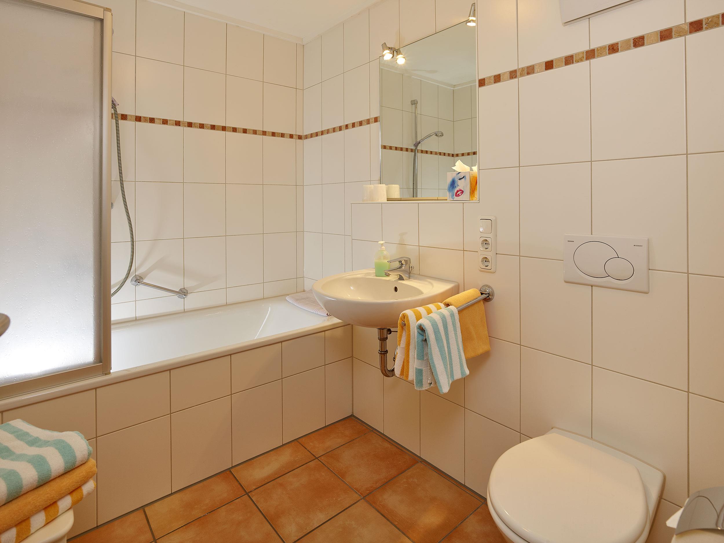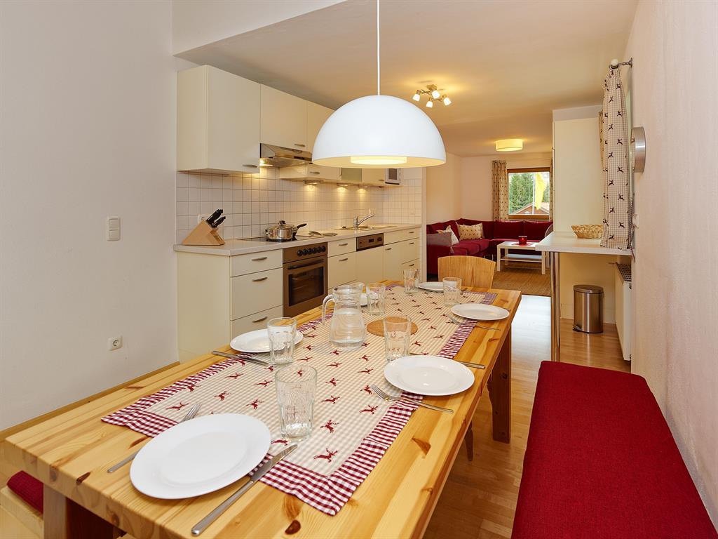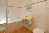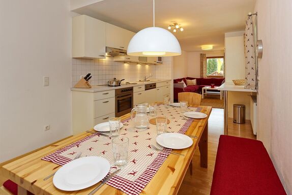 Freundliche mit Naturholzmöbeln eingerichtete Ferienwohnung, bestehend aus 2 separate Schlafzimmer, Kinderschlafzimmer, Wohnküche mit großer Eckcouch und separater Essecke, 2 Bäder mit DU/WC oder Badewanne, Flur und extra kleines Ankleidezimmer sowie überdachter Südbalkon. Die Wohnung befindet sich auf 2 miteinander verbundenen Ebenen.