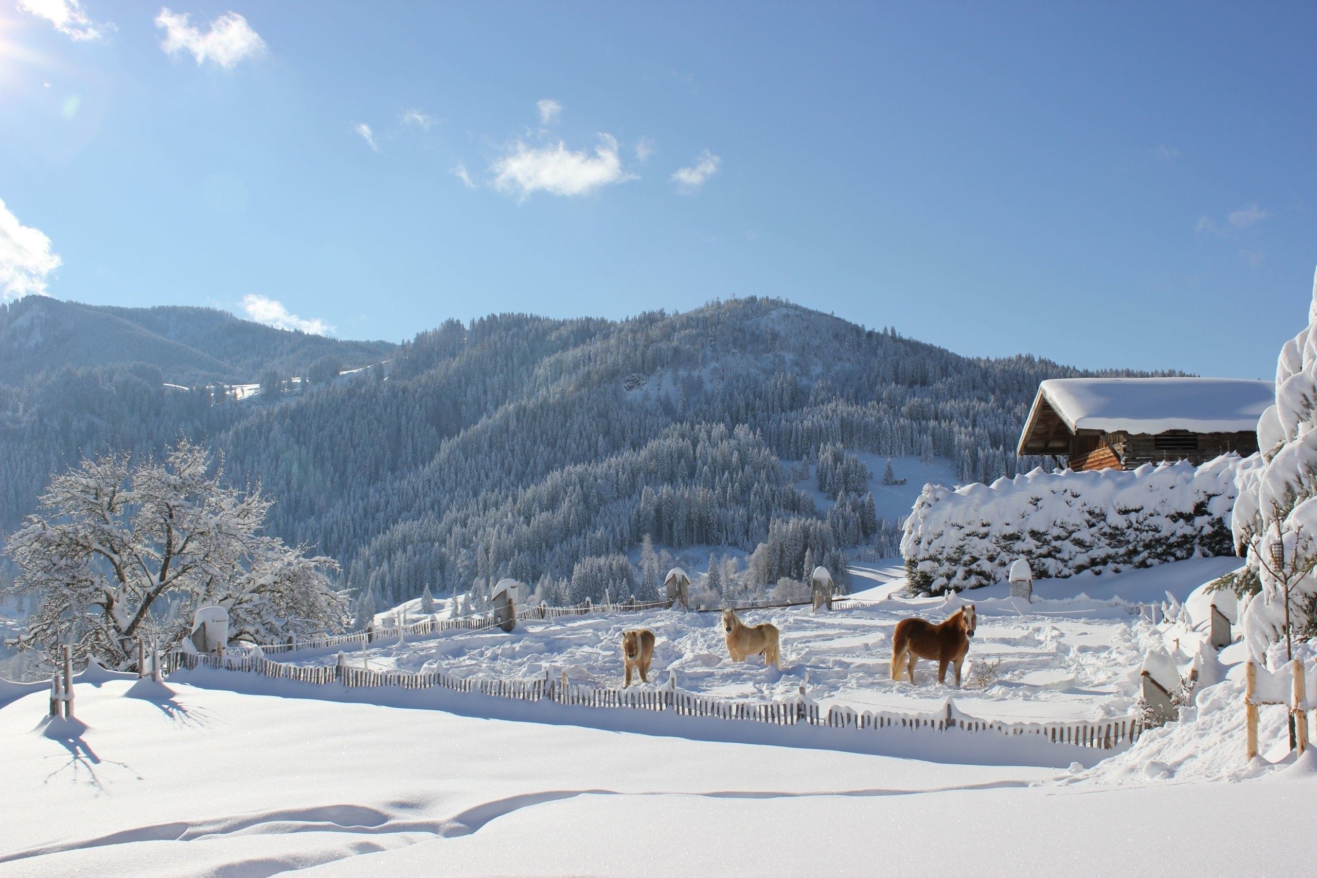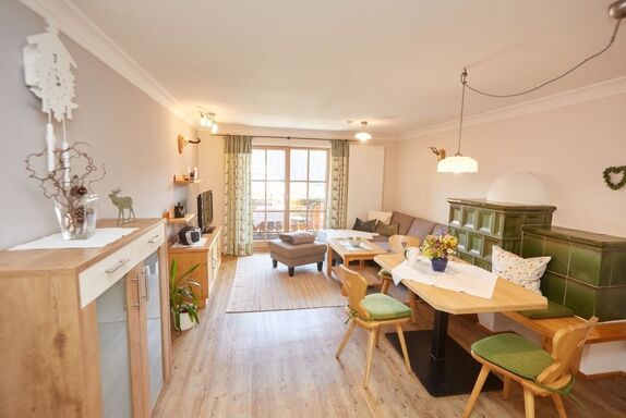 Die geräumige Ferienwohnung mit herrlichem Blick vom Balkon auf die umliegenden Berge ist für alle ruhesuchenden Gäste mit Liebe zum Wald und Wild oben auf dem Berg eine Traumunterkunft mit Wellnessberich Bichler Alpe zur Mitnutzung