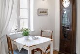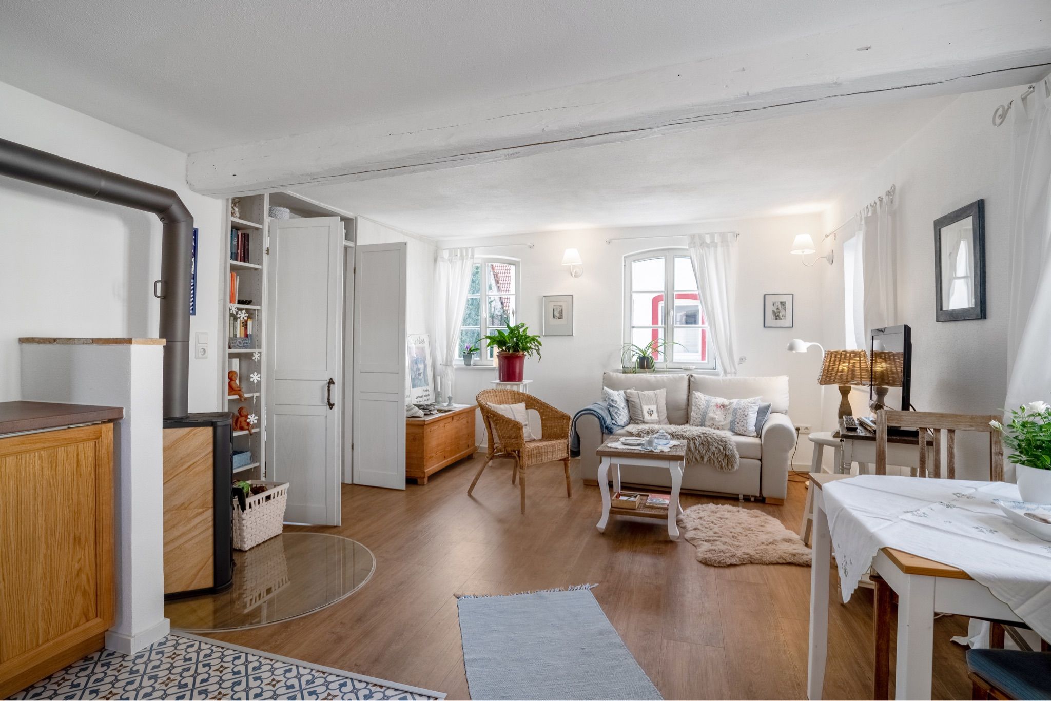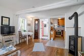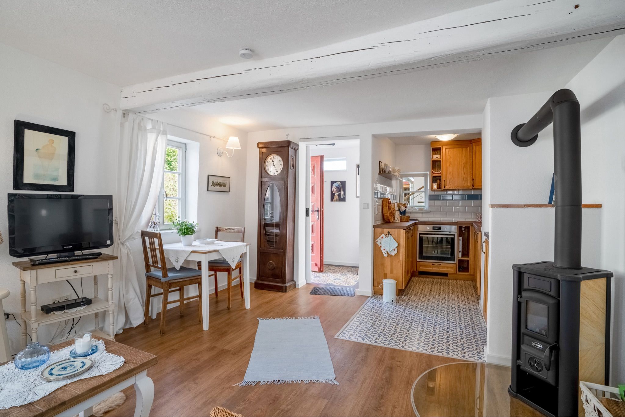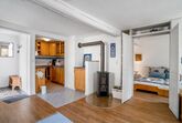 Diese liebevoll gestaltete Ferienwohnung bietet auf 45 m² alles, was Sie für einen erholsamen Wander- oder Kultururlaub benötigen. Sie betreten die Wohnung über einen kleinen Eingangsbereich. Von hier aus gelangen Sie in den zentralen Wohnraum, der Wohnzimmer und eine voll ausgestattete Einbauküche vereint. Im gemütlichen Wohnbereich finden Sie einen Esstisch, ein Schlafsofa (Liegefläche 1,40 m x 2 m) mit komfortabler Matratze sowie Satelliten-TV. Ein kleiner Kaminofen und eine Auswahl an Büchern schaffen eine gemütliche Atmosphäre – perfekt, um nach einem Ausflug zu entspannen.