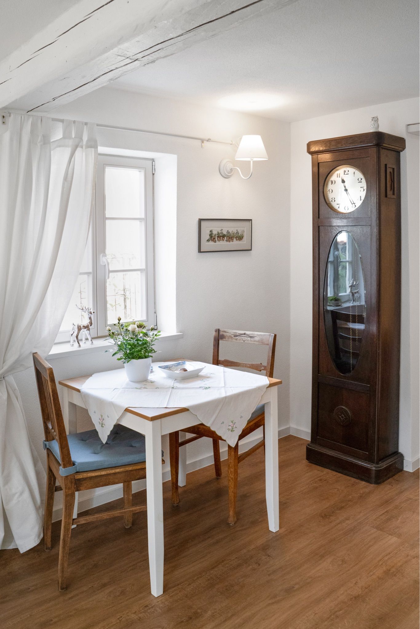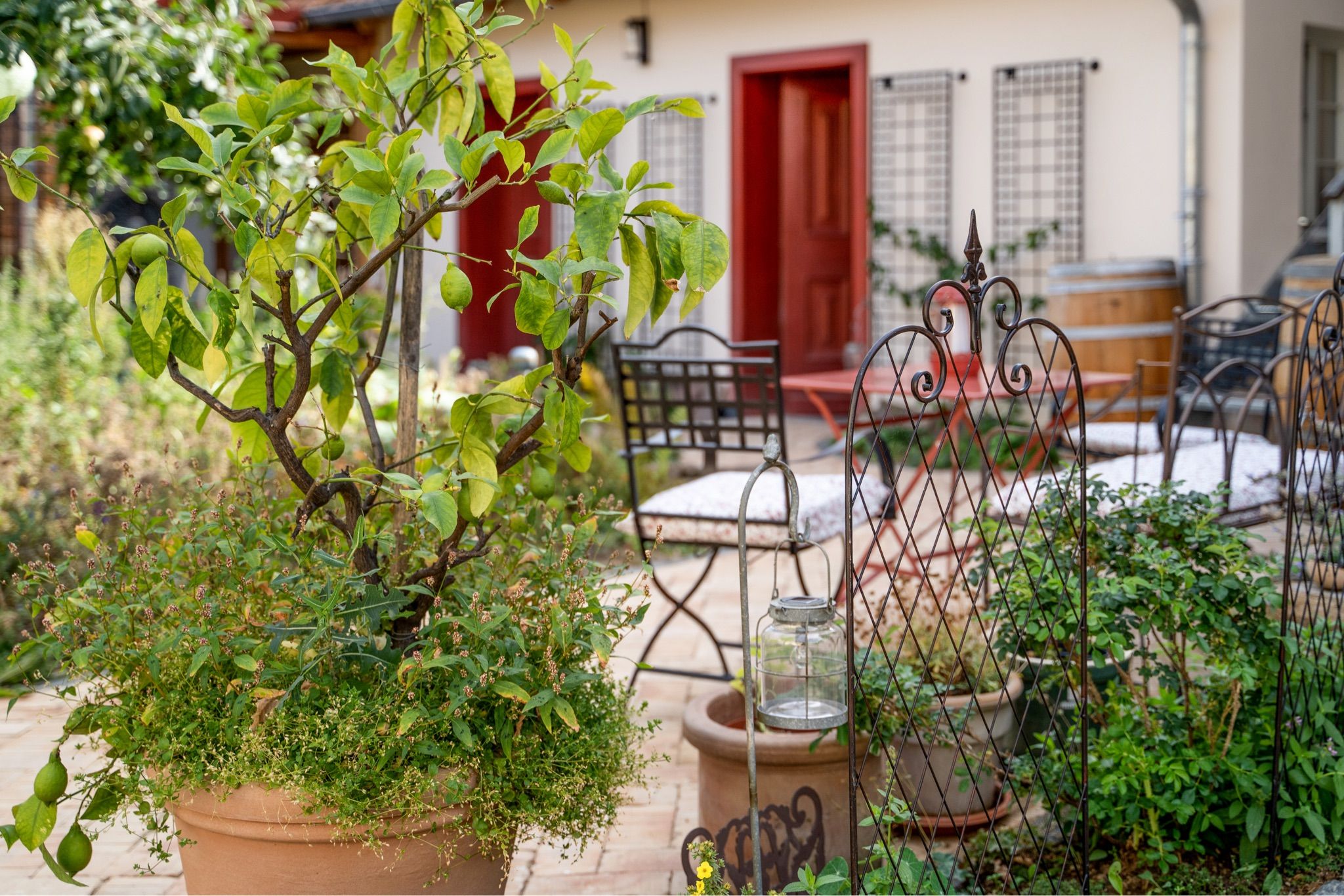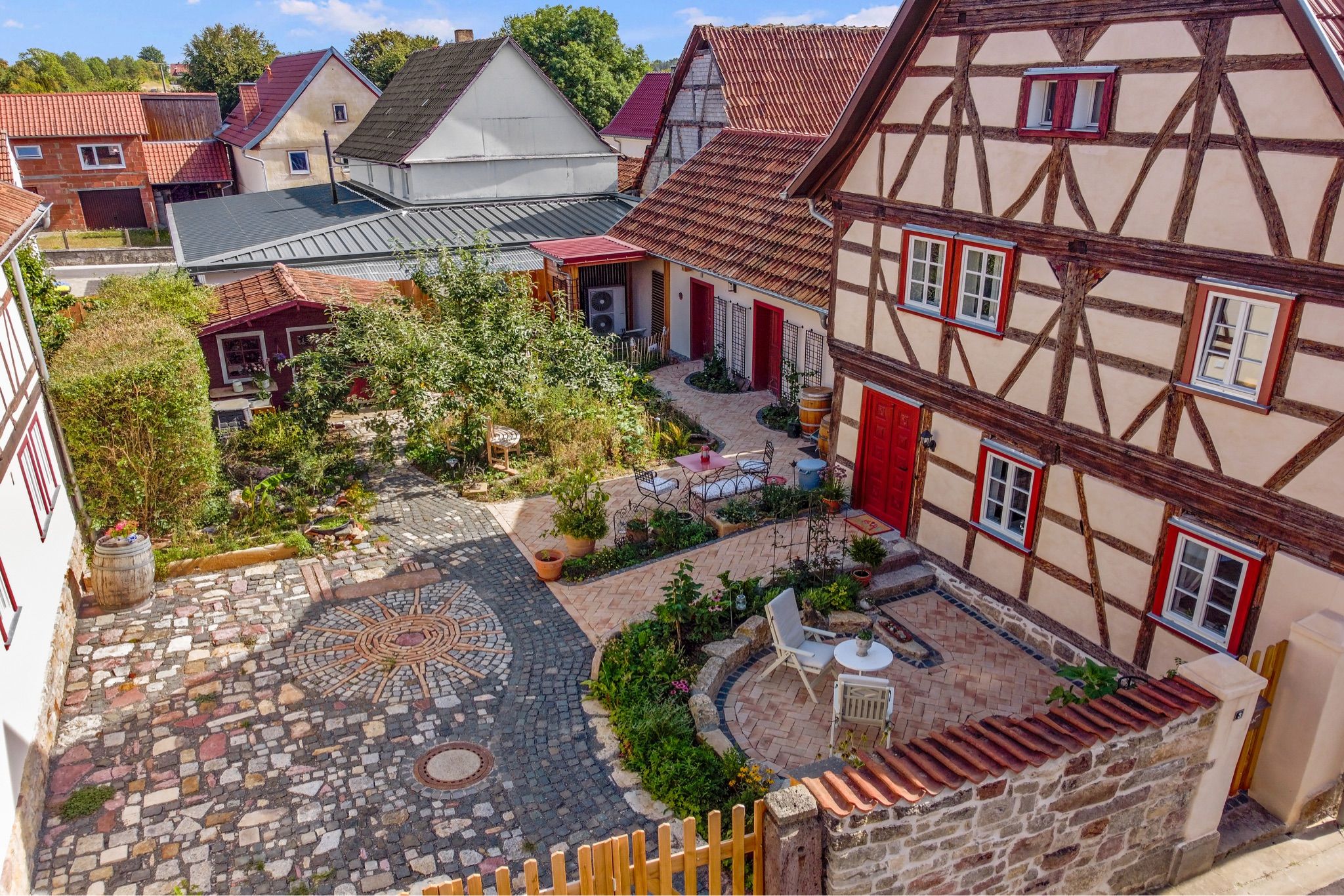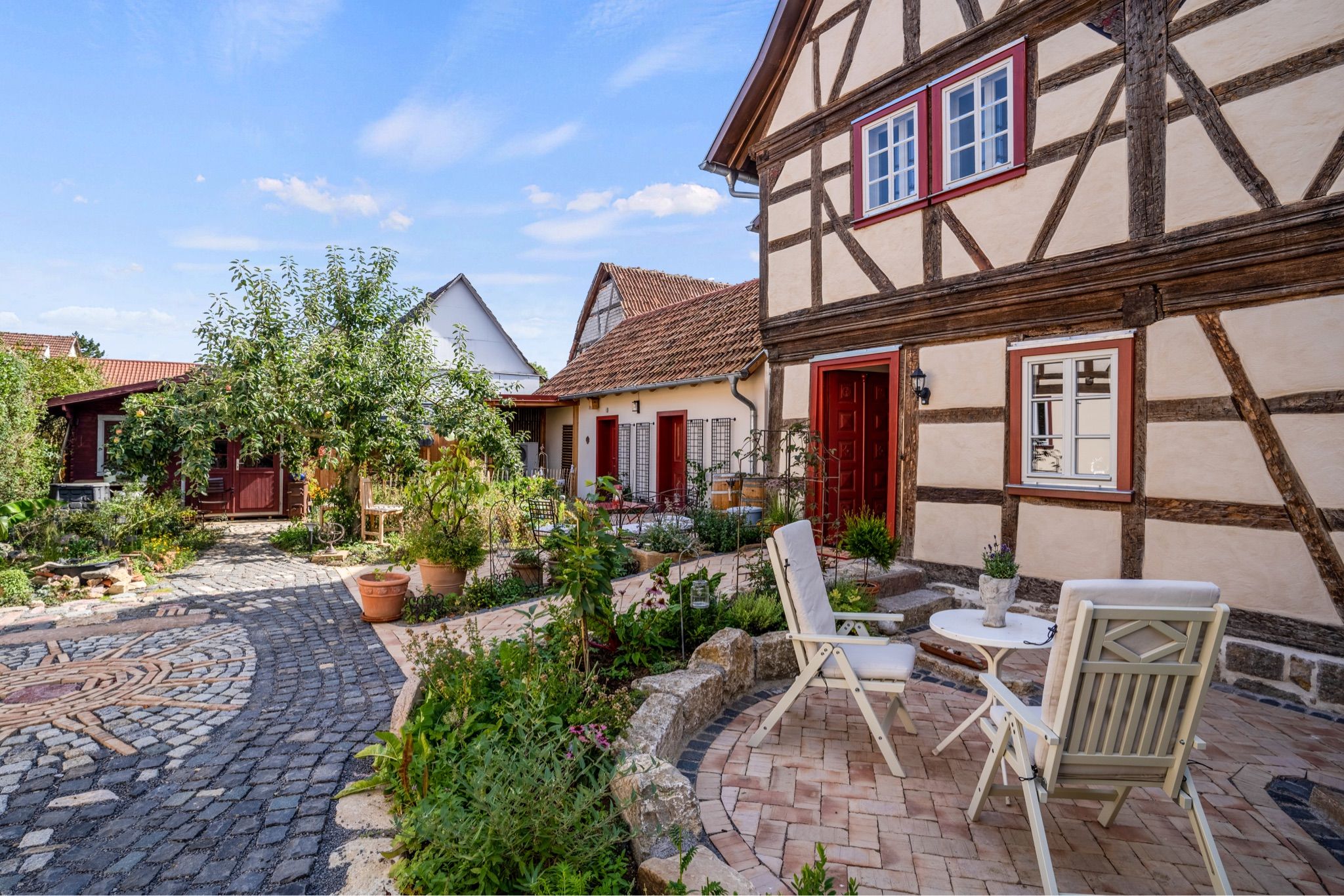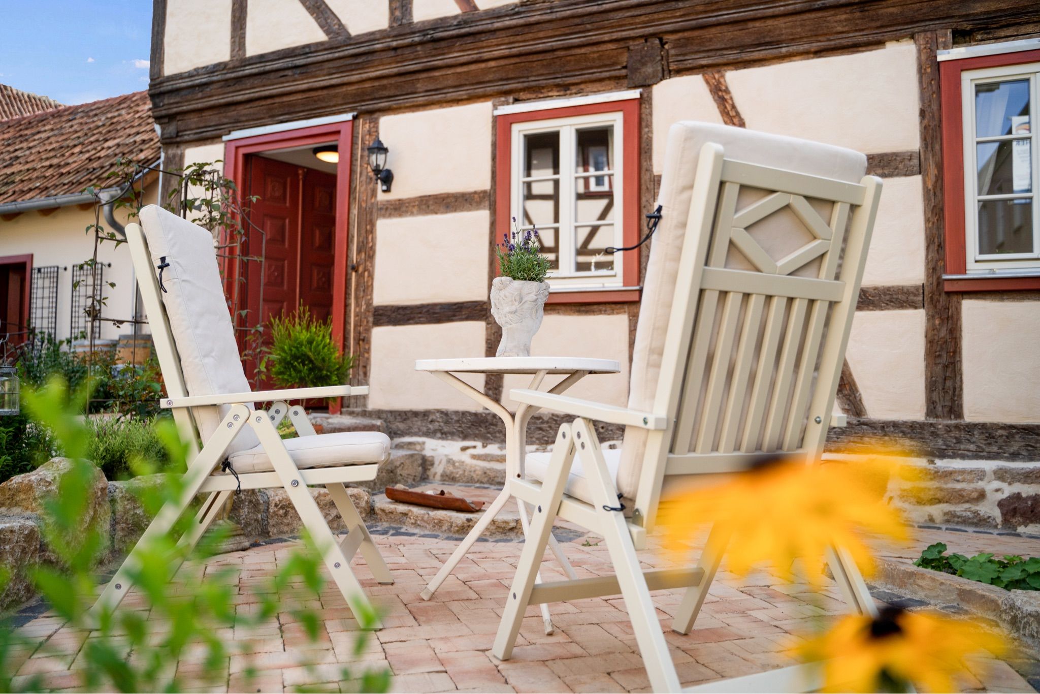 Aus dem Wohnzimmer blicken Sie auf den Vorplatz vor dem Haus, wo Ihr persönlicher Sitzplatz mit Tisch und zwei Stühlen auf Sie wartet. Genießen Sie hier ein entspanntes Frühstück im Sonnenschein oder laue Sommerabende mit Blick in den geschmackvoll bepflanzten Hof- und Gartenbereich, der mit viel Liebe zum Detail gestaltet wurde.