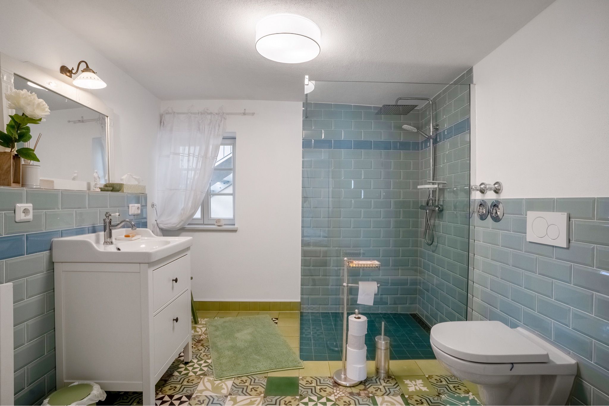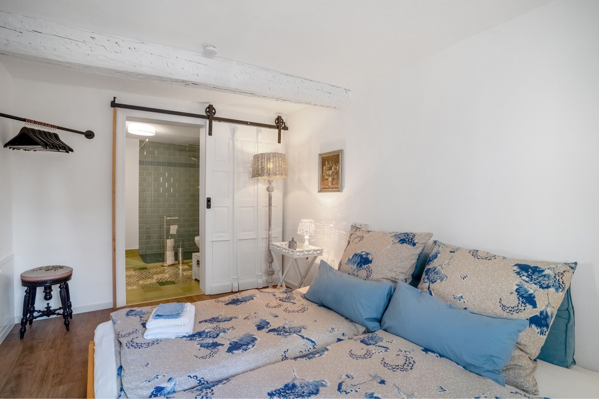 Angrenzend befindet sich das Schlafzimmer mit einem großen, bequemen Doppelbett (1,80 m x 2 m, offenes Fußteil), einer Garderobe und einem Kleiderschrank. Vom Schlafzimmer aus gelangen Sie direkt ins moderne Bad, das mit WC, Waschbecken und einer großzügigen, bodengleichen Dusche ausgestattet ist.