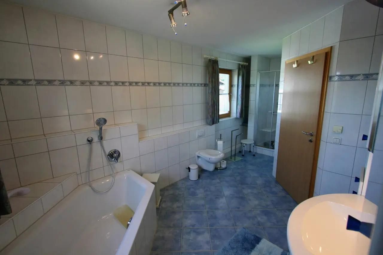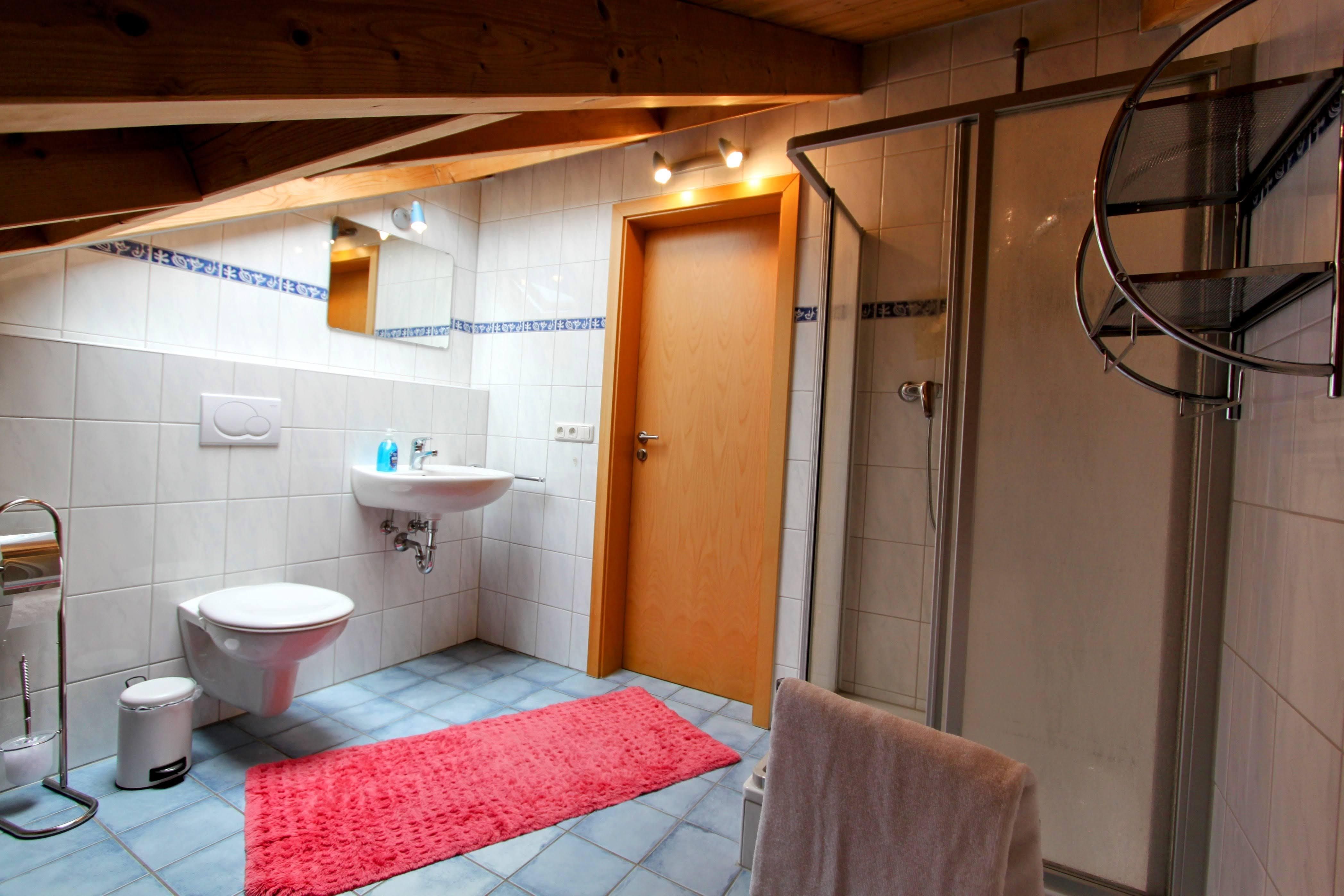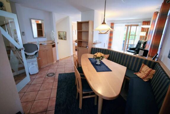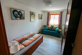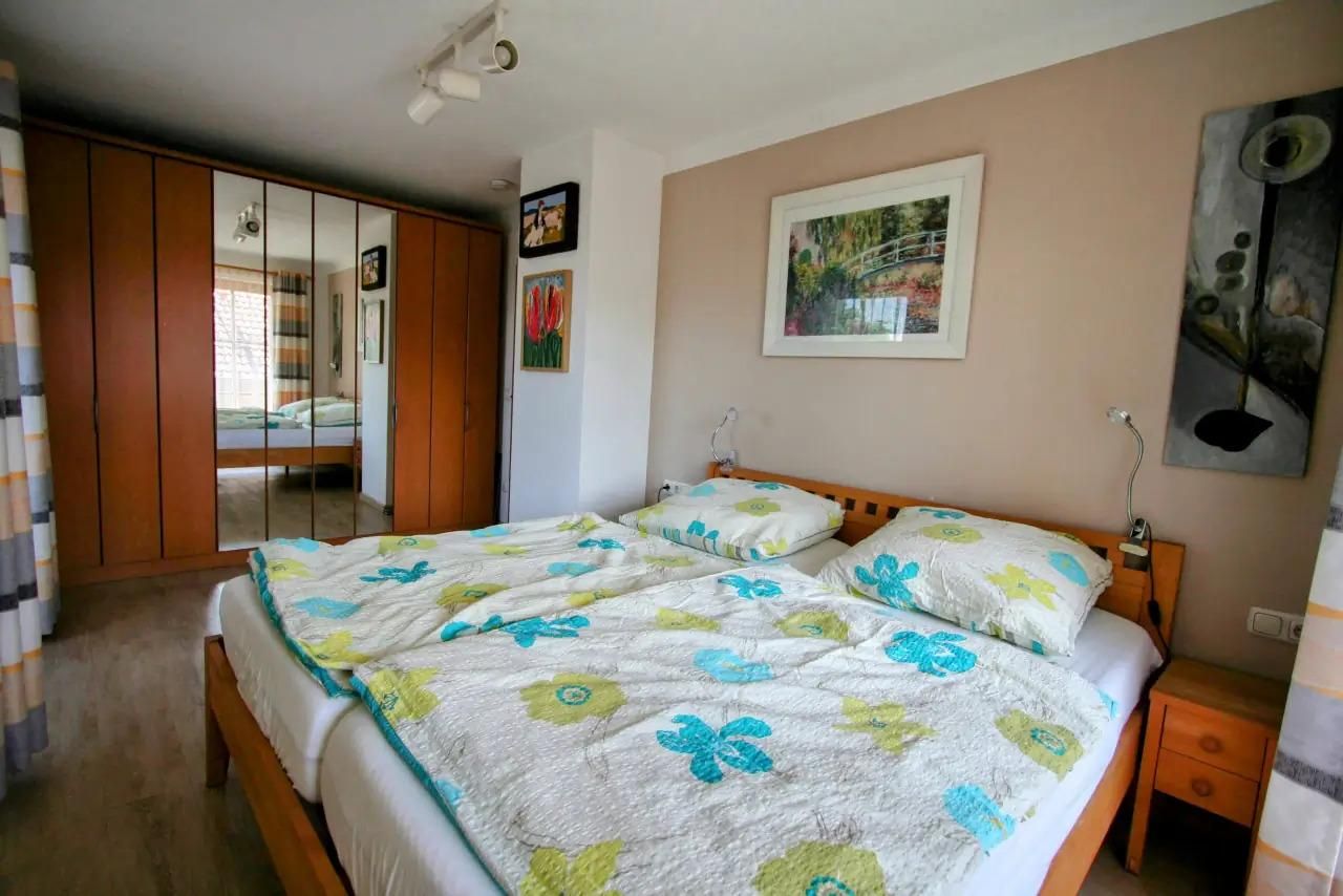 Obergeschoss: Zwei Schlafzimmer bieten Platz für bis zu 5 Personen. Das Hauptschlafzimmer (15qm) mit 1,8m x 2m Doppelbett, großem Kleiderschrank und SAT-TV hat Zugang zu zwei Balkonen (Süd- und Ostseite). Das zweite Schlafzimmer (12qm) ist flexibel mit Einzelbett und ausziehbarer Schlafcouch eingerichtet. Das große, helle Badezimmer (12qm) mit Badewanne und Dusche ist barrierefrei mit Sitz- und Haltehilfen ausgestattet.