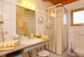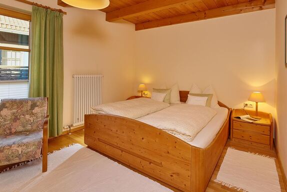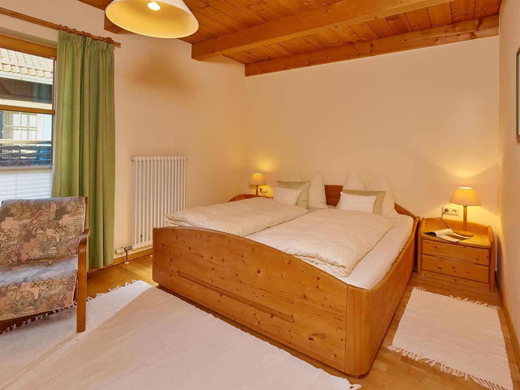 Freundliche mit Naturholzmöbeln eingerichtete Ferienwohnung im 1. Obergeschoss mit Südbalkon, bestehend aus Schlafzimmer, Wohnzimmer, Küche, Bad mit DU/WC, Flur und extra Gaderobe.