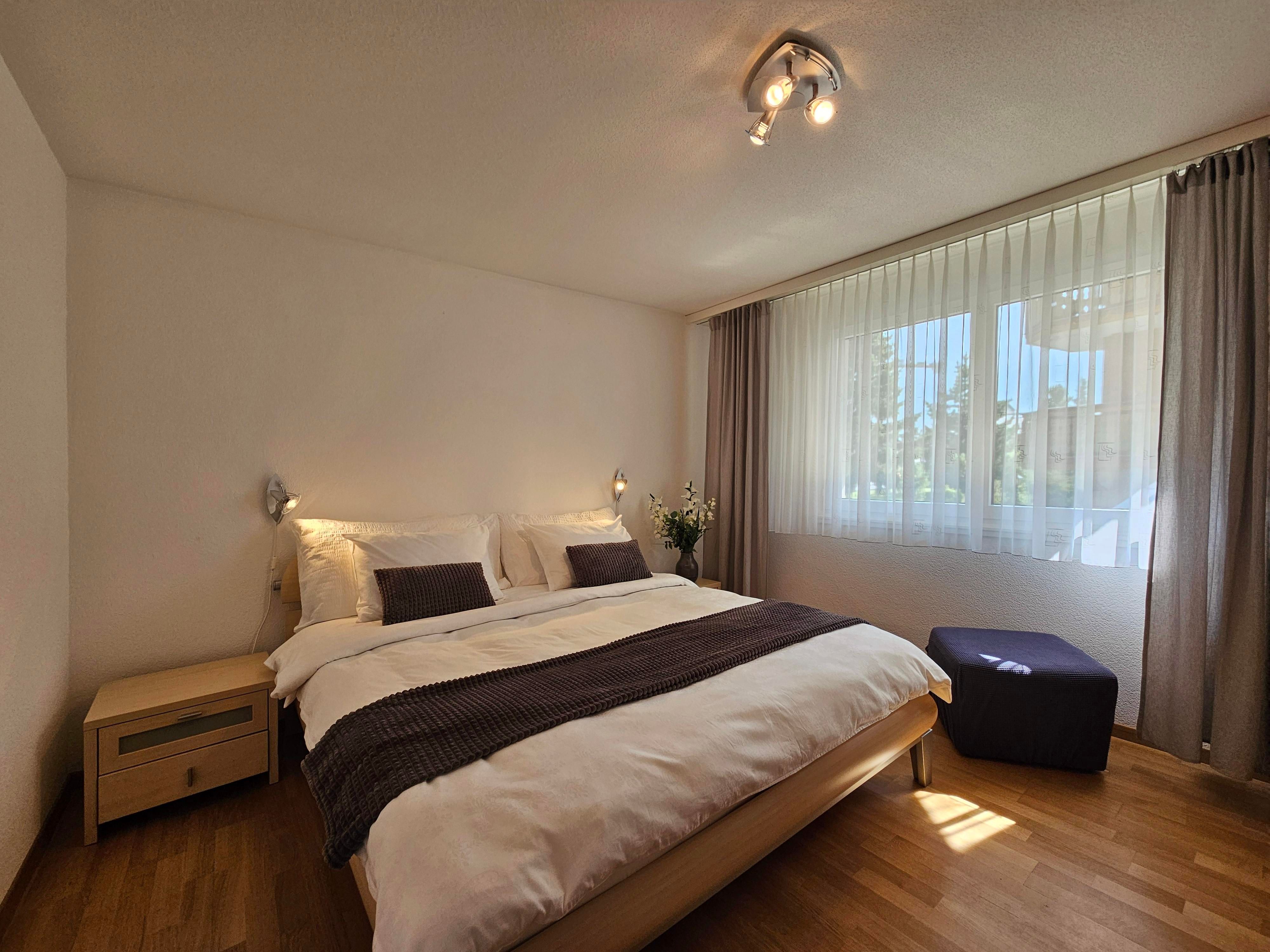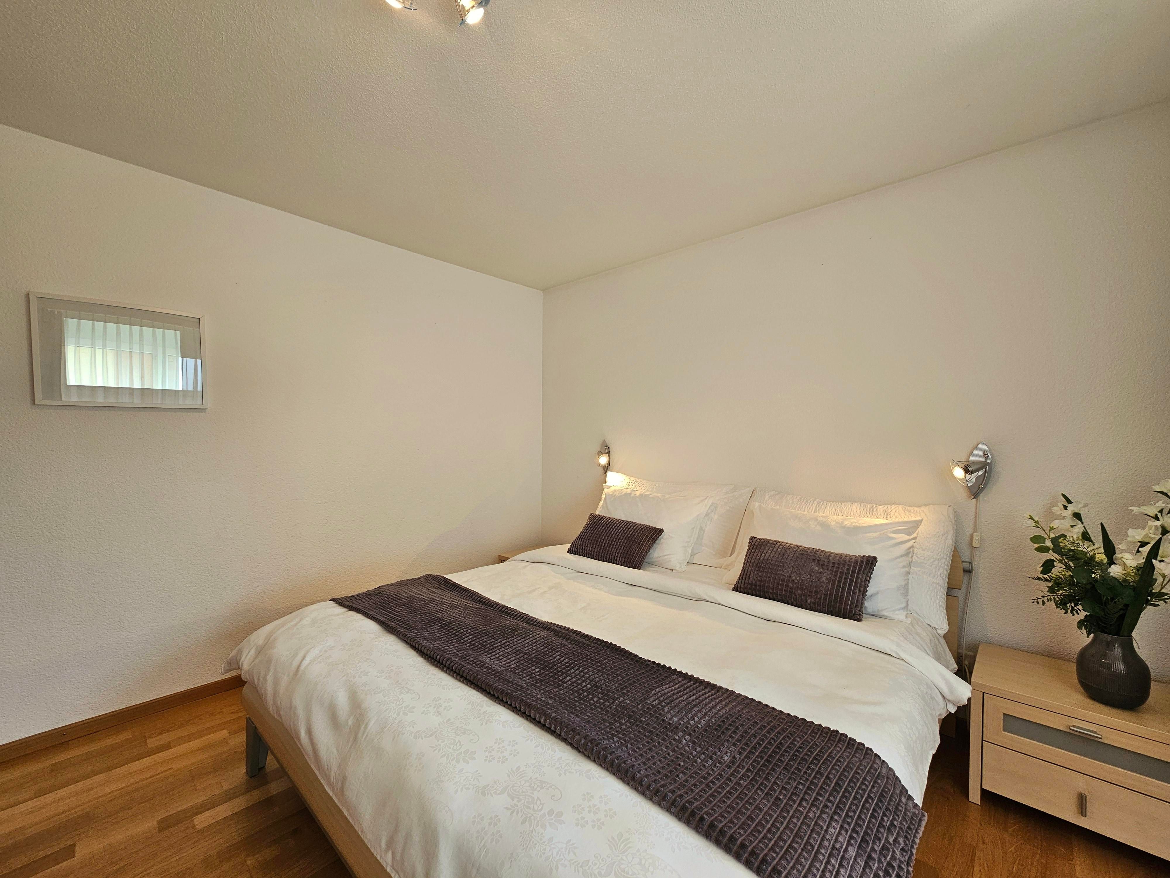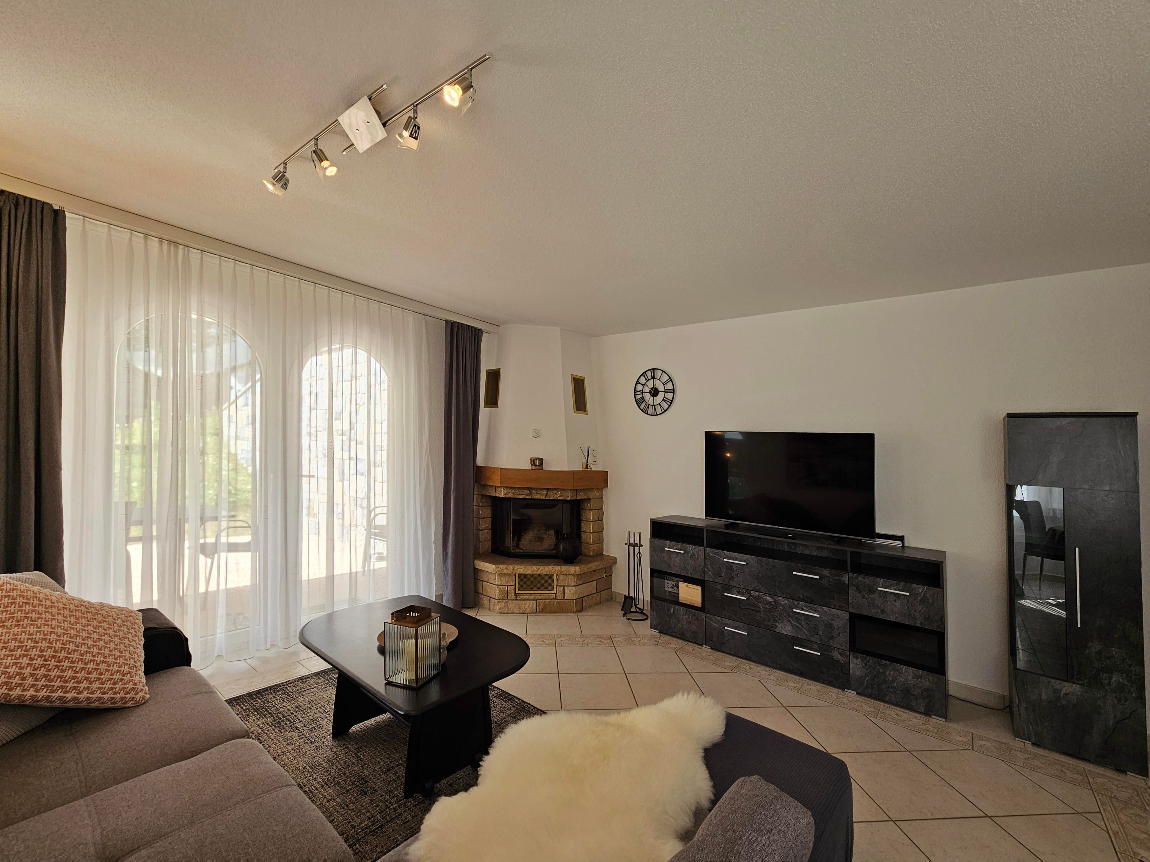 Die grosse Wohnung verfügt über 1 Schlafzimmer mit Doppelbett. Das Badezimmer verfügt über eine Badewanne, Toilette und Waschbecken. Die Küche ist sehr gut ausgestattet und bietet mit der Essecke viel Platz. Im grossen Wohnzimmer hat es ein Schlafsofa, wo zusätzliche 2 Personen schlafen können. Highlight ist auch der gemütliche Kamin im Wohnzimmer. Die Wohnung hat zudem eine Terrasse mit Tisch und Stühle.