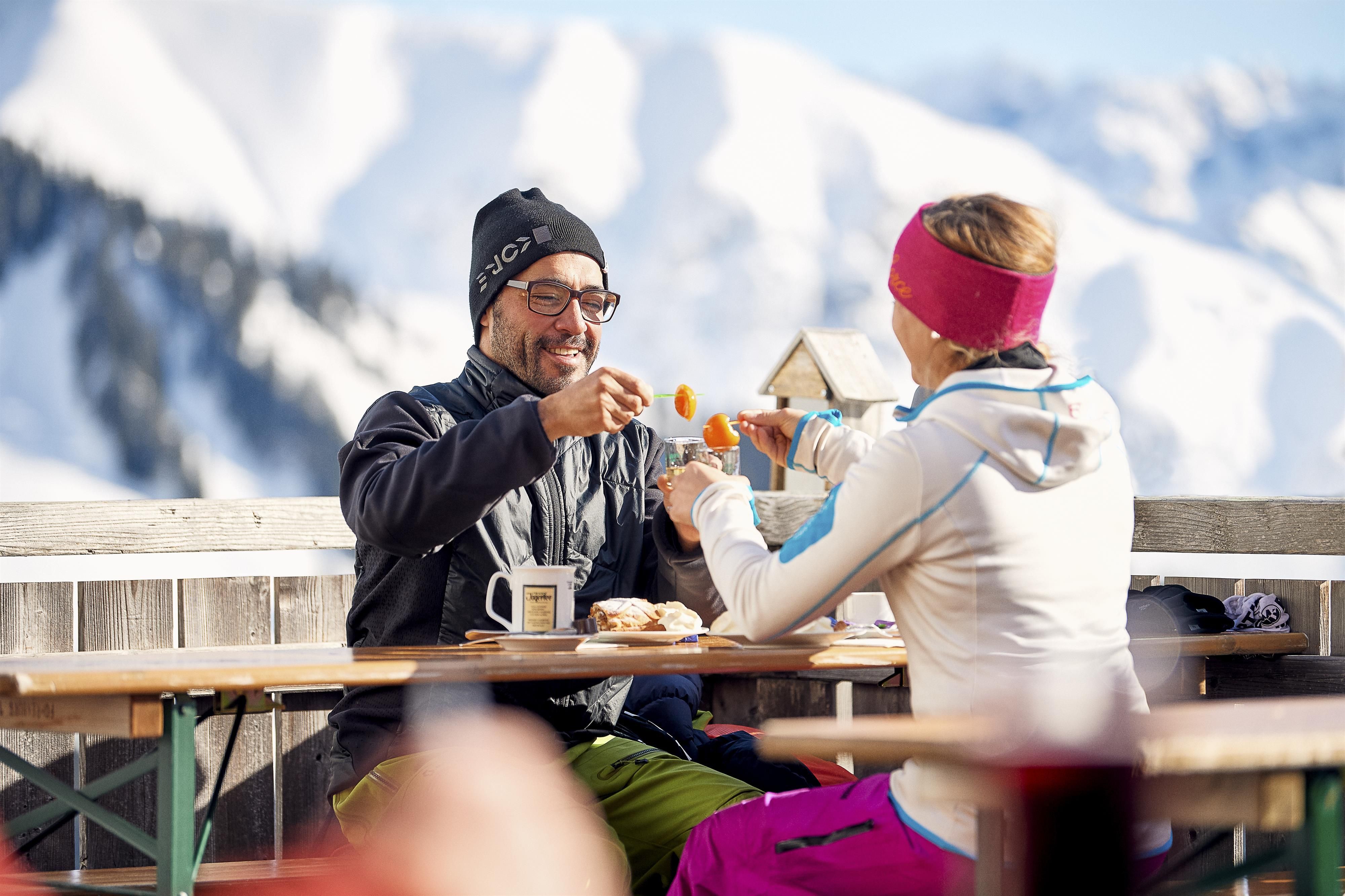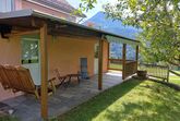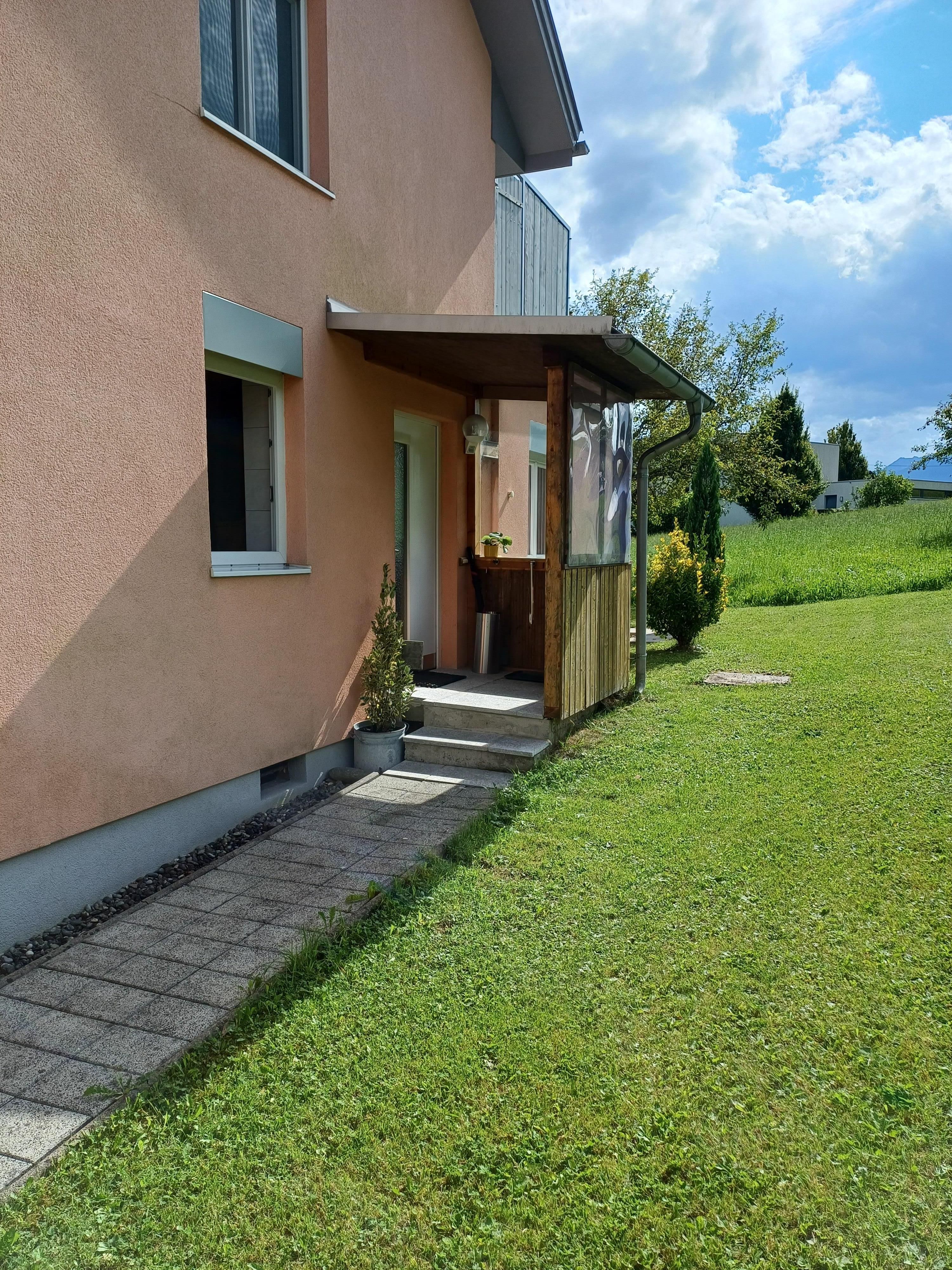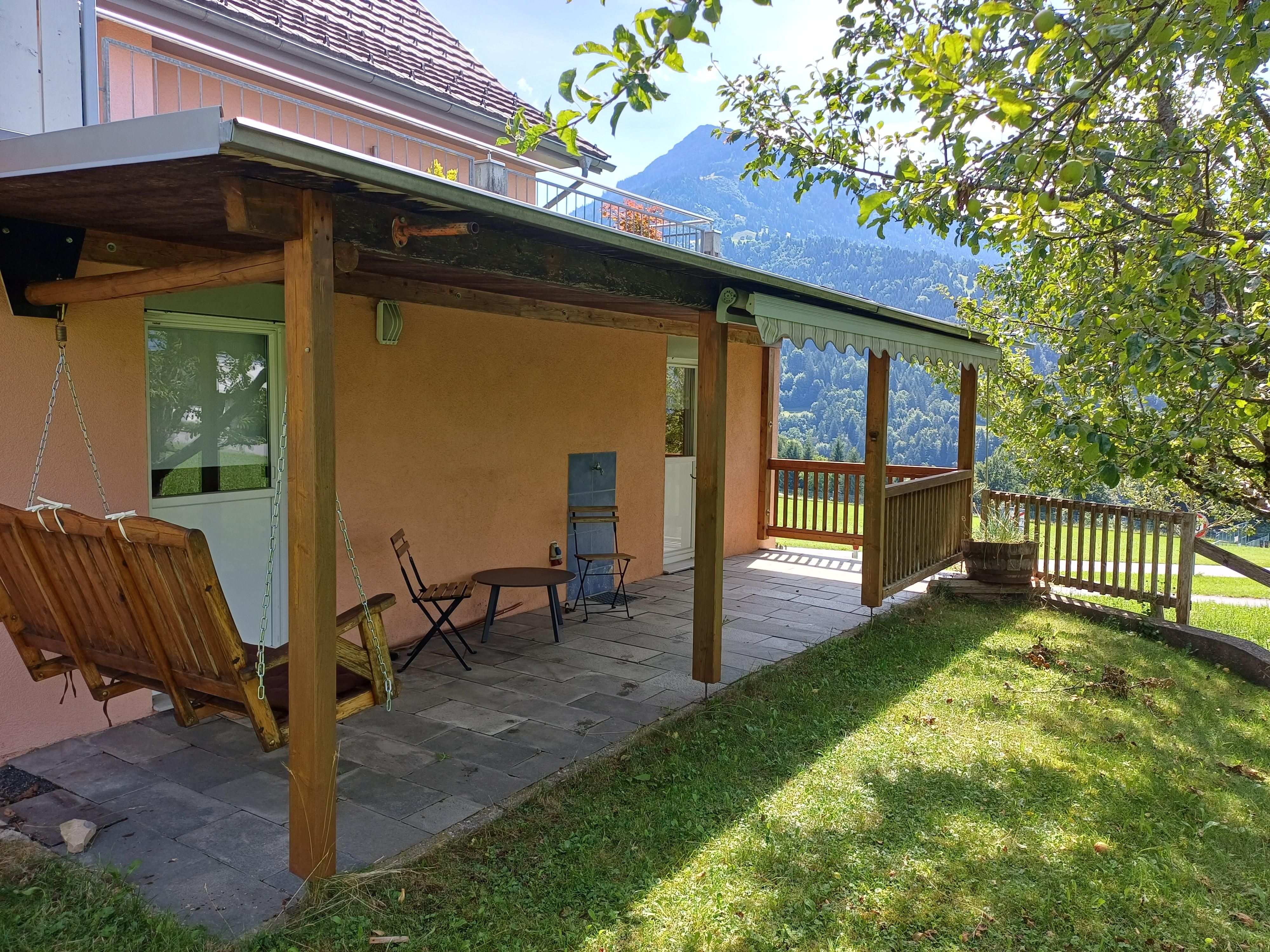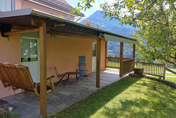 Die schattige, überdachte Terrasse liegt im Süd-Westen und bietet ab Mittag über den NM bis hin zum Abend Sonne. Ausgestattet mit Markise, Stühlen, einem kleinen Tisch und einer Hollywoodschaukel, lädt sie zum gemütlichen Verweilen ein.