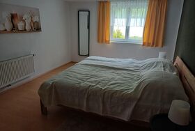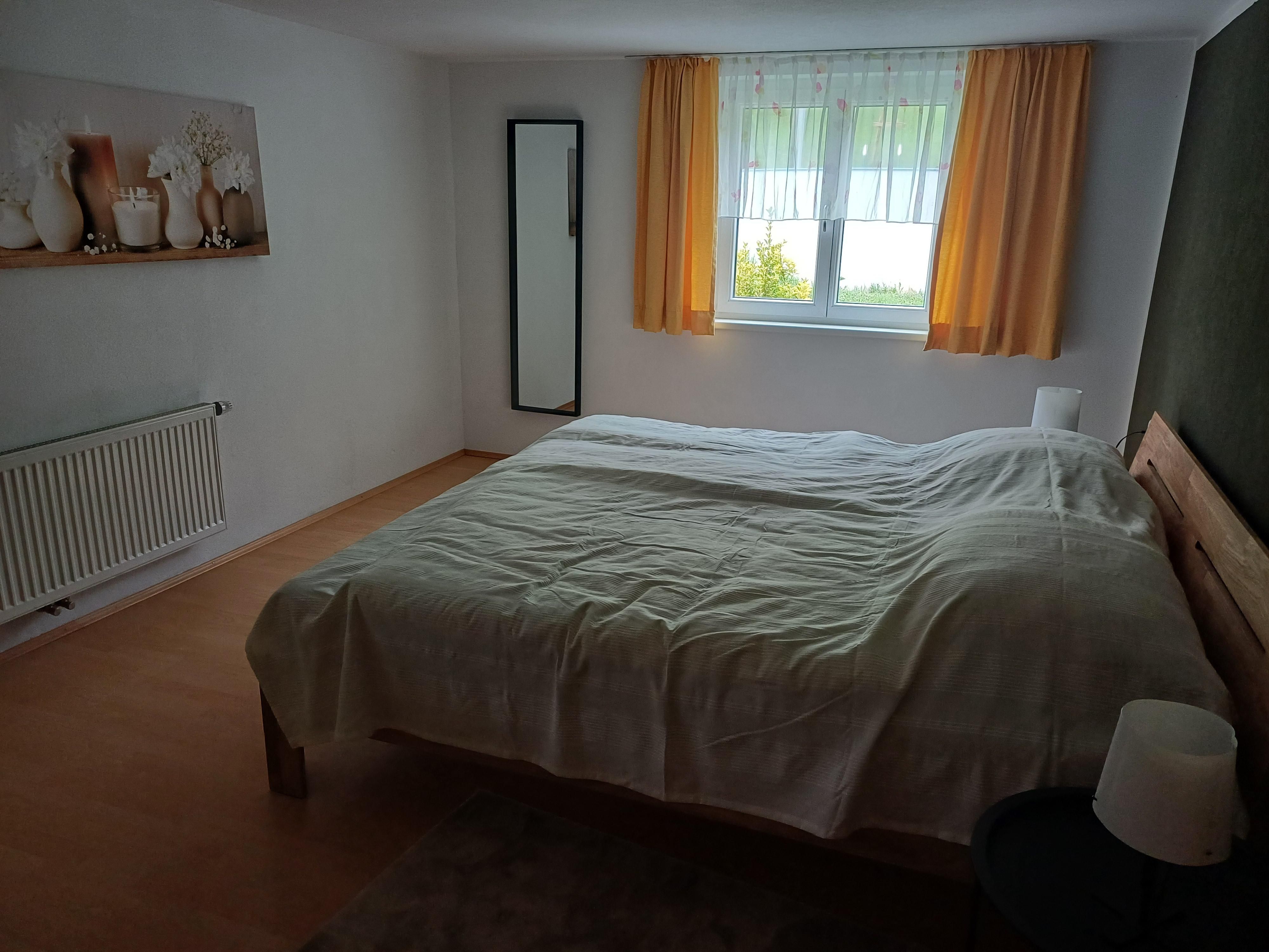 Weiters gibt es ein Doppelbettschlafzimmer mit gemütlichem Wohlfühlambiente. Es bietet einen Schrank mit Kommode und einen seperaten hohen Spiegel. Über eine eigene Terrassentüre gelangen sie vom Schlafzimmer aus ebenfalls direkt auf die Terasse.