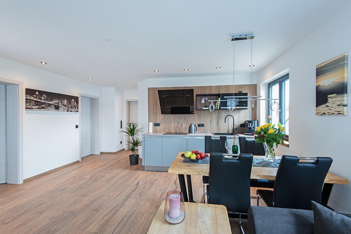 Die Ferienwohnung befindet sich im Erdgeschoss. Der Eingangsbereich besteht aus einem urigen sowie modernen open Space Bereich mit Wohnlandschaft sowie Essecke und einer modernen und voll ausgestatteten Einbauküche.