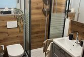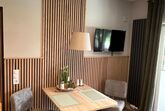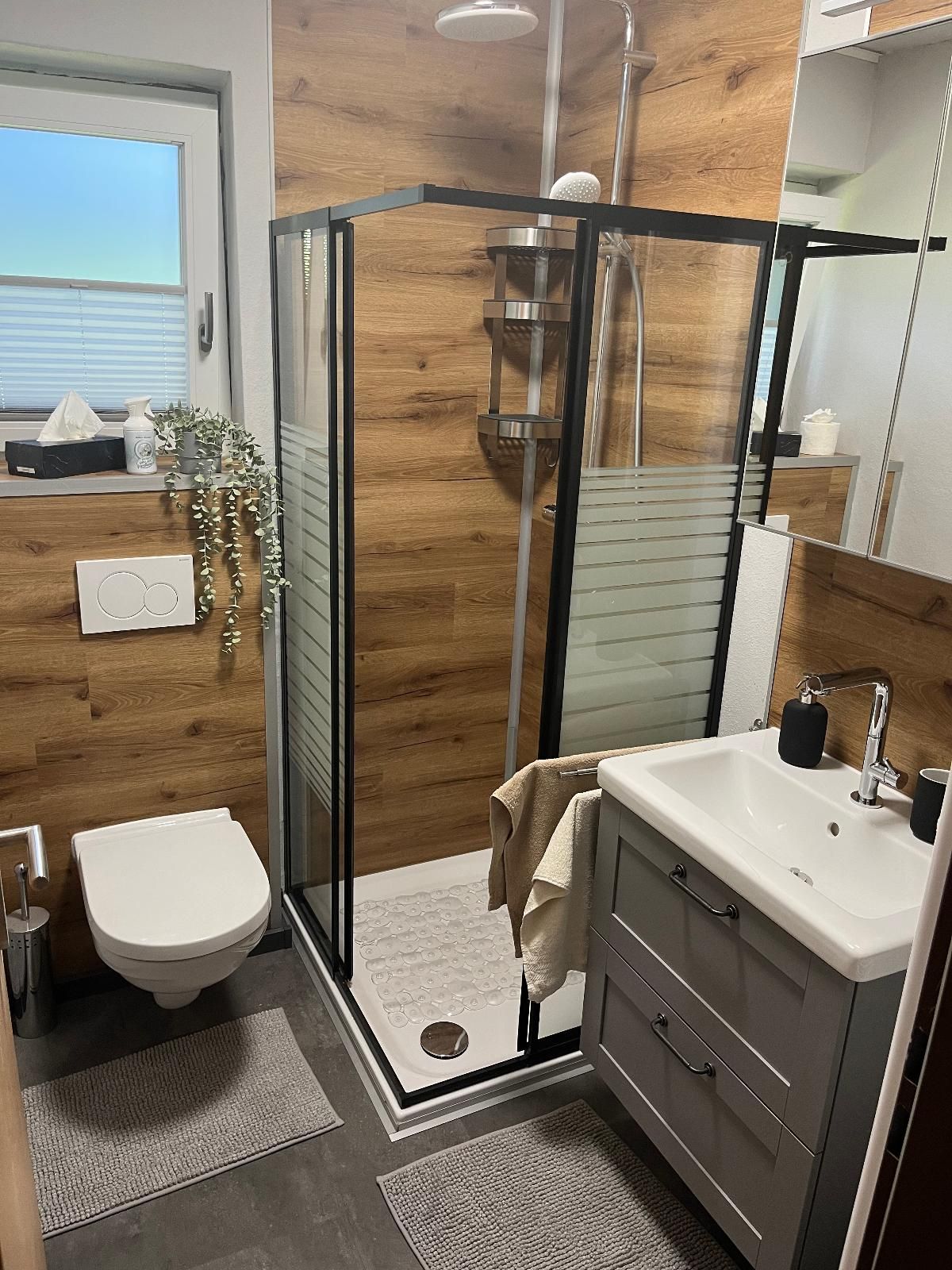 gemütliche Sitzecke. Es gibt ein Badezimmer mit Dusche und WC. Das