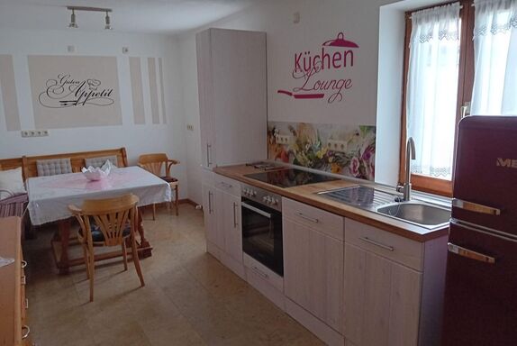 Der großzügige Wohnbereich ist mit einer bequemen Couch, einem Fernseher und einem heimeligen Ofen ausgestattet – perfekt für entspannte Abende. Die voll ausgestattete Küche mit gemütlicher Sitzecke lädt zum gemeinsamen Kochen und Verweilen ein.