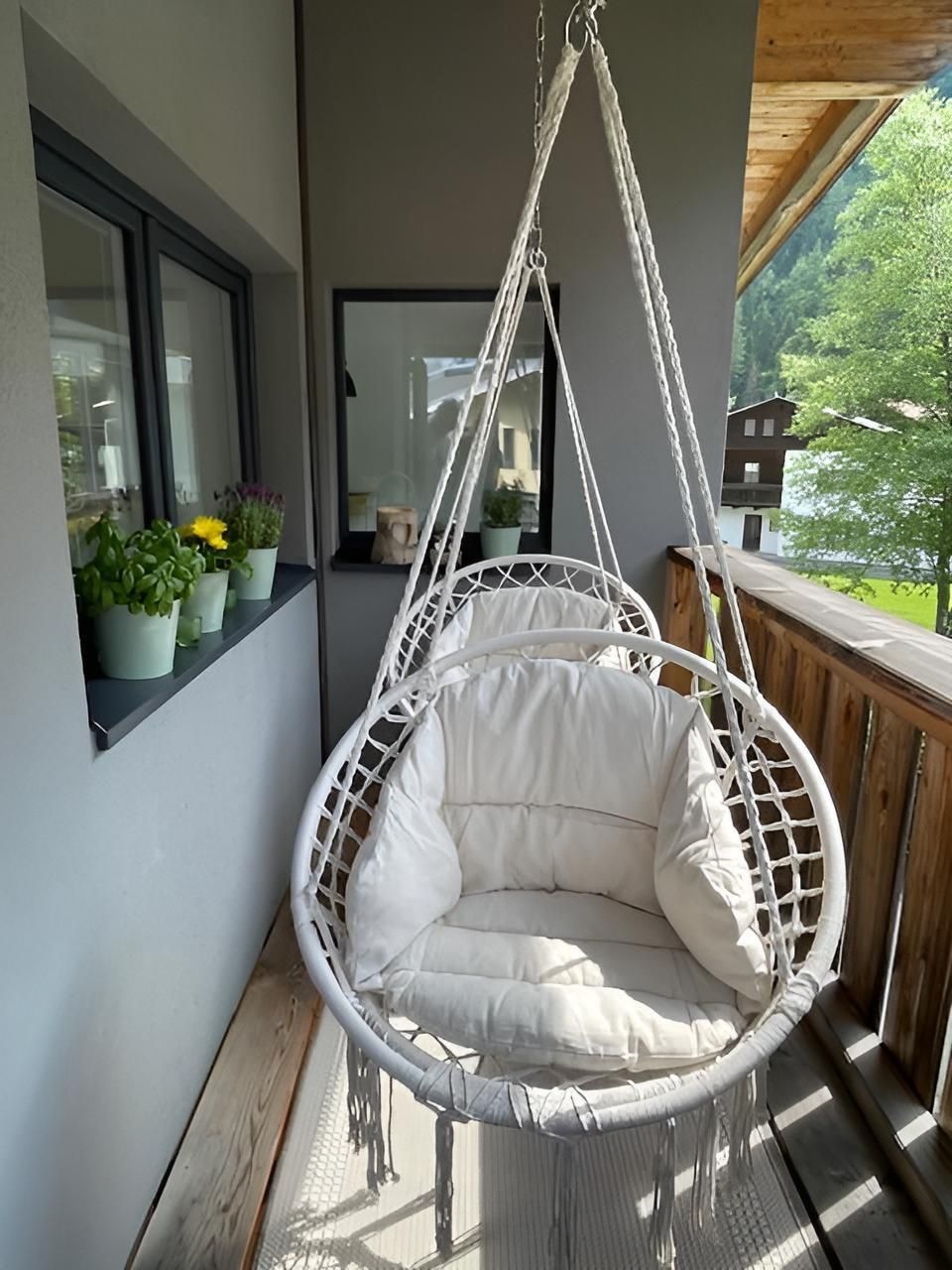 2 Lounge-Hängesessel sowie ein kleiner Tisch mit 2 Stühlen laden für gemütliche Stunden.