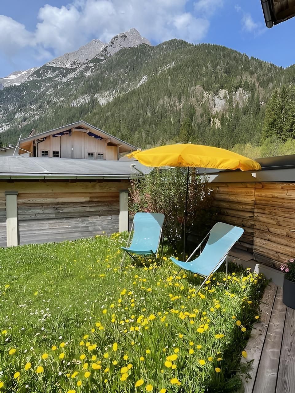 Der Garten bietet einen traumhaften Blick in die Berge des Wettersteingebirges. Schattenspendende Bäume, einen wettergeschützten Sitzplatz sowie Tisch und Stühle, Liegestühle und Sonnenschirm laden für gemütliche Stunden ein.