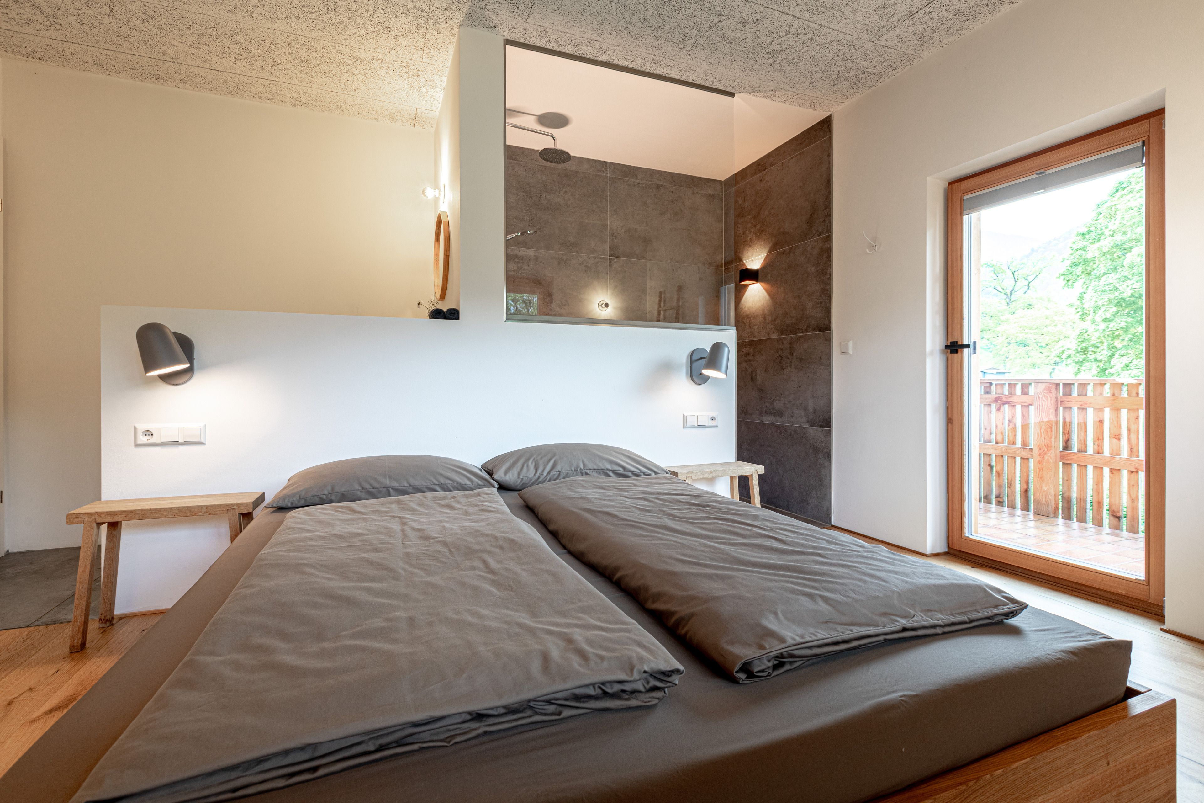 Das Schlafzimmer mit integriertem Bad setzt die offene Gestaltung fort und sorgt für ein luftiges Wohngefühl. Der großzügige L-förmige Balkon, der von zwei Seiten zugänglich ist, lädt ein, entspannte Stunden in der Morgen- oder Abendsonne zu verbringen.