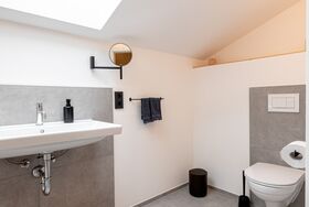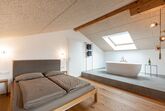Das Schlafzimmer ist mit einem komfortablen Doppelbett (1,60 x 2,00 m) ausgestattet und überrascht mit einer freistehenden Badewanne für entspannte Momente. Das angrenzende Badezimmer verfügt über eine großzügige Regendusche, einen Schminktisch und WC.
