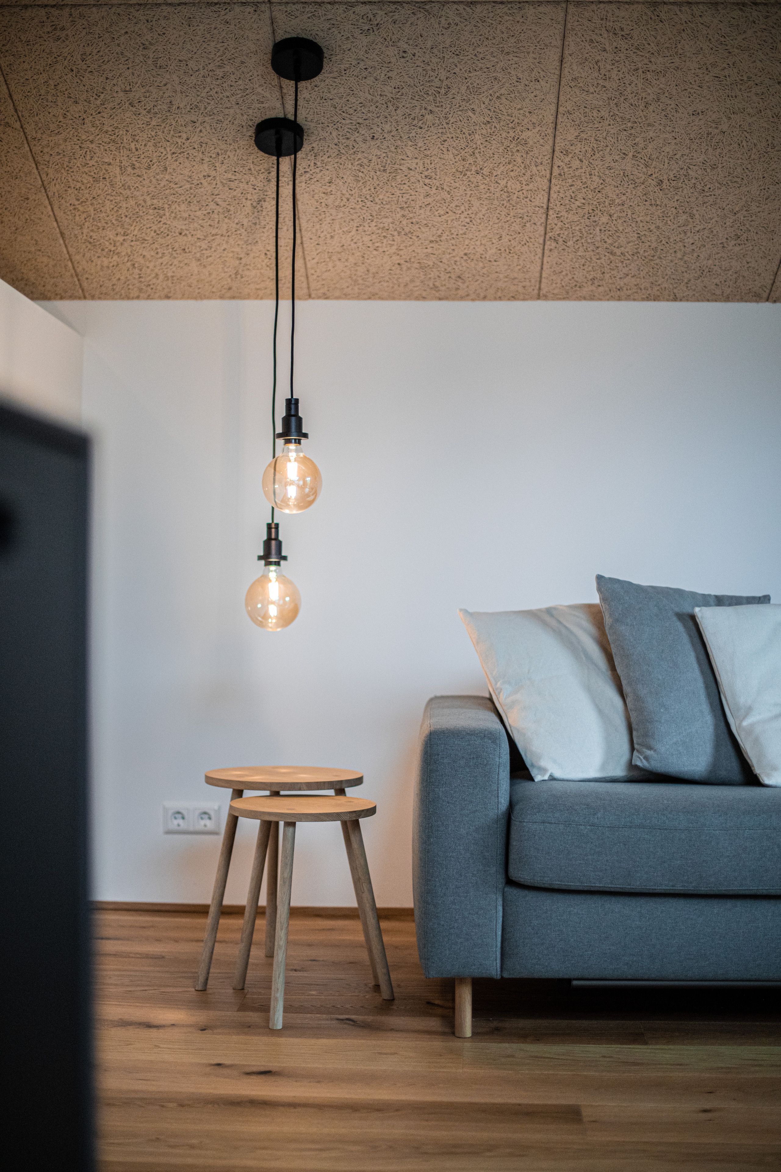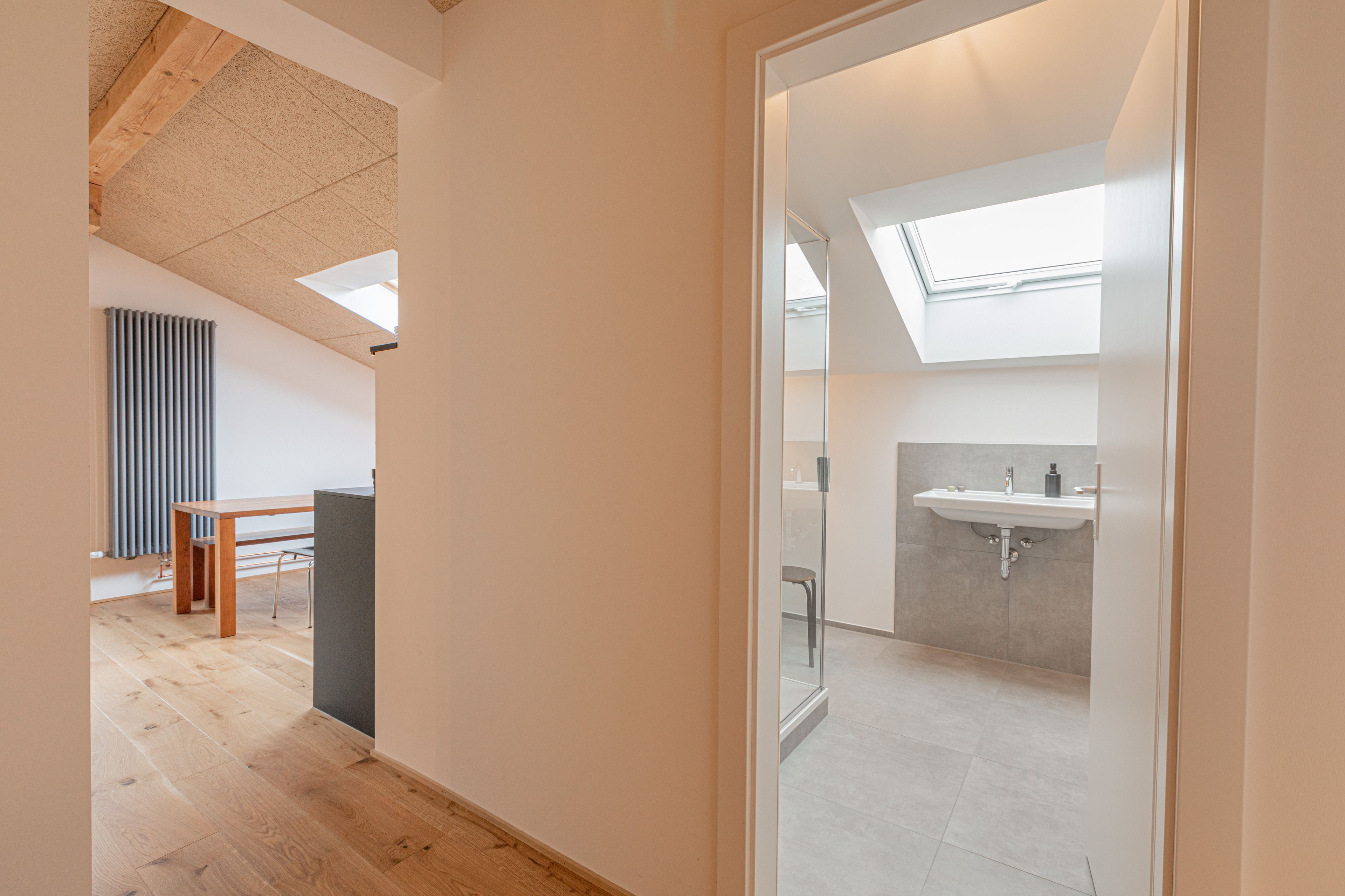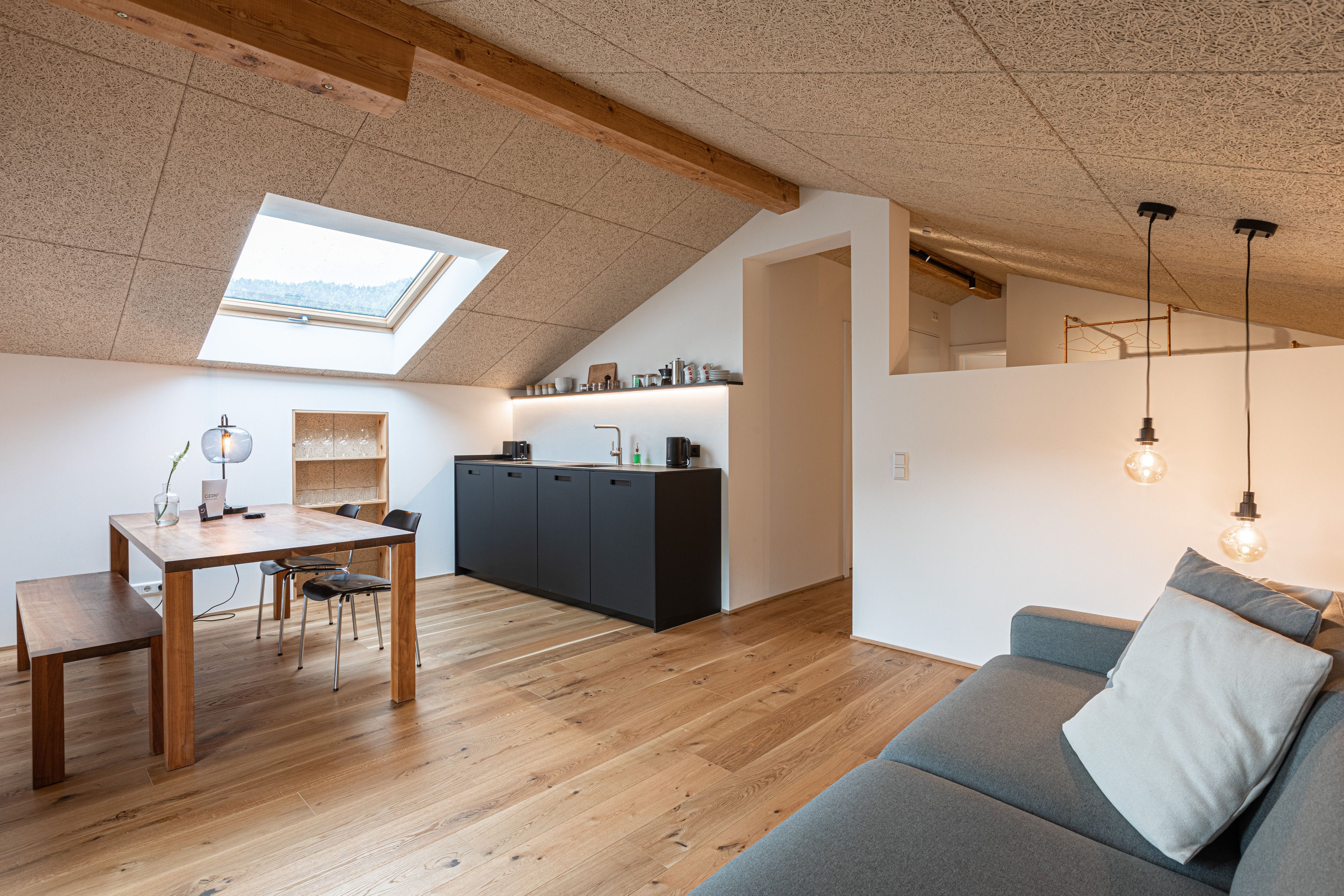 Die Wohnung Weitblick im 2. Obergeschoss besticht durch lichtdurchflutete Räume und einen unvergleichlichen Ausblick auf das Bergpanorama, insbesondere die Hochplatte. Auf 70 m² bietet sie Platz für bis zu vier Personen – ideal für Paare oder Familie.