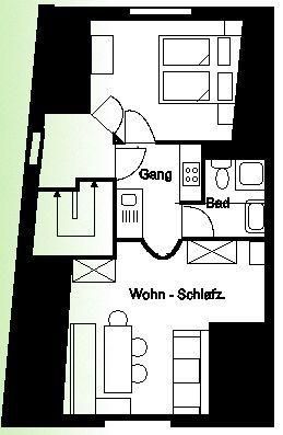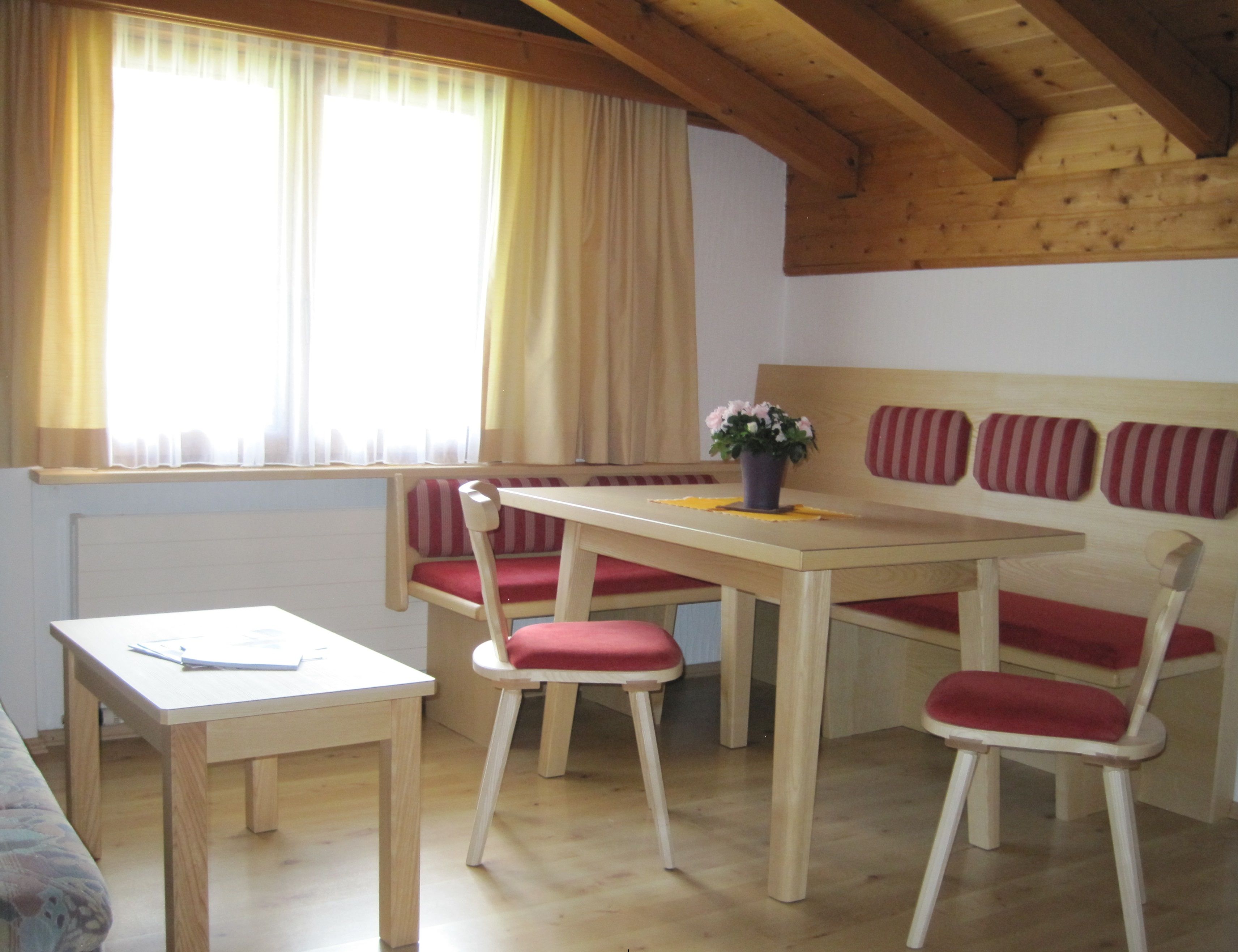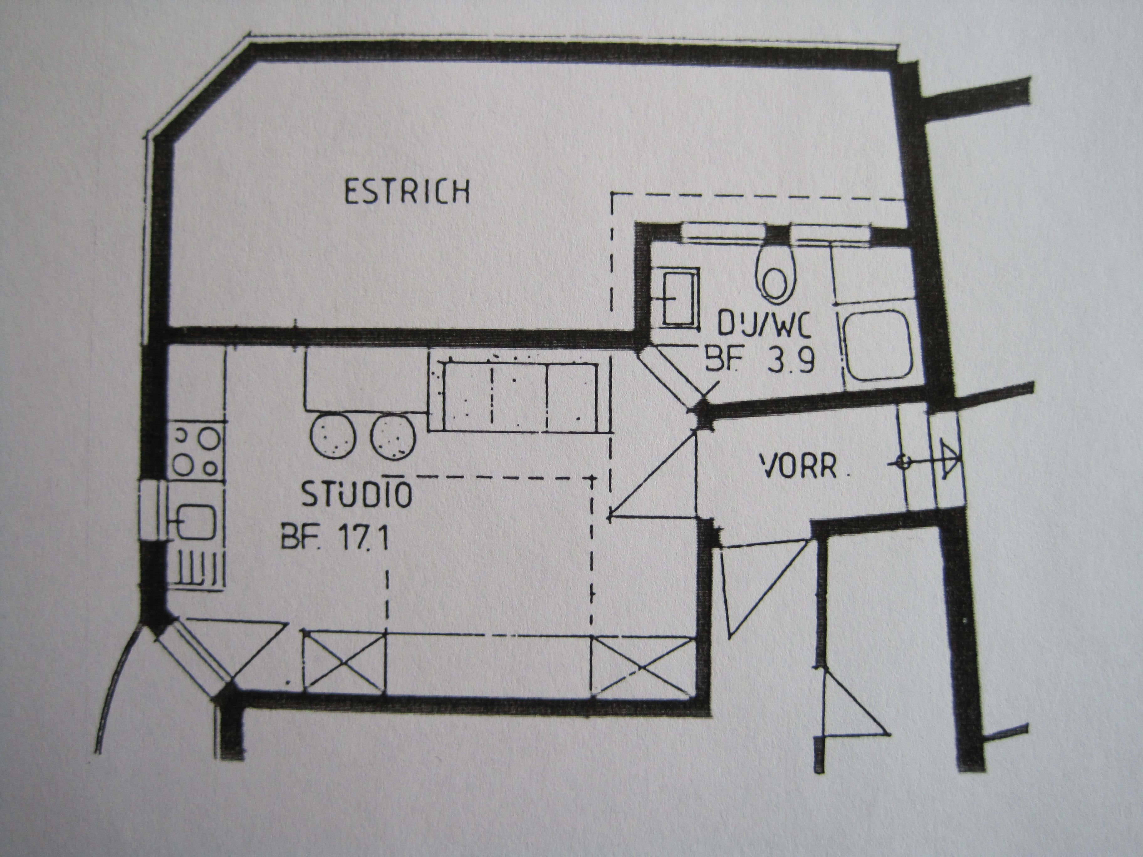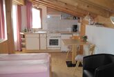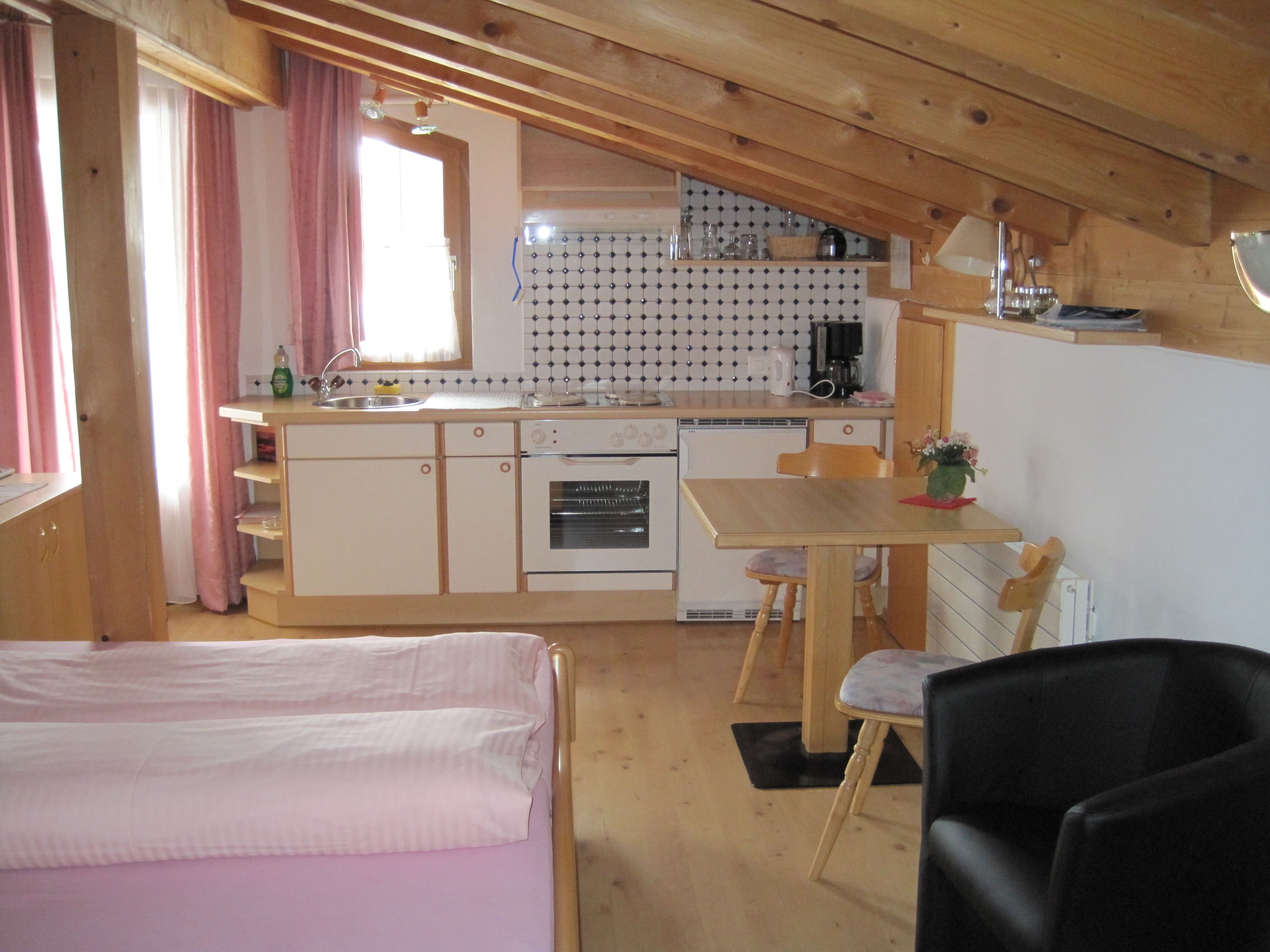 Unser Studio für 2 Pers. ( Nr. 4) ist eine kleine Dachwohnung und besteht aus: Wohn-Schlafz. mit Doppelbett – Kochnische ( Herd mit 4 Kochplatten, Backofen, Filter-Kaffeemaschine, -Esstisch mit 2 Stühlen und ein Ruhesessel, Dusche/WC - Haartrockner, Radiowecker, Balkon.