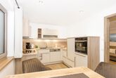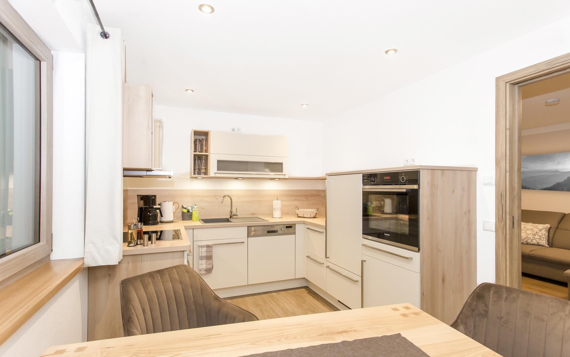 Die Ferienwohnung ist mit einer großzügigen Küche inkl. Essecke eingerichtet. zur Ausstattung zählt ein Kühlschrank, ein Backofen, Induktionskochfeld, Spülmaschine, einer Erstausstatttung an Kaffeepulver, Kaffeefilter, Tee, Salz/Pfeffer, Essig/Öl, Zucker und Reinigungsmitteln. Im barrierefreien Bad steht Ihnen ein Föhn sowie ein Satz Handtücher pro Person zur Verfügung.