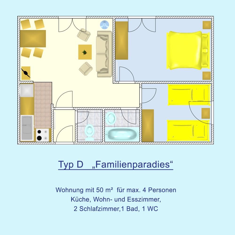 • 2 Schlafzimmer (1x Doppelbett und 2x Einzelbetten)
