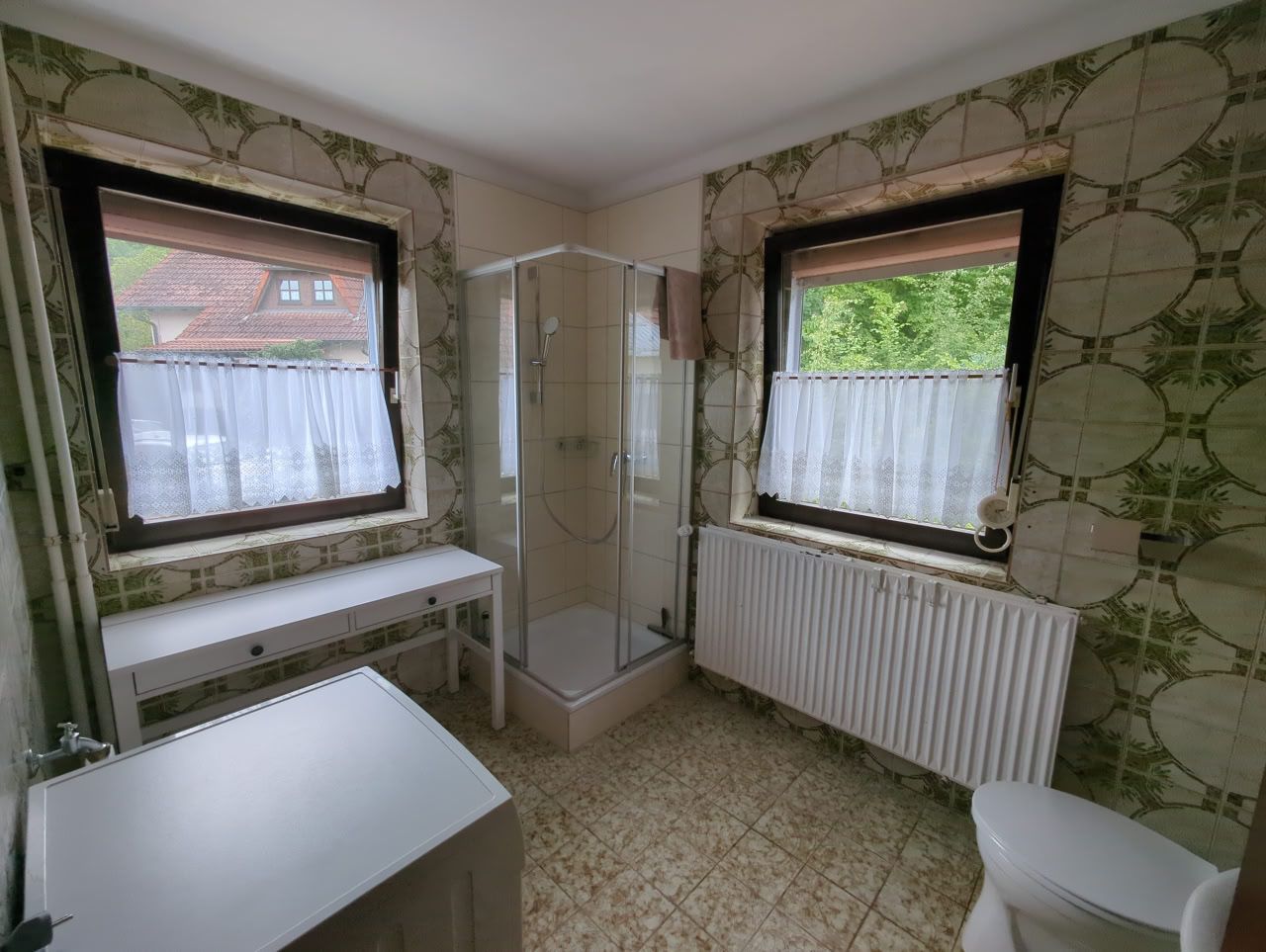 Die beiden Badezimmer sind jeweils mit einer Dusche, einem Waschbecken und einem WC ausgestattet. Im größeren Bad ist eine Waschmaschine vorhanden.