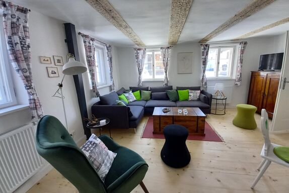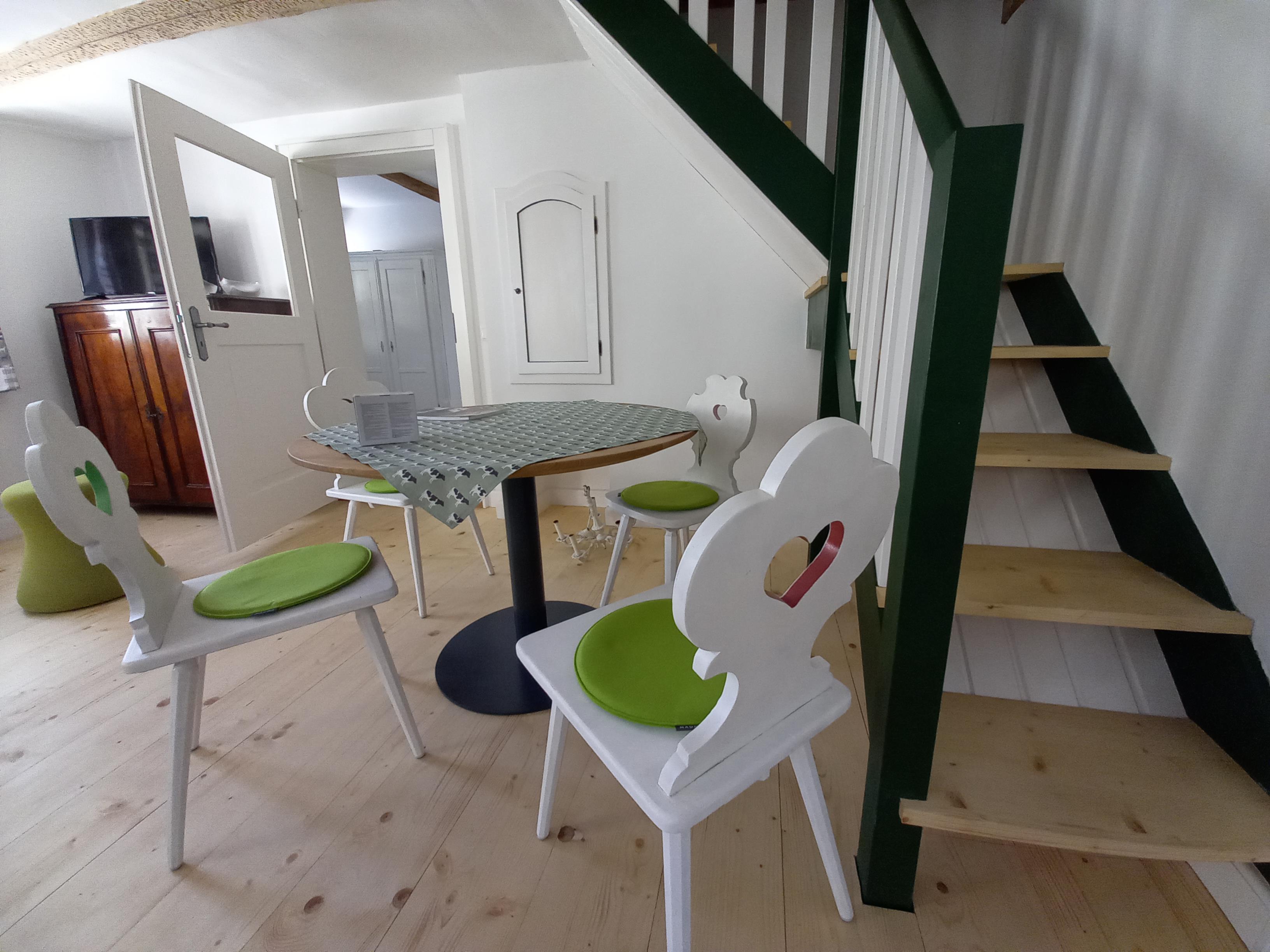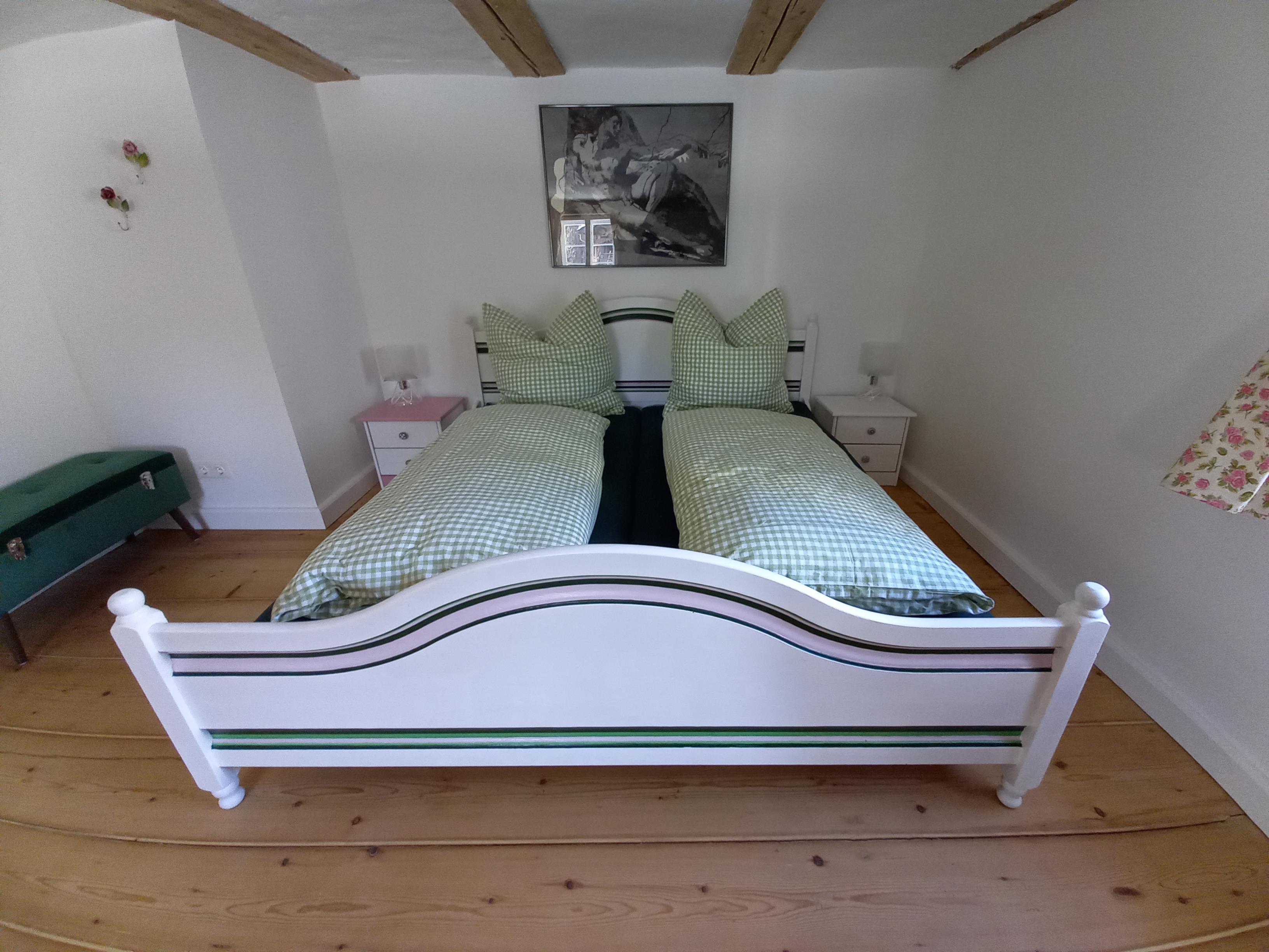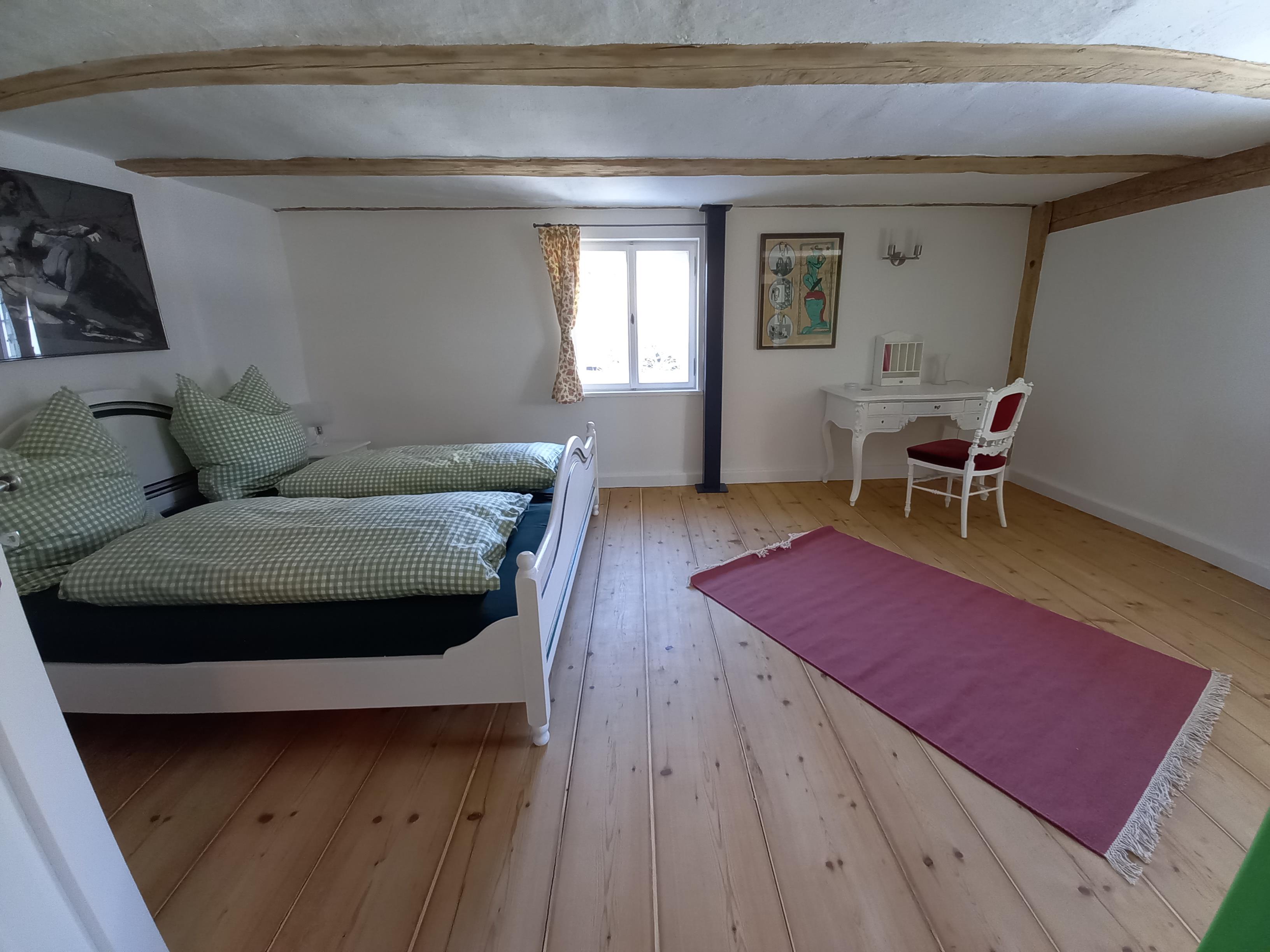 Die Ferienwohnung Rosarot liegt auf der Ostseite vom Hennalahaus, frisch renoviert verfügt sie im Erdgeschoß über ein originelles Wohnzimmer mit Sat-TV und Esstisch und eine voll ausgestattete Küche mit Backofen und Spülmaschine. Im ersten Stock befinden sich zwei Schlafzimmer, eines davon, das größere, mit Doppelbett, das kleinere mit zwei Einzelbetten. Im ersten Stock befindet sich auch das Badezimmer mit Dusche. Im ersten Stock beträgt die Deckenhöhe 2 Meter, da Sie sich in einem denkmalgeschützten Haus befinden, im Erdgeschoß ist die Deckenhöhe normal. Sie haben einen separaten Eingang, den nur Sie benutzen. Sie sind herzlich eingeladen, den Garten auf der Südseite des Hauses mitzubenutzen.
