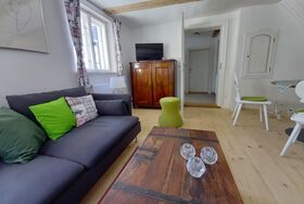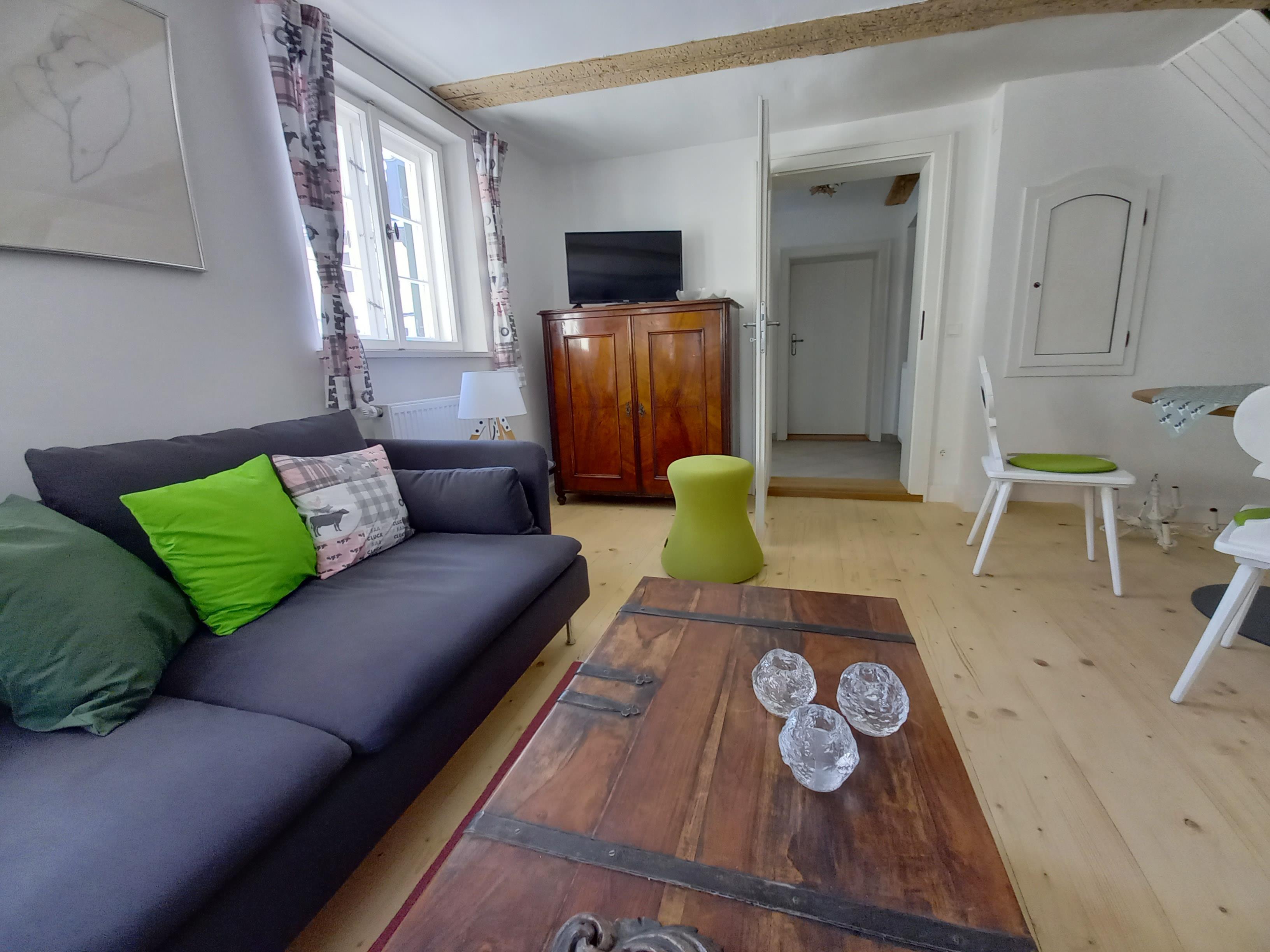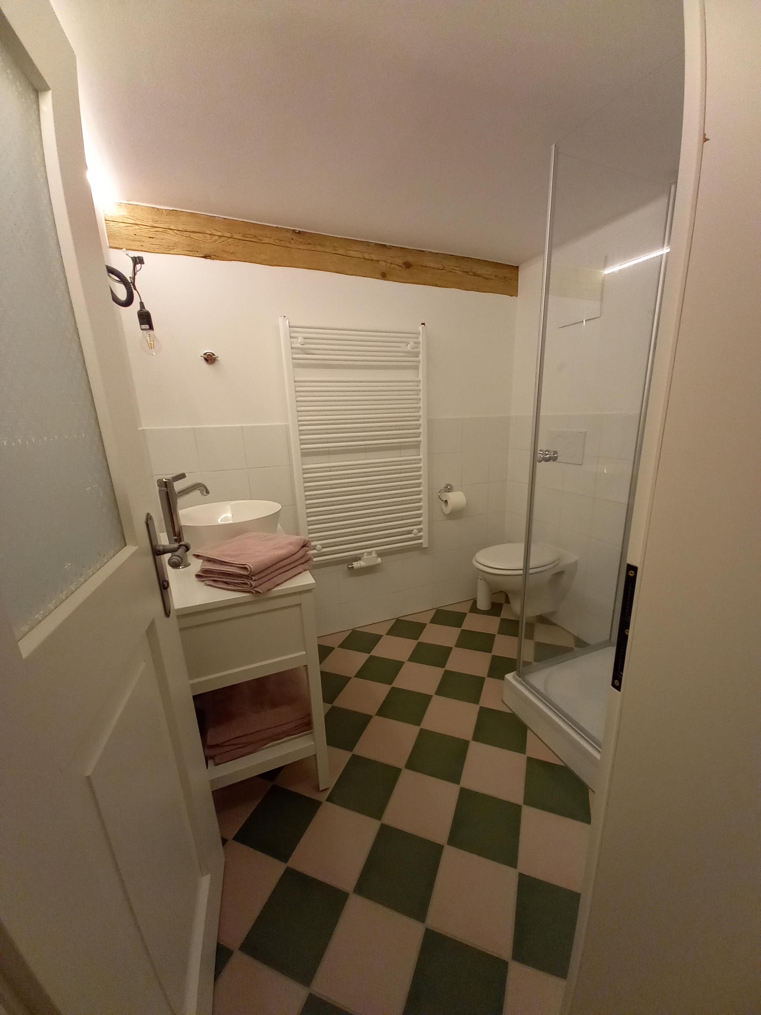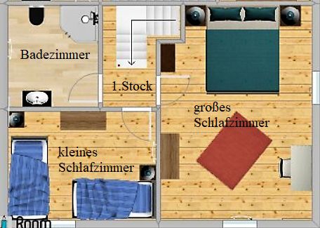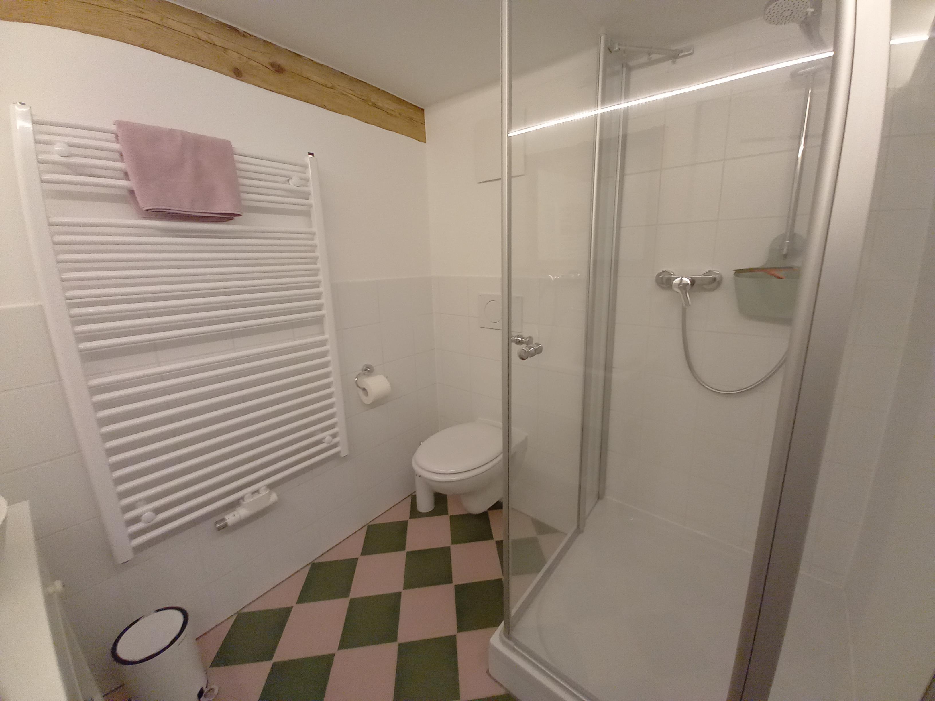 Die Ferienwohnung Rosarot liegt auf der Ostseite vom Hennalahaus, frisch renoviert verfügt sie im Erdgeschoß über ein originelles Wohnzimmer mit Sat-TV und Esstisch und eine voll ausgestattete Küche mit Backofen und Spülmaschine. Im ersten Stock befinden sich zwei Schlafzimmer, eines davon, das größere, mit Doppelbett, das kleinere mit zwei Einzelbetten. Im ersten Stock befindet sich auch das Badezimmer mit Dusche. Im ersten Stock beträgt die Deckenhöhe 2 Meter, da Sie sich in einem denkmalgeschützten Haus befinden, im Erdgeschoß ist die Deckenhöhe normal. Sie haben einen separaten Eingang, den nur Sie benutzen. Sie sind herzlich eingeladen, den Garten auf der Südseite des Hauses mitzubenutzen.