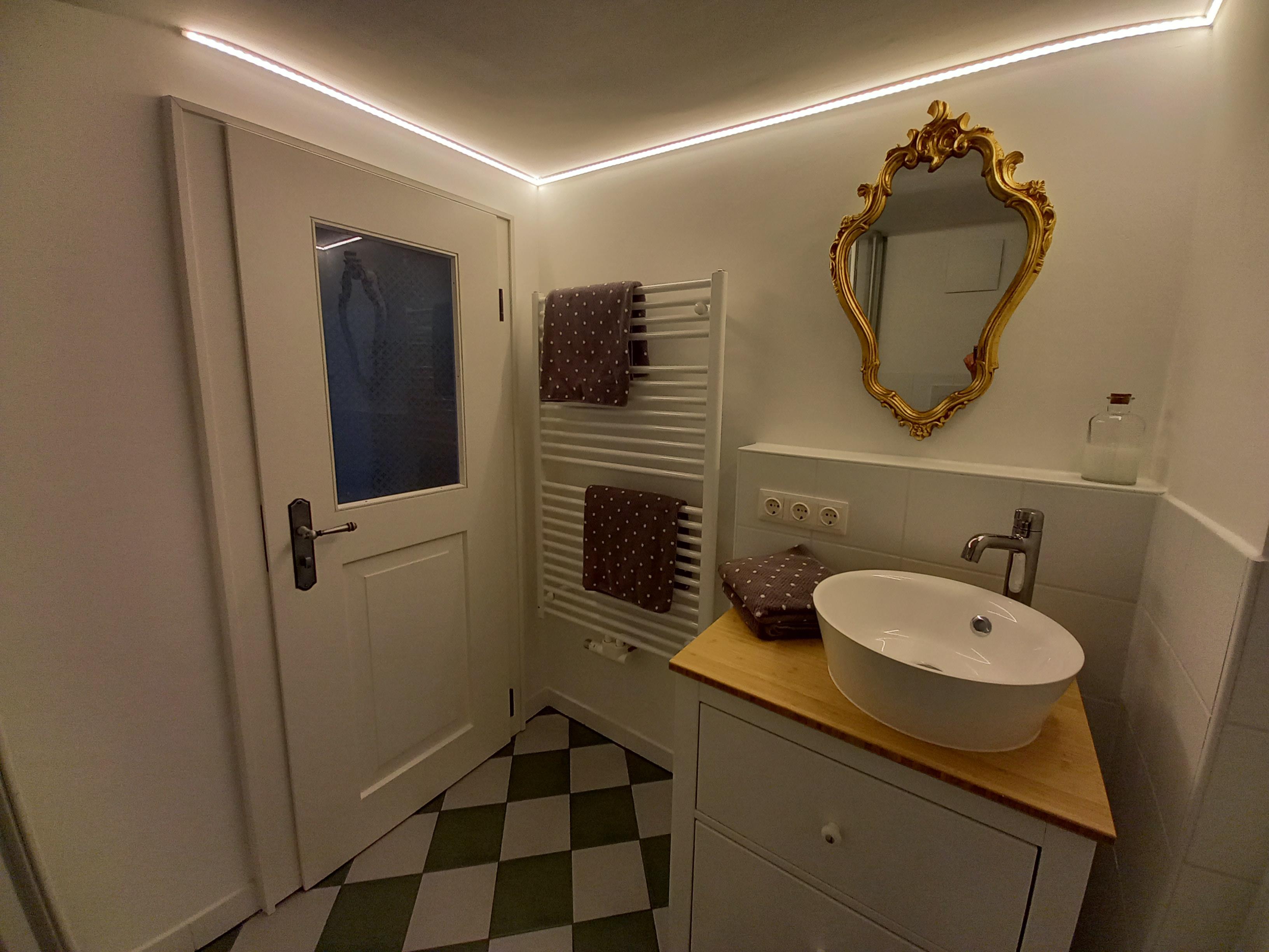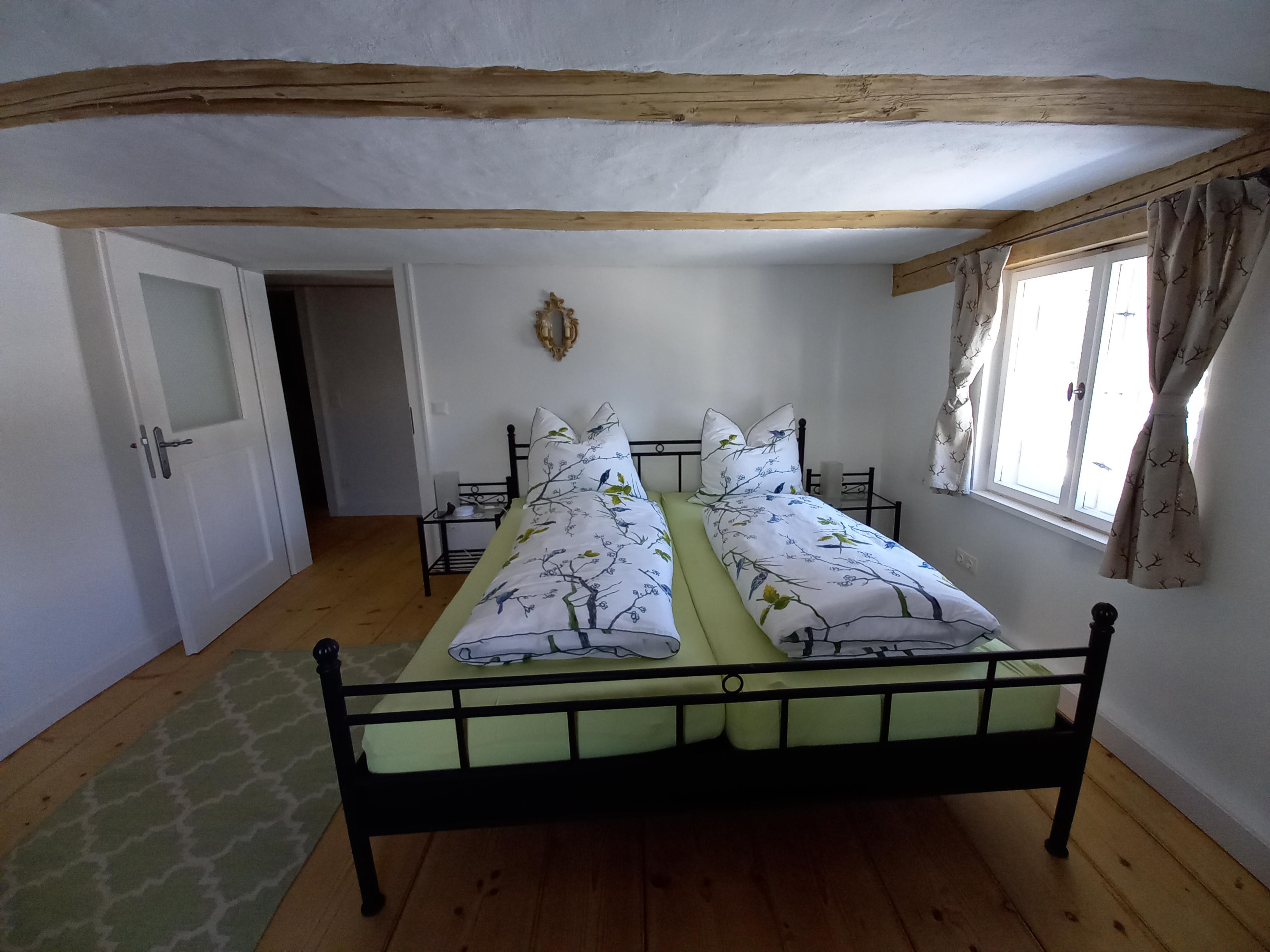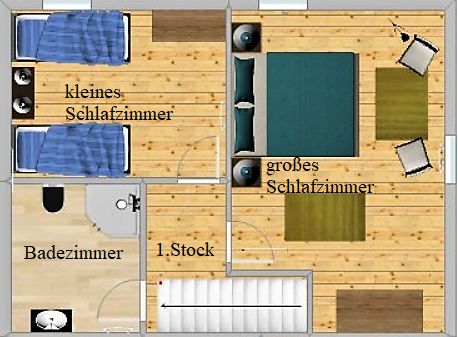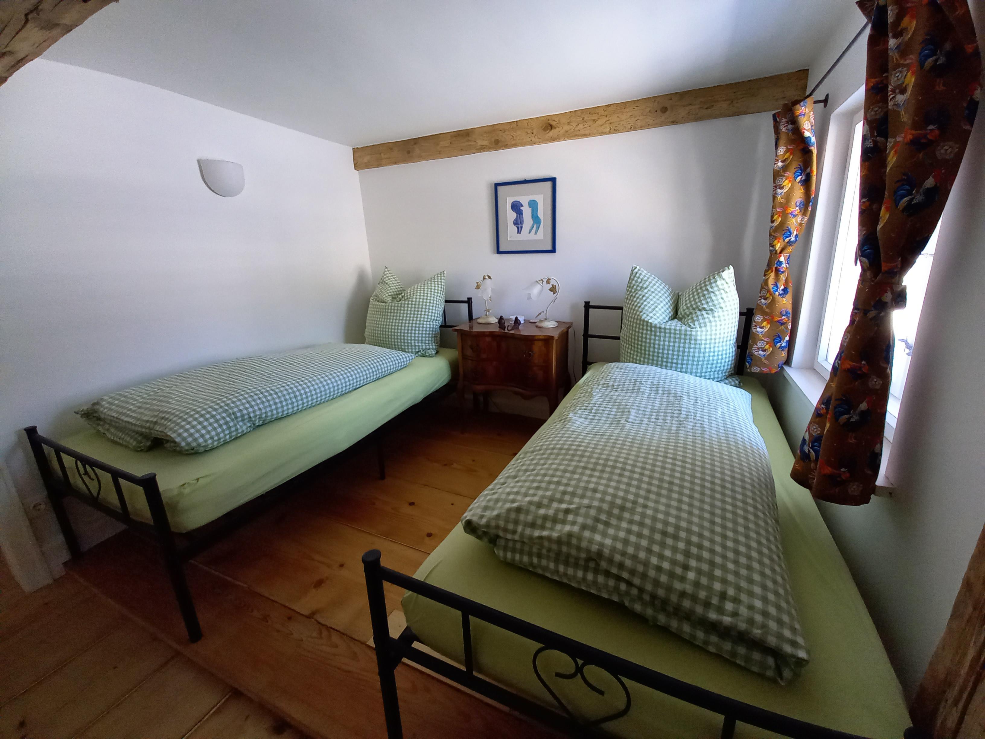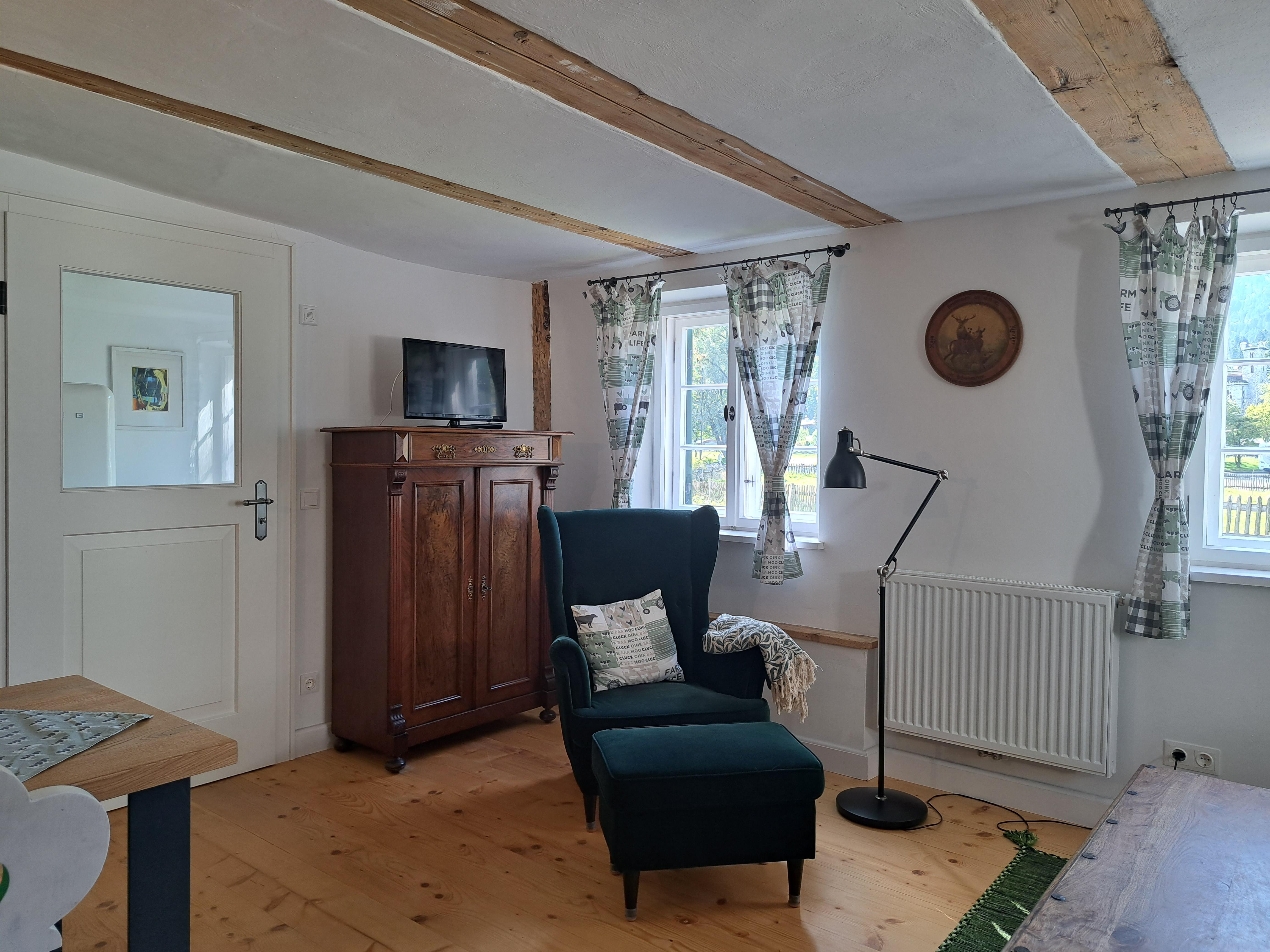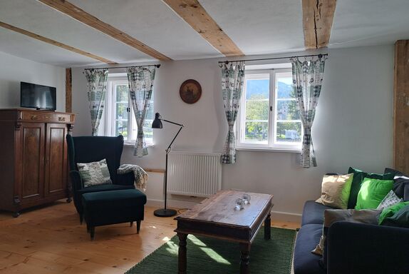 Die Ferienwohnung Waldgrün liegt auf der Westseite vom Hennalahaus, frisch renoviert verfügt sie im Erdgeschoß über ein originelles Wohnzimmer mit Sat-TV und Esstisch und eine voll ausgestattete Küche mit Backofen und Spülmaschine. Im ersten Stock befinden sich zwei Schlafzimmer, eines davon, das größere, mit Doppelbett, das kleinere mit zwei Einzelbetten. Im ersten Stock befindet sich auch das Badezimmer mit Dusche. Im ersten Stock beträgt die Deckenhöhe 2 Meter, da Sie sich in einem denkmalgeschützten Haus befinden, im Erdgeschoß ist die Deckenhöhe normal. Sie haben einen separaten Eingang, den nur Sie benutzen und einen eigenen Garten.
