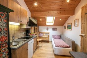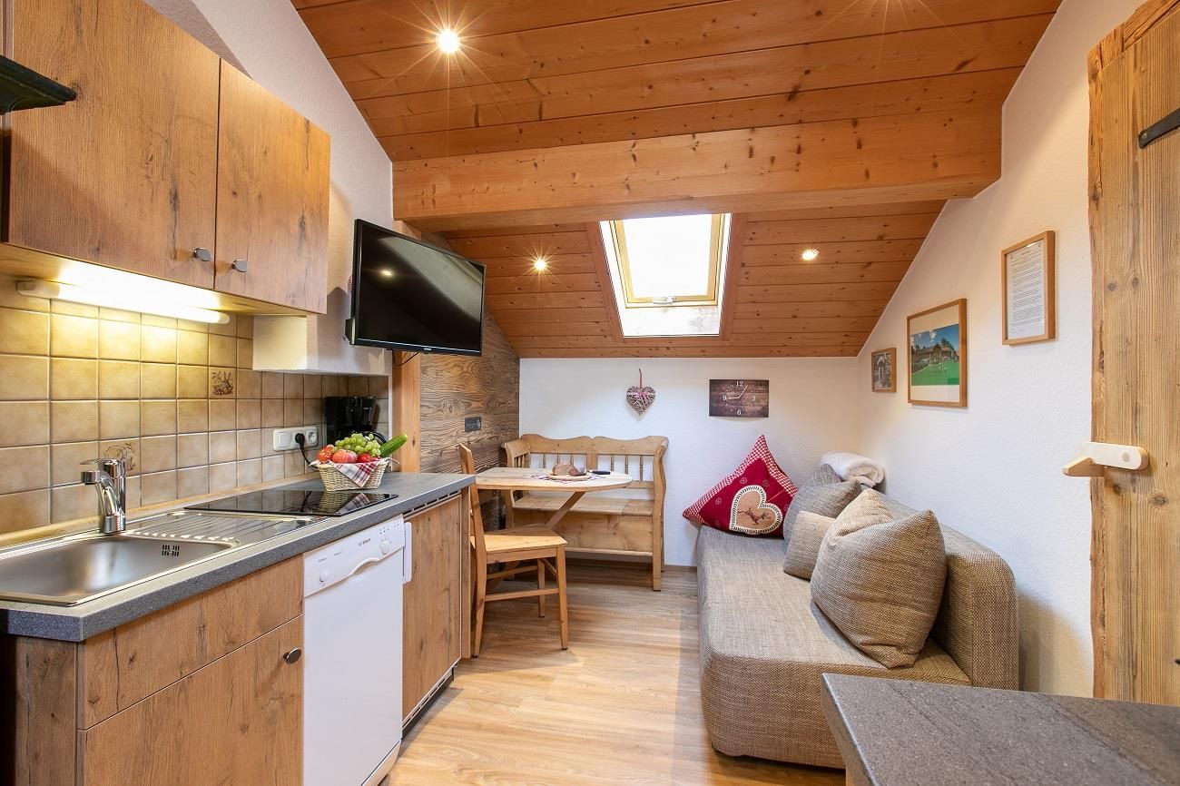 In unserem Stüberl finden Sie alles, was Sie brauchen: Romantisches Doppelbett, Couch, Essecke, Küchenzeile mit Kühlschrank und Spülmaschine, Fernseher und und Dusche/WC.